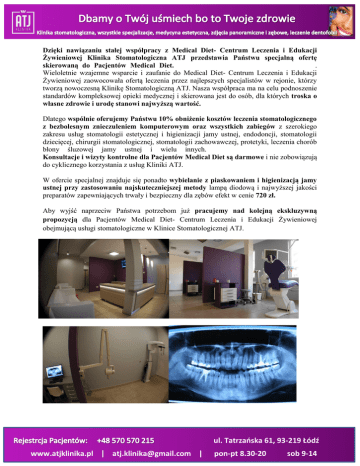 Dzięki nawiązaniu stałej współpracy z Medical Diet- Centrum Leczenia i Edukacji Żywieniowej Klinika Stomatologiczna ATJ przedstawia Państwu specjalną ofertę skierowaną do Pacjentów Medical Diet. . Wieloletnie wzajemne wsparcie i zaufanie do Medical Diet- Centrum Leczenia i Edukacji Żywieniowej zaowocowała ofertą leczenia przez najlepszych specjalistów w rejonie, którzy tworzą nowoczesną Klinikę Stomatologiczną ATJ. Nasza współpraca ma na celu podnoszenie standardów kompleksowej opieki medycznej i skierowana jest do osób, dla których troska o własne zdrowie i urodę stanowi najwyższą wartość. Dlatego wspólnie oferujemy Państwu 10% obniżenie kosztów leczenia stomatologicznego z bezbolesnym znieczuleniem komputerowym oraz wszystkich zabiegów z szerokiego zakresu usług stomatologii estetycznej i higienizacji jamy ustnej, endodoncji, stomatologii dziecięcej, chirurgii stomatologicznej, stomatologii zachowawczej, protetyki, leczenia chorób błony śluzowej jamy ustnej i wielu innych. . Konsultacje i wizyty kontrolne dla Pacjentów Medical Diet są darmowe i nie zobowiązują do cyklicznego korzystania z usług Kliniki ATJ. W ofercie specjalnej znajduje się ponadto wybielanie z piaskowaniem i higienizacją jamy ustnej przy zastosowaniu najskuteczniejszej metody lampą diodową i najwyższej jakości preparatów zapewniających trwały i bezpieczny dla zębów efekt w cenie 720 zł. Aby wyjść naprzeciw Państwa potrzebom już pracujemy nad kolejną ekskluzywną propozycją dla Pacjentów Medical Diet- Centrum Leczenia i Edukacji Żywieniowej obejmującą usługi stomatologiczne w Klinice Stomatologicznej ATJ. ul. Tatrzańska 61, 93-219 Łódź www.atjklinika.pl [email protected] | pon-pt 8.30-20 sob 9-14