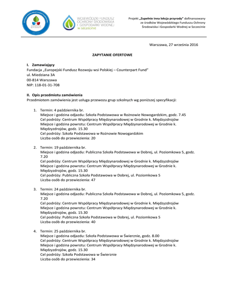 Projekt „Zupełnie inna lekcja przyrody” dofinansowany ze środków Wojewódzkiego Funduszu Ochrony Środowiska i Gospodarki Wodnej w Szczecinie Warszawa, 27 września 2016 ZAPYTANIE OFERTOWE I. Zamawiający Fundacja „Europejski Fundusz Rozwoju wsi Polskiej – Counterpart Fund” ul. Miedziana 3A 00-814 Warszawa NIP: 118-01-31-708 II. Opis przedmiotu zamówienia Przedmiotem zamówienia jest usługa przewozu grup szkolnych wg poniższej specyfikacji: 1. Termin: 4 października br. Miejsce i godzina odjazdu: Szkoła Podstawowa w Rożnowie Nowogardzkim, godz. 7.45 Cel podróży: Centrum Współpracy Międzynarodowej w Grodnie k. Międzyzdrojów Miejsce i godzina powrotu: Centrum Współpracy Międzynarodowej w Grodnie k. Międzyzdrojów, godz. 15.30 Cel podróży: Szkoła Podstawowa w Rożnowie Nowogardzkim Liczba osób do przewiezienia: 20 2. Termin: 19 października br. Miejsce i godzina odjazdu: Publiczna Szkoła Podstawowa w Dobrej, ul. Poziomkowa 5, godz. 7.20 Cel podróży: Centrum Współpracy Międzynarodowej w Grodnie k. Międzyzdrojów Miejsce i godzina powrotu: Centrum Współpracy Międzynarodowej w Grodnie k. Międzyzdrojów, godz. 15.30 Cel podróży: Publiczna Szkoła Podstawowa w Dobrej, ul. Poziomkowa 5 Liczba osób do przewiezienia: 47 3. Termin: 24 października br. Miejsce i godzina odjazdu: Publiczna Szkoła Podstawowa w Dobrej, ul. Poziomkowa 5, godz. 7.20 Cel podróży: Centrum Współpracy Międzynarodowej w Grodnie k. Międzyzdrojów Miejsce i godzina powrotu: Centrum Współpracy Międzynarodowej w Grodnie k. Międzyzdrojów, godz. 15.30 Cel podróży: Publiczna Szkoła Podstawowa w Dobrej, ul. Poziomkowa 5 Liczba osób do przewiezienia: 40 4. Termin: 25 października br. Miejsce i godzina odjazdu: Szkoła Podstawowa w Świerznie, godz. 8.00 Cel podróży: Centrum Współpracy Międzynarodowej w Grodnie k. Międzyzdrojów Miejsce i godzina powrotu: Centrum Współpracy Międzynarodowej w Grodnie k. Międzyzdrojów, godz. 15.30 Cel podróży: Szkoła Podstawowa w Świerznie Liczba osób do przewiezienia: 34 Projekt „Zupełnie inna lekcja przyrody” dofinansowany ze środków Wojewódzkiego Funduszu Ochrony Środowiska i Gospodarki Wodnej w Szczecinie 5. Termin: 26 października br. Miejsce i godzina odjazdu: Publiczna Szkoła Podstawowa w Dobrej, ul. Poziomkowa 5, godz. 7.20 Cel podróży: Centrum Współpracy Międzynarodowej w Grodnie k. Międzyzdrojów Miejsce i godzina powrotu: Centrum Współpracy Międzynarodowej w Grodnie k. Międzyzdrojów, godz. 15.30 Cel podróży: Publiczna Szkoła Podstawowa w Dobrej, ul. Poziomkowa 5 Liczba osób do przewiezienia: 34 6. Termin: 27 października br. Miejsce i godzina odjazdu: Szkoła Podstawowa w Wierzbięcinie, gm. Nowogard, godz. 7.45 Cel podróży: Centrum Współpracy Międzynarodowej w Grodnie k. Międzyzdrojów Miejsce i godzina powrotu: Centrum Współpracy Międzynarodowej w Grodnie k. Międzyzdrojów, godz. 15.30 Cel podróży: Szkoła Podstawowa w Wierzbięcinie, gm. Nowogard Liczba osób do przewiezienia: 20 III. Warunki płatności: przelew bankowy po wykonaniu usługi z 7-dniowym terminem płatności. IV. Warunki udziału w postępowaniu O udzielenie zamówienia ubiegać się podmioty, które znajdują się w sytuacji organizacyjnej, technicznej, ekonomicznej i finansowej zapewniającej wykonanie zamówienia. V. 1. 2. 3. 4. 5. Opis sposobu przygotowania oferty Ofertę należy przygotować na załączonym formularzu ofertowym. Każdy podmiot może złożyć jedną ofertę. Zamawiający dopuszcza możliwość składania ofert częściowych. Termin związania ofertą: 30 dni od terminu składania ofert. Oferent samodzielnie lub na wniosek zamawiającego może przedłużyć termin związania ofertą. VI. Miejsce oraz termin składania ofert Ofertę należy złożyć w terminie do 29 września br. do godz. 11.00 w formie elektronicznej przesyłając na adres mailowy: [email protected]. Decyduje data i godzina wpływu oferty do Fundacji. VII. Ocena ofert 1. Zamawiający dokona oceny ofert na podstawie następujących kryteriów: cena – 100%. 2. Oferowana cena powinna zawierać wszystkie koszty związane z realizacją zamówienia. 3. Ocena ofert zostanie przeprowadzona dla każdej usługi przewozu oddzielnie. 4. Za najkorzystniejszą zostanie uznana oferta z najniższą ceną dla danej usługi przewozu. 5. Zamawiający odrzuci ofertę, jeżeli: a) Jej treść nie odpowiada treści niniejszego zapytania ofertowego b) Jej złożenie stanowi czyn nieuczciwej konkurencji w rozumieniu przepisów o zwalczaniu nieuczciwej konkurencji c) Zawiera błędy w obliczeniu ceny, przy czym Zamawiający za zgodą Wykonawcy poprawi oczywiste omyłki rachunkowe. 6. Zamawiający zastrzega sobie prawo unieważnienia postępowania bez podania przyczyny.