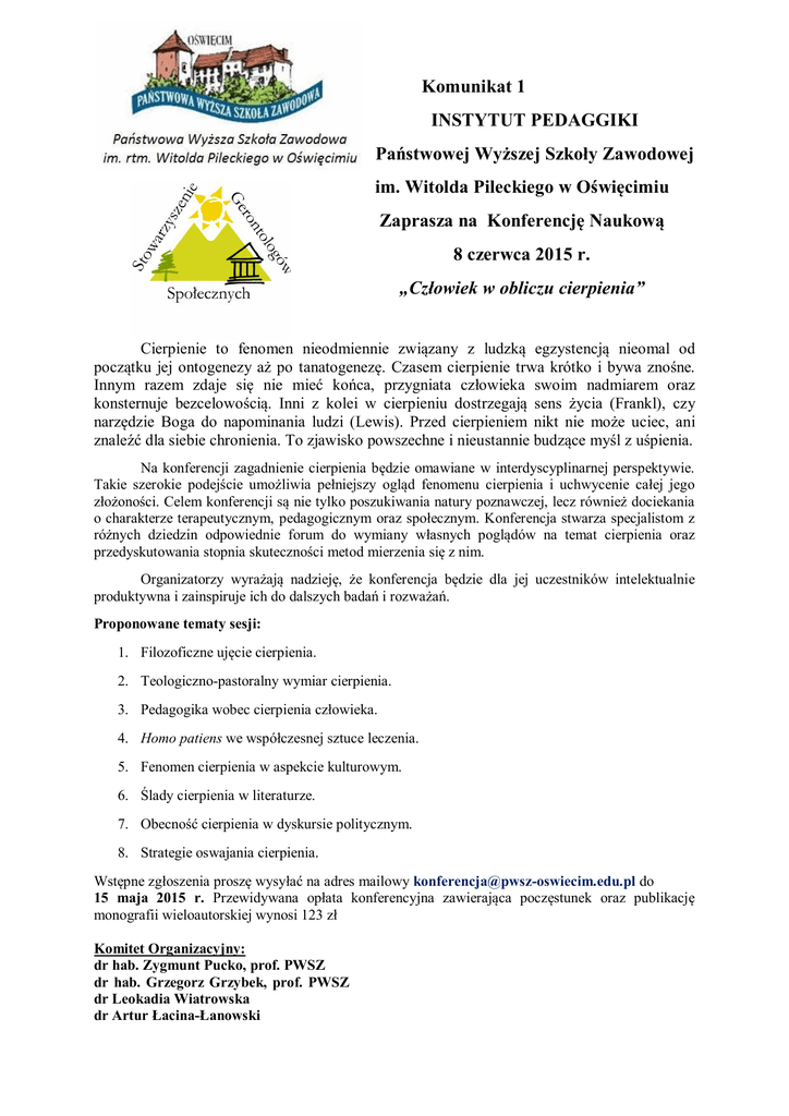 Komunikat 1 INSTYTUT PEDAGGIKI Państwowej Wyższej Szkoły Zawodowej im. Witolda Pileckiego w Oświęcimiu Zaprasza na Konferencję Naukową 8 czerwca 2015 r. „Człowiek w obliczu cierpienia” Cierpienie to fenomen nieodmiennie związany z ludzką egzystencją nieomal od początku jej ontogenezy aż po tanatogenezę. Czasem cierpienie trwa krótko i bywa znośne. Innym razem zdaje się nie mieć końca, przygniata człowieka swoim nadmiarem oraz konsternuje bezcelowością. Inni z kolei w cierpieniu dostrzegają sens życia (Frankl), czy narzędzie Boga do napominania ludzi (Lewis). Przed cierpieniem nikt nie może uciec, ani znaleźć dla siebie chronienia. To zjawisko powszechne i nieustannie budzące myśl z uśpienia. Na konferencji zagadnienie cierpienia będzie omawiane w interdyscyplinarnej perspektywie. Takie szerokie podejście umożliwia pełniejszy ogląd fenomenu cierpienia i uchwycenie całej jego złożoności. Celem konferencji są nie tylko poszukiwania natury poznawczej, lecz również dociekania o charakterze terapeutycznym, pedagogicznym oraz społecznym. Konferencja stwarza specjalistom z różnych dziedzin odpowiednie forum do wymiany własnych poglądów na temat cierpienia oraz przedyskutowania stopnia skuteczności metod mierzenia się z nim. Organizatorzy wyrażają nadzieję, że konferencja będzie dla jej uczestników intelektualnie produktywna i zainspiruje ich do dalszych badań i rozważań. Proponowane tematy sesji: 1. Filozoficzne ujęcie cierpienia. 2. Teologiczno-pastoralny wymiar cierpienia. 3. Pedagogika wobec cierpienia człowieka. 4. Homo patiens we współczesnej sztuce leczenia. 5. Fenomen cierpienia w aspekcie kulturowym. 6. Ślady cierpienia w literaturze. 7. Obecność cierpienia w dyskursie politycznym. 8. Strategie oswajania cierpienia. Wstępne zgłoszenia proszę wysyłać na adres mailowy [email protected] do 15 maja 2015 r. Przewidywana opłata konferencyjna zawierająca poczęstunek oraz publikację monografii wieloautorskiej wynosi 123 zł Komitet Organizacyjny: dr hab. Zygmunt Pucko, prof. PWSZ dr hab. Grzegorz Grzybek, prof. PWSZ dr Leokadia Wiatrowska dr Artur Łacina-Łanowski dr Artur Fabiś Gwarantujemy pomoc w organizacji noclegów. Następne szczegółowe informacje (wraz z kartą zgłoszenia) zostaną zainteresowanym przesłane w kolejnym komunikacie.