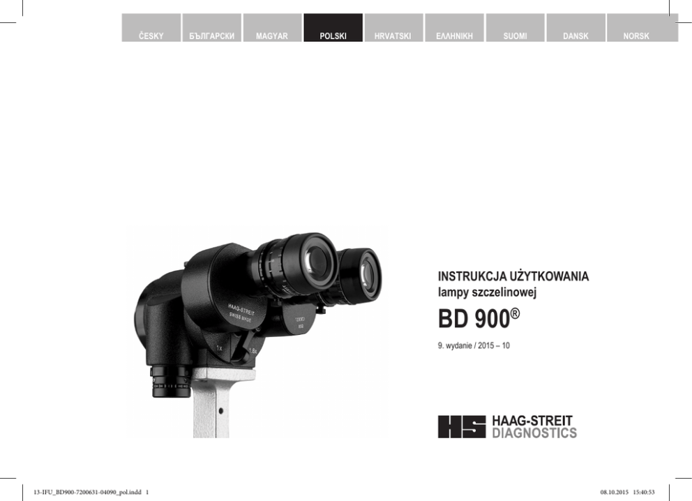 ČESKY БЪЛГАРСКИ MAGYAR POLSKI HRVATSKI ΕΛΛΗΝΙΚΗ SUOMI DANSK NORSK INSTRUKCJA UŻYTKOWANIA lampy szczelinowej BD 900® 9. wydanie / 2015 – 10 © HAAG-STREIT AG, 3098 Koeniz, Switzerland – HS-Doc. no. 1500.7200631.04090 – 9. Edition – 2015 – 10 13-IFU_BD900-7200631-04090_pol.indd 1 Nr dokumentu 1500 1500.1400209.04000 1 08.10.2015 15:40:53 NORSK DANSK SUOMI INSTRUKCJA UŻYTKOWANIA lampy szczelinowej BD 900® 9. wydanie / 2015 – 10 ΕΛΛΗΝΙΚΗ HRVATSKI POLSKI MAGYAR БЪЛГАРСКИ ČESKY Wstęp Dziękujemy za wybór urządzenia firmy HAAG-STREIT. Dokładne przestrzeganie zasad określonych w niniejszej instrukcji użytkowania zapewni niezawodne i bezproblemowe korzystanie z naszego produktu. Przeznaczenie Urządzenie jest lampą szczelinową ze stereomikroskopem, przeznaczoną do badania przedniego odcinka oka od rogówki do tylnej torebki soczewki. Jest używane w diagnostyce chorób i obrażeń, które dotyczą cech strukturalnych przedniego odcinka oka. Przeciwwskazania Nie są znane żadne bezwzględne przeciwwskazania dla badań z użyciem tego urządzenia. Należy kierować się profesjonalną oceną i ostrożnością. OSTRZEŻENIE! Przed rozpoczęciem użytkowania produktu uważnie przeczytać instrukcję użytkowania. Zawiera ona ważne informacje na temat bezpieczeństwa użytkownika i pacjenta. OSTRZEZENIE! To urzadzenie jest wyposazone w wysokim natężeniu światła. Nadmierne promieniowanie wobec pacjenta przyjmujacego okreslone leki w ramach terapii moze – z uwagi na zwiekszona fotowrazliwosc– spowodowac fototoksyczne działania uboczne. 2 13-IFU_BD900-7200631-04090_pol.indd 2 © HAAG-STREIT AG, 3098 Koeniz, Switzerland – HS-Doc. no. 1500.7200631.04090 – 9. Edition – 2015 – 10 08.10.2015 15:40:54 ČESKY БЪЛГАРСКИ MAGYAR POLSKI HRVATSKI ΕΛΛΗΝΙΚΗ SUOMI DANSK NORSK Spis treści 1. 1.1 1.2 1.3 1.4 1.5 1.5 1.7 1.8 1.9 2 2.1 3 3.1 3.2 3.2.1 3.2.2 3.2.3 Bezpieczeństwo ................................................................... 4 Zastosowania urządzenia........................................................................................4 Warunki otoczenia....................................................................................................4 Wysyłka i rozpakowywanie......................................................................................4 Ostrzeżenia dotyczące instalacji .............................................................................4 Obsługa, otoczenie..................................................................................................4 Szkodliwość światła.................................................................................................5 Dezynfekcja.............................................................................................................5 Gwarancja oraz odpowiedzialność cywilna producenta...........................................5 Symbole...................................................................................................................5 Wprowadzenie...................................................................... 6 Przegląd...................................................................................................................6 Montaż i instalacja urządzenia............................................ 7 Mikroskop i oświetlenie............................................................................................7 Zasilacz (oznaczenie typologiczne: LC-SLT)...........................................................7 Możliwe przyczyny błędów.......................................................................................7 Wymiana bezpiecznika obwodu pierwotnego..........................................................7 Wymiana bezpiecznika obwodu wtórnego...............................................................7 4 Używanie urządzenia............................................................ 7 5 Obsługa................................................................................. 8 6 Wyłączanie.......................................................................... 10 7 Dane techniczne ................................................................ 10 4.1 5.1 5.2 5.3 5.4 5.5 5.6 7.1 7.2 7.3 7.4 7.5 7.6 7.7 7.8 Włączanie urządzenia..............................................................................................7 8Konserwacja........................................................................11 8.1 8.2 8.3 8.4 8.5 Kontrola urządzeń..................................................................................................11 Serwisowanie.........................................................................................................12 Czyszczenie...........................................................................................................12 Wymiana zwierciadła oświetleniowego..................................................................12 Pokrowiec..............................................................................................................12 A. Dodatek............................................................................... 12 B. Przepisy prawa................................................................... 13 C. Klasyfikacja ........................................................................ 13 D. Utylizacja............................................................................. 13 E. Uwzględnione normy......................................................... 13 F. Wskazówka i deklaracja producenta dotycząca kompatybilności elektromagnetycznej (EMC)................. 14 A.1. F.1 F.2 F.3 F.4 F.5 Akcesoria i części zamienne..................................................................................12 Informacje ogólne..................................................................................................14 Emisje zakłóceń (tabela 1).