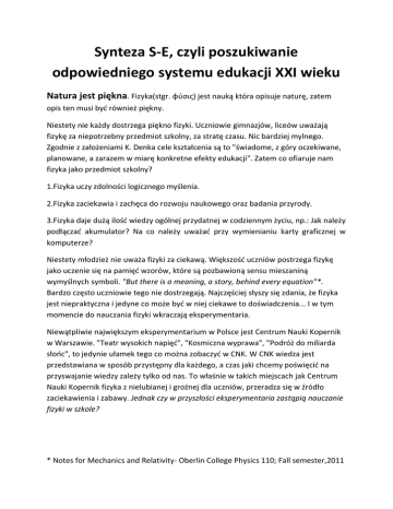 Synteza S-E, czyli poszukiwanie odpowiedniego systemu edukacji XXI wieku Natura jest piękna. Fizyka(stgr. φύσις) jest nauką która opisuje naturę, zatem opis ten musi być również piękny. Niestety nie każdy dostrzega piękno fizyki. Uczniowie gimnazjów, liceów uważają fizykę za niepotrzebny przedmiot szkolny, za stratę czasu. Nic bardziej mylnego. Zgodnie z założeniami K. Denka cele kształcenia są to "świadome, z góry oczekiwane, planowane, a zarazem w miarę konkretne efekty edukacji". Zatem co ofiaruje nam fizyka jako przedmiot szkolny? 1.Fizyka uczy zdolności logicznego myślenia. 2.Fizyka zaciekawia i zachęca do rozwoju naukowego oraz badania przyrody. 3.Fizyka daje dużą ilość wiedzy ogólnej przydatnej w codziennym życiu, np.: Jak należy podłączać akumulator? Na co należy uważać przy wymienianiu karty graficznej w komputerze? Niestety młodzież nie uważa fizyki za ciekawą. Większość uczniów postrzega fizykę jako uczenie się na pamięć wzorów, które są pozbawioną sensu mieszaniną wymyślnych symboli. "But there is a meaning, a story, behind every equation"*. Bardzo często uczniowie tego nie dostrzegają. Najczęściej słyszy się zdania, że fizyka jest niepraktyczna i jedyne co może być w niej ciekawe to doświadczenia... I w tym momencie do nauczania fizyki wkraczają eksperymentaria. Niewątpliwie największym eksperymentarium w Polsce jest Centrum Nauki Kopernik w Warszawie. "Teatr wysokich napięć", "Kosmiczna wyprawa", "Podróż do miliarda słońc", to jedynie ułamek tego co można zobaczyć w CNK. W CNK wiedza jest przedstawiana w sposób przystępny dla każdego, a czas jaki chcemy poświęcić na przyswajanie wiedzy zależy tylko od nas. To właśnie w takich miejscach jak Centrum Nauki Kopernik fizyka z nielubianej i groźnej dla uczniów, przeradza się w źródło zaciekawienia i zabawy. Jednak czy w przyszłości eksperymentaria zastąpią nauczanie fizyki w szkole? * Notes for Mechanics and Relativity- Oberlin College Physics 110; Fall semester,2011 Mamy XXI wiek. Wszystko dzieje się szybko. Szybko również chcemy się uczyć. Czy jest to możliwe? System edukacji ewoluuje. Czy eksperymentaria zastąpią miejsce szkoły w nauczaniu? Myślę, że nie. By dokładnie zrozumieć dane zagadnienie nie wystarczy, że dowiemy się jak coś działa. Myślę że równie ważne jest to, by odpowiedzieć na pytanie dlaczego to tak działa. Pobyt w np.: Centrum Nauki Kopernik, sam w sobie jest jedynie preludium do pracy, do dokładnego zrozumienia danej kwestii. Osobiście jestem zwolennikiem fizyki teoretycznej, mającym za oręż aparat matematyczny. Uważam, że prawdziwe piękno fizyki jest ukryte w złożonych równaniach matematycznych, które mogą się wydawać zawiłe, a jednak odznaczają się dokładnym uporządkowaniem. Fizyka w eksperymentariach taka nie jest. Eksperymentaria są ciekawe i zachęcają do samodzielnego badania przyrody, jednak same w sobie są według mnie niewystarczające. Przykładem tego jest kilka podstawowych wzorów w kinematyce. Przez długi czas myślałem, że wzory w kinematyce to wzory doświadczalne. Zmianę moich poglądów sprawił rachunek całkowy i różniczkowy. Czy to nie jest piękne, że za pomocą abstrakcyjnego aparatu matematyki wyższej potrafimy wyprowadzić tak podstawowy wzór? Eksperymentaria nie ukazują takiego piękna fizyki, co jest ich niewątpliwą wadą. Uważam zatem, że najlepiej by było gdyby zajęcia szkolne były połączone z eksperymentariami w olśniewający duet: teoria-praktyka, tj. synteza szkoły i eksperymentariów(synteza S-E), czyli połączenie zajęć szkolnych i eksperymentariów w jedną, znakomitą całość. W syntezie S-E część teoretyczna danego zagadnienia odbywałaby się w szkole, a część doświadczalna w eksperymentariach, dzięki czemu uczniowie od razu poznaliby, dane zagadnienie także od strony praktycznej . Czy jest to możliwe w przyszłości? Zdecydowanie tak. Wydaje mi się, że jest to możliwe nawet w niedalekiej przyszłości. Wtedy spełniłyby się słowa Alberta Einsteina, wynikające zapewne z jego przeżyć z przed pamiętnego Annus Mirabilis: "Das Lehren soll so sein, dass das Dargebotene als wertvolles Geschenk und nicht als saure Pflicht empfunden wird." Ogólnie rzecz biorąc eksperymentaria, takie jak Centrum Nauki Kopernik, są bardzo ważne w procesie kształcenia. Dzięki nim fizyka staje się ciekawa nawet dla tych, którzy uważali, że jest ona całkowicie niepotrzebna jako przedmiot szkolny. Jednakowoż eksperymentaria same w sobie nigdy nie zastąpią nauczania fizyki w szkole. Najlepszym rozwiązaniem problemu edukacji XXI wieku, moim zdaniem, jest duet teoria-praktyka, tj. synteza szkoły i eksperymentariów(synteza S-E). Przy zastosowaniu syntezy S-E fizyka stałaby się dla wszystkich nauką wyróżniającą się pięknem, subtelnością i wyrafinowaniem. Dominik Kufel Ogólnokształcąca Szkoła Muzyczna I i II stopnia im. Karola Lipińskiego w Lublinie Kl. III "A" gimnazjum Nauczyciele: Jolanta Augustyniak i Piotr Kononowicz