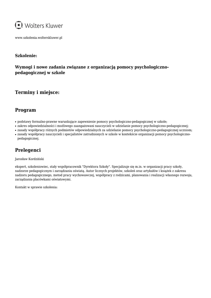 www.szkolenia.wolterskluwer.pl Szkolenie: Wymogi i nowe zadania związane z organizacją pomocy psychologicznopedagogicznej w szkole Terminy i miejsce: Program ● ● ● ● podstawy formalno-prawne warunkujące zapewnienie pomocy psychologiczno-pedagogicznej w szkole; zakres odpowiedzialności i możliwego zaangażowani nauczycieli w udzielanie pomocy psychologiczno-pedagogicznej; zasady współpracy różnych podmiotów odpowiedzialnych za udzielanie pomocy psychologiczno-pedagogicznej uczniom; zasady współpracy nauczycieli i specjalistów zatrudnionych w szkole w kontekście organizacji pomocy psychologicznopedagogicznej. Prelegenci Jarosław Kordziński ekspert, szkoleniowiec, stały współpracownik "Dyrektora Szkoły". Specjalizuje się m.in. w organizacji pracy szkoły, nadzorze pedagogicznym i zarządzaniu oświatą. Autor licznych projektów, szkoleń oraz artykułów i książek z zakresu nadzoru pedagogicznego, metod pracy wychowawczej, współpracy z rodzicami, planowania i realizacji własnego rozwoju, zarządzania placówkami oświatowymi. Kontakt w sprawie szkolenia: