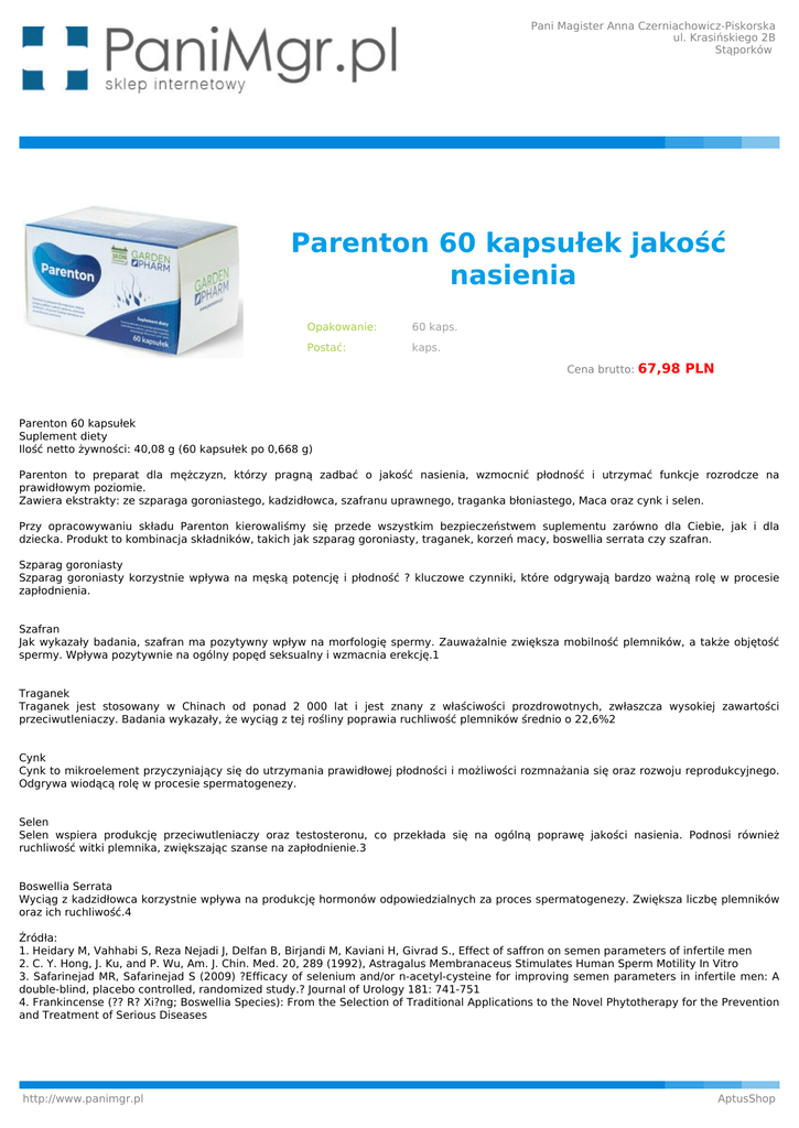 Pani Magister Anna Czerniachowicz-Piskorska ul. Krasińskiego 2B Stąporków Parenton 60 kapsułek jakość nasienia Opakowanie: 60 kaps. Postać: kaps. Cena brutto: 67,98 PLN Parenton 60 kapsułek Suplement diety Ilość netto żywności: 40,08 g (60 kapsułek po 0,668 g) Parenton to preparat dla mężczyzn, którzy pragną zadbać o jakość nasienia, wzmocnić płodność i utrzymać funkcje rozrodcze na prawidłowym poziomie. Zawiera ekstrakty: ze szparaga goroniastego, kadzidłowca, szafranu uprawnego, traganka błoniastego, Maca oraz cynk i selen. Przy opracowywaniu składu Parenton kierowaliśmy się przede wszystkim bezpieczeństwem suplementu zarówno dla Ciebie, jak i dla dziecka. Produkt to kombinacja składników, takich jak szparag goroniasty, traganek, korzeń macy, boswellia serrata czy szafran. Szparag goroniasty Szparag goroniasty korzystnie wpływa na męską potencję i płodność ? kluczowe czynniki, które odgrywają bardzo ważną rolę w procesie zapłodnienia. Szafran Jak wykazały badania, szafran ma pozytywny wpływ na morfologię spermy. Zauważalnie zwiększa mobilność plemników, a także objętość spermy. Wpływa pozytywnie na ogólny popęd seksualny i wzmacnia erekcję.1 Traganek Traganek jest stosowany w Chinach od ponad 2 000 lat i jest znany z właściwości prozdrowotnych, zwłaszcza wysokiej zawartości przeciwutleniaczy. Badania wykazały, że wyciąg z tej rośliny poprawia ruchliwość plemników średnio o 22,6%2 Cynk Cynk to mikroelement przyczyniający się do utrzymania prawidłowej płodności i możliwości rozmnażania się oraz rozwoju reprodukcyjnego. Odgrywa wiodącą rolę w procesie spermatogenezy. Selen Selen wspiera produkcję przeciwutleniaczy oraz testosteronu, co przekłada się na ogólną poprawę jakości nasienia. Podnosi również ruchliwość witki plemnika, zwiększając szanse na zapłodnienie.3 Boswellia Serrata Wyciąg z kadzidłowca korzystnie wpływa na produkcję hormonów odpowiedzialnych za proces spermatogenezy. Zwiększa liczbę plemników oraz ich ruchliwość.4 Źródła: 1. Heidary M, Vahhabi S, Reza Nejadi J, Delfan B, Birjandi M, Kaviani H, Givrad S., Effect of saffron on semen parameters of infertile men 2. C. Y. Hong, J. Ku, and P. Wu, Am. J. Chin. Med. 20, 289 (1992), Astragalus Membranaceus Stimulates Human Sperm Motility In Vitro 3. Safarinejad MR, Safarinejad S (2009) ?Efficacy of selenium and/or n-acetyl-cysteine for improving semen parameters in infertile men: A double-blind, placebo controlled, randomized study.? Journal of Urology 181: 741-751 4. Frankincense (?? R? Xi?ng; Boswellia Species): From the Selection of Traditional Applications to the Novel Phytotherapy for the Prevention and Treatment of Serious Diseases http://www.panimgr.pl AptusShop Pani Magister Anna Czerniachowicz-Piskorska ul. Krasińskiego 2B Stąporków Zalecana dzienna porcja: 2 kapsułki dziennie po posiłku, popić wystarczającą ilością wody. Skład zalecanej porcji dziennej (2 kaps.): Substancja aktywnaIlość w 2 kaps.% RWS* Ekstrakt z korzenia szparaga goroniastego (Asparagus racemosus /Shatavari/)260 mg Ekstrakt z korzenia Maca (Lepidium meyenii)200 mgEkstrakt z korzenia traganka błoniastego (Astragalus membranaceus Bunge)150 mg L-karnityna102 mgEkstrakt z żywicy kadzidłowca (Boswelia serrata)50 mg w tym kwasu bosweliowego30 mgEkstrakt z kwiatów i łodygi szafranu uprawnego (Crocus sativus L.)28 mg Cynk10 mg100%* Selen55 ?g100%* *Referencyjna Wartość Spożycia Składniki: Ekstrakt z korzenia szparaga goroniastego (Asparagus racemosus /Shatavari/) DER: 4:1; żelatyna wołowa; ekstrakt z korzenia Maca (Lepidium meyenii) DER: 4:1; ekstrakt z korzenia traganka błoniastego (Astragalus membranaceus Bunge) DER: 4:1; winian L-karnityny; substancja wypełniająca: celuloza mikrokrystaliczna; glukonian cynku; ekstrakt z żywicy kadzidłowca (Boswellia serrata) DER: 6:1 zawartość kwasu bosweliowego: 60%; substancja przeciwzbrylająca: sole magnezowe kwasów tłuszczowych, ekstrakt z kwiatu i pręcika szafranu uprawnego /krokusa uprawnego/ (Crocus sativus L.) DER: 4:1; substancja przeciwzbrylająca: dwutlenek krzemu; selenian (VI) sodu; barwniki: dwutlenek tytanu, błękit brylantowy. Działanie: Parenton zawiera składniki, które mają pozytywny wpływ na poziom męskiej płodności i funkcje rozrodcze. Szparag goroniasty korzystnie wpływa na męską potencję i płodność. Maca pozwala zachować naturalną aktywność seksualną. Traganek błoniasty stymuluje ruchliwość plemników. Cynk pomaga w utrzymaniu prawidłowej płodności i funkcji rozrodczych. Kadzidłowiec ma pozytywny wpływ na męskie zdrowie seksualne. Szafran uprawny podnosi libido, wzmacnia erekcję i przyczynia się do zwiększenia produkcji spermy. Selen przyczynia się do właściwego przebiegu spermatogenezy. Uwagi dodatkowe: Nie należy przekraczać zalecanej dziennej porcji do spożycia w ciągu dnia. Suplementy diety nie mogą być stosowane jako substytut (zamiennik) zróżnicowanej diety. Zalecany jest zróżnicowany sposób żywienia oraz zdrowy tryb życia. Nie stosować przy nadwrażliwości na jakikolwiek składnik preparatu. Ze względu na obecność szafranu nie stosować u osób z zaburzeniami krzepnięcia krwi. Produkt nie powinien być zażywany przez kobiety w ciąży i karmiące oraz osoby poniżej 18 roku życia. Warunki przechowywania: Przechowywać w temperaturze pokojowej w szczelnie zamkniętym opakowaniu. Przechowywać w miejscu niedostępnym dla małych dzieci. http://www.panimgr.pl AptusShop
