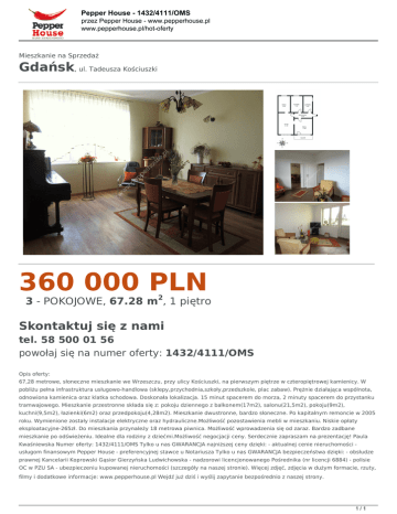 Pepper House - 1432/4111/OMS przez Pepper House - www.pepperhouse.pl www.pepperhouse.pl/hot-oferty Mieszkanie na Sprzedaż Gdańsk, ul. Tadeusza Kościuszki 360 000 PLN 3 - POKOJOWE, 67.28 m2, 1 piętro Skontaktuj się z nami tel. 58 500 01 56 powołaj się na numer oferty: 1432/4111/OMS Opis oferty: 67,28 metrowe, słoneczne mieszkanie we Wrzeszczu, przy ulicy Kościuszki, na pierwszym piętrze w czteropiętrowej kamienicy. W pobliżu pełna infrastruktura usługowo-handlowa (sklepy,przychodnia,szkoły,przedszkole, plac zabaw). Prężnie działająca wspólnota, odnowiona kamienica oraz klatka schodowa. Doskonała lokalizacja. 15 minut spacerem do morza, 2 minuty spacerem do przystanku tramwajowego. Mieszkanie przestronne składa się z: pokoju dziennego z balkonem(17m2), salonu(21,5m2), pokoju(9m2), kuchni(9,5m2), łazienki(6m2) oraz przedpokoju(4,28m2). Mieszkanie dwustronne, bardzo słoneczne. Po kapitalnym remoncie w 2005 roku. Wymienione zostały instalacje elektryczne oraz hydrauliczne.Możliwość pozostawienia mebli w mieszkaniu. Niskie opłaty eksploatacyjne-265zł. Do mieszkania przynależy 18 metrowa piwnica. Możliwość wprowadzenia się od zaraz. Bardzo zadbane mieszkanie po odświeżeniu. Idealne dla rodziny z dziećmi.Możliwość negocjacji ceny. Serdecznie zapraszam na prezentację! Paula Kwaśniewska Numer oferty: 1432/4111/OMS Tylko u nas GWARANCJA najniższej ceny dzięki: - aktualnej cenie nieruchomości usługom finansowym Pepper House - preferencyjnej stawce u Notariusza Tylko u nas GWARANCJA bezpieczeństwa dzięki: - obsłudze prawnej Kancelarii Koprowski Gąsior Gierzyńska Ludwichowska - nadzorowi licencjonowanego Pośrednika (nr licencji 6884) - polisie OC w PZU SA - ubezpieczeniu kupowanej nieruchomości (szczegóły na naszej stronie). Więcej zdjęć, zdjęcia w dużym formacie, rzuty, filmy i dodatkowe informacje: www.pepperhouse.pl Wejdź już dziś i wyślij zapytanie bezpośrednio z naszej strony. 1/1 Powered by TCPDF (www.tcpdf.org)