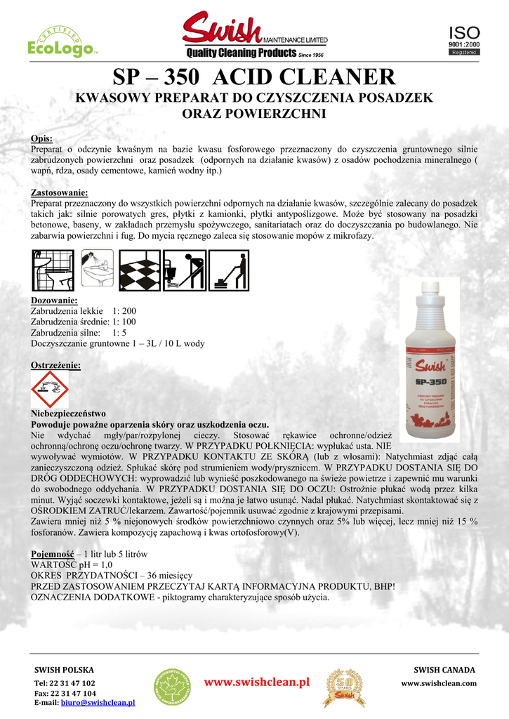 SP – 350 ACID CLEANER KWASOWY PREPARAT DO CZYSZCZENIA POSADZEK ORAZ POWIERZCHNI Opis: Preparat o odczynie kwaśnym na bazie kwasu fosforowego przeznaczony do czyszczenia gruntownego silnie zabrudzonych powierzchni oraz posadzek (odpornych na działanie kwasów) z osadów pochodzenia mineralnego ( wapń, rdza, osady cementowe, kamień wodny itp.) Zastosowanie: Preparat przeznaczony do wszystkich powierzchni odpornych na działanie kwasów, szczególnie zalecany do posadzek takich jak: silnie porowatych gres, płytki z kamionki, płytki antypoślizgowe. Może być stosowany na posadzki betonowe, baseny, w zakładach przemysłu spożywczego, sanitariatach oraz do doczyszczania po budowlanego. Nie zabarwia powierzchni i fug. Do mycia ręcznego zaleca się stosowanie mopów z mikrofazy. Dozowanie: Zabrudzenia lekkie 1: 200 Zabrudzenia średnie: 1: 100 Zabrudzenia silne: 1: 5 Doczyszczanie gruntowne 1 – 3L / 10 L wody Ostrzeżenie: Niebezpieczeństwo Powoduje poważne oparzenia skóry oraz uszkodzenia oczu. Nie wdychać mgły/par/rozpylonej cieczy. Stosować rękawice ochronne/odzież ochronną/ochronę oczu/ochronę twarzy. W PRZYPADKU POŁKNIĘCIA: wypłukać usta. NIE wywoływać wymiotów. W PRZYPADKU KONTAKTU ZE SKÓRĄ (lub z włosami): Natychmiast zdjąć całą zanieczyszczoną odzież. Spłukać skórę pod strumieniem wody/prysznicem. W PRZYPADKU DOSTANIA SIĘ DO DRÓG ODDECHOWYCH: wyprowadzić lub wynieść poszkodowanego na świeże powietrze i zapewnić mu warunki do swobodnego oddychania. W PRZYPADKU DOSTANIA SIĘ DO OCZU: Ostrożnie płukać wodą przez kilka minut. Wyjąć soczewki kontaktowe, jeżeli są i można je łatwo usunąć. Nadal płukać. Natychmiast skontaktować się z OŚRODKIEM ZATRUĆ/lekarzem. Zawartość/pojemnik usuwać zgodnie z krajowymi przepisami. Zawiera mniej niż 5 % niejonowych środków powierzchniowo czynnych oraz 5% lub więcej, lecz mniej niż 15 % fosforanów. Zawiera kompozycję zapachową i kwas ortofosforowy(V). Pojemność – 1 litr lub 5 litrów WARTOŚĆ pH = 1,0 OKRES PRZYDATNOŚCI – 36 miesięcy PRZED ZASTOSOWANIEM PRZECZYTAJ KARTĄ INFORMACYJNA PRODUKTU, BHP! OZNACZENIA DODATKOWE - piktogramy charakteryzujące sposób użycia. SWISH POLSKA Tel: 22 31 47 102 Fax: 22 31 47 104 E-mail: [email protected] www.swishclean.pl SWISH CANADA www.swishclean.com