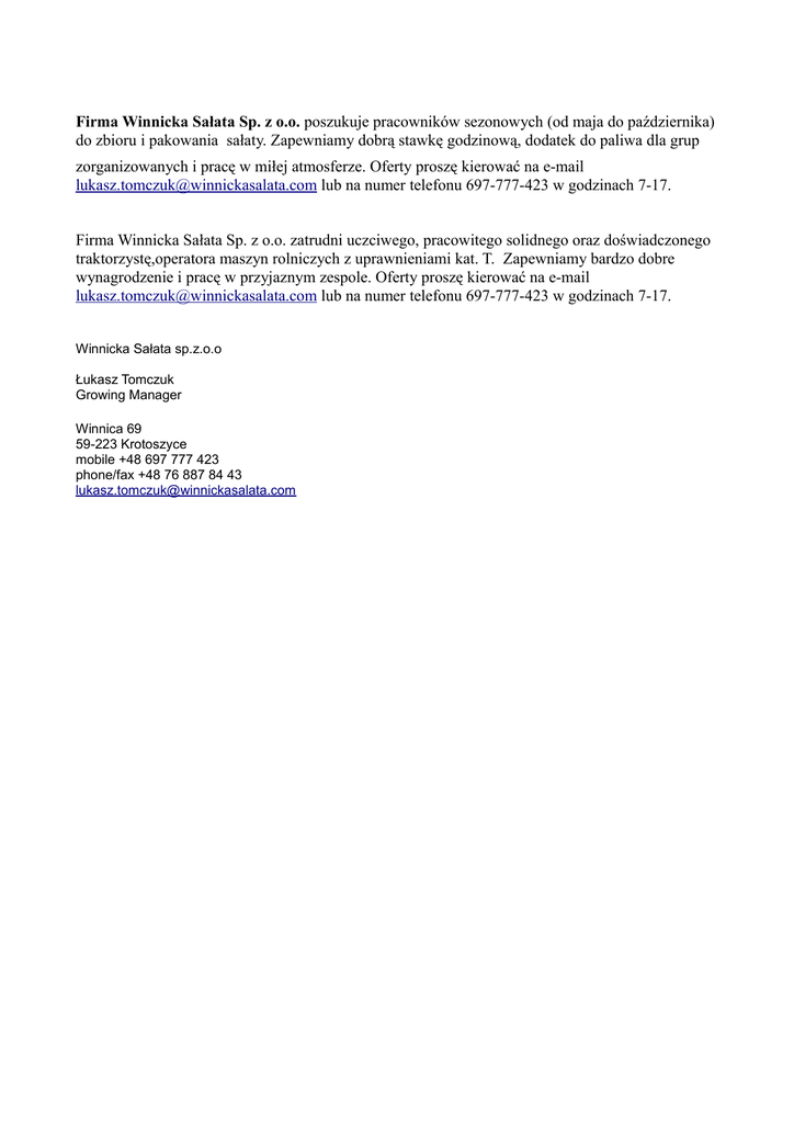 Firma Winnicka Sałata Sp. z o.o. poszukuje pracowników sezonowych (od maja do października) do zbioru i pakowania sałaty. Zapewniamy dobrą stawkę godzinową, dodatek do paliwa dla grup zorganizowanych i pracę w miłej atmosferze. Oferty proszę kierować na e-mail [email protected] lub na numer telefonu 697-777-423 w godzinach 7-17. Firma Winnicka Sałata Sp. z o.o. zatrudni uczciwego, pracowitego solidnego oraz doświadczonego traktorzystę,operatora maszyn rolniczych z uprawnieniami kat. T. Zapewniamy bardzo dobre wynagrodzenie i pracę w przyjaznym zespole. Oferty proszę kierować na e-mail [email protected] lub na numer telefonu 697-777-423 w godzinach 7-17. Winnicka Sałata sp.z.o.o Łukasz Tomczuk Growing Manager Winnica 69 59-223 Krotoszyce mobile +48 697 777 423 phone/fax +48 76 887 84 43 [email protected]