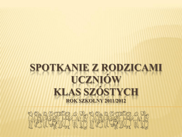SPOTKANIE Z RODZICAMI UCZNIÓW KLAS SZÓSTYCH ROK SZKOLNY 2011/2012 REFORMA OŚWIATY Nowe przedmioty: drugi język obcy obowiązkowo, edukacja dla bezpieczeństwa, zajęcia artystyczne i zajęcia techniczne. Nowe podręczniki, nowe podstawy programowe PRZEDMIOTY – NOWI ZNAJOMI Szkoła podstawowa Gimnazjum biologia PRZYRODA chemia geografia fizyka Zajęcia artystyczne Edukacja dla bezpieczeństwa STARZY PRZYJACIELE Język polski Historia Religia Muzyka Plastyka Matematyka Informatyka Technika Wychowanie fizyczne CO DWA, TO NIE JEDEN… Język angielski Język niemiecki 4 KLASY PIERWSZE Obecnie w każdej klasie będą uczniowie z różnych szkół podstawowych (uniknięcie konfliktów, próba większego zintegrowania, w miarę równa ilość uczniów w klasie i podobna ilość dziewcząt i chłopców), NIE MA w naszej szkole PROFILI, Programy nauczania są w każdej klasie takie same, treści nauczania, wymagania również. OFERUJEMY: Opiekę pedagogów Zajęcia dodatkowe dla uczniów mających trudności w nauce Zajęcia dodatkowe dla uczniów pragnących poszerzać swoją wiedzę Zajęcia w różnorodnych kołach zainteresowań Udział w różnego typu projektach – rządowych, unijnych Dobrze wyposażone, estetyczne sale lekcyjne Nowoczesną salę gimnastyczną Nowoczesną bibliotekę Centrum multimedialne ze stałym dostępem do Internetu Stołówkę Świetlicę Sklepik szkolny Bezpłatny dowóz uczniów z rejonu naszego gimnazjum DODATKOWE WARUNKI MAJĄCE WPŁYW NA UKOŃCZENIE GIMNAZJUM Przystąpienie do egzaminu gimnazjalnego. Uczestnictwo w projekcie edukacyjnym. Pozytywna ocena zachowania. EGZAMIN GIMNAZJALNY w trzech częściach: część humanistyczna, część matematyczno-przyrodnicza, język obcy (poziom podstawowy, poziom rozszerzony). Motywowanie własnych dzieci do nauki. Wzrastają progi punktowe w dobrych szkołach średnich. STRÓJ SZKOLNY: Uczniowie zobowiązani są do: 1) noszenia czystego, jednolitego stroju; a)jednolity, gładki podkoszulek, bluzka, sweterek, itp. w kolorze białym, niebieskim, granatowym, popielatym, brązowym, czarnym, b)spódnica/spodnie w ciemnym, jednolitym kolorze (ewentualnie białym lub niebieskim), c)zmiany obuwia na tekstylne (trampki, tenisówki lub halówki na białej/kremowej podeszwie). 2) podczas uroczystości obowiązuje strój galowy; a) dziewczęta szkolnych – biała bluzka, ciemna spódnica lub spodnie, ciemny żakiet lub sweter, b) chłopcy – biała koszula, ciemne spodnie, ciemna marynarka lub sweter. na zajęciach wychowania fizycznego uczniów obowiązuje strój sportowy: -gładka koszulka T-shirt w kolorze czerwonym lub popielatym, -spodenki sportowe lub dresy granatowe lub czarne, -obuwie sportowe (podczas zajęć na boisku szkolnym 3) uczniowie zobowiązani są do zmiany obuwia). ZESZYT DO KORESPONDENCJI Z RODZICAMI Każde zwolnienie lub wcześniejszy powrót do domu „na własną rękę” możliwe jest na podstawie pisemnej prośby (zgody) rodziców/prawnych opiekunów wpisanej w zeszycie do korespondencji. Uczeń zobowiązany jest do okazania usprawiedliwienia nieobecności w terminie do 7 dni po przyjściu do szkoły. Respektuje się zwolnienia lekarskie oraz usprawiedliwienie rodzica lub opiekuna w zeszycie do korespondencji z podaniem przyczyny. STATUT SZKOŁY Zakaz używania na terenie szkoły telefonów komórkowych. Zakaz farbowania włosów, malowania się, noszenia znaków klubowych, niestosownych napisów, kolczyków w nosie, brwiach, wargach, brodzie, itp. Zabrania się wnoszenia na teren szkoły: papierosów, alkoholu, narkotyków i innych używek oraz niebezpiecznych przedmiotów i substancji łatwopalnych, zwierząt, szalików i symboli klubowych, itp. Zakaz opuszczania szkoły i samodzielnego powrotu do domu – pisemna zgoda Rodziców, umieszczona w Zeszycie do korespondencji. Uczniowie odpowiadają materialnie za zniszczenia dokonane z premedytacją np. zamierzone uderzenie, kopnięcie itp. W razie dokonania rozmyślnych i udowodnionych zniszczeń – rodzice/prawni opiekunowie ucznia lub grupy uczniów ponoszą odpowiedzialność materialną, tzn. pokrywają koszty napraw, zniszczeń. IDENTYFIKATORY Zobowiązuje się ucznia do noszenia kompletnego identyfikatora (ze zdjęciem, nie zniszczonego) w widocznym miejscu na klatce piersiowej. Noszenie identyfikatora i stroju szkolnego obowiązuje od momentu wyjścia z szatni. WYGLĄD UCZNIA LEKARSTWA Uczniowie, którzy ulegli wypadkowi w szkole lub poza nią powinni zgłosić ten fakt nauczycielowi lub dyrektorowi szkoły. Uczniowie pozostający w leczeniu winni posiadać własne leki. Szkoła nie ponosi odpowiedzialności za cenne przedmioty, typu telefony komórkowe, złote łańcuszki itp. DOWOZY Podczas oczekiwania na autobus i w trakcie przejazdu uczniowie zobowiązani są do kulturalnego zachowania; zachowania szczególnej ostrożności oraz przestrzegania zasad bezpieczeństwa. Dojeżdżający zobowiązani są do podporządkowania się poleceniom opiekuna i kierowcy (w razie potrzeby okazanie identyfikatora). W razie skarg na danego ucznia lub grupę uczniów będą wyciągane konsekwencje przewidziane w ocenie zachowania. Ponadto uczniów obowiązuje Regulamin dojazdu autobusem określający szczegóły korzystania z dowozu. Szkolna Rada Uczniowska koła zainteresowań wyjazdy bliższe i dalsze sport Szkoła tętni życiem uroczystości chór komers festyn gimnazjalny Sportowy klub uczniowski MAGNUM LEKCJA JĘZYKA POLSKIEGO LEKCJA HISTORII LEKCJA CHEMII PRACOWNIA BIOLOGICZNA DO YOU SPEAK…? CZYLI PRACOWNIA JĘZYKOWA PRACOWNIA PLASTYCZNO-TECHNICZNA BIBLIOTEKA – CENTRUM MULTIMEDIALNE ŚWIETLICA SZKOLNA SALA GIMNASTYCZNA „KAMPANIA WYBORCZA” DO SZKOLNEJ RADY UCZNIOWSKIEJ ANDRZEJKI… KOLOROWE DNI… WALENTYNKI DZIEŃ BLIŹNIĄT DZIEŃ PLUSZAKA PIERWSZY DZIEŃ WIOSNY DZIEŃ EUROPEJSKI DYSKOTEKI… CHÓR KOŁO BALETOWE KOŁO TEATRALNE KOŁO PIERWSZEJ POMOCY PRZEDMEDYCZNEJ PODRÓŻUJEMY … PO EUROPIE REALIZACJA PROJEKTÓW, PROGRAMÓW UNIJNYCH 