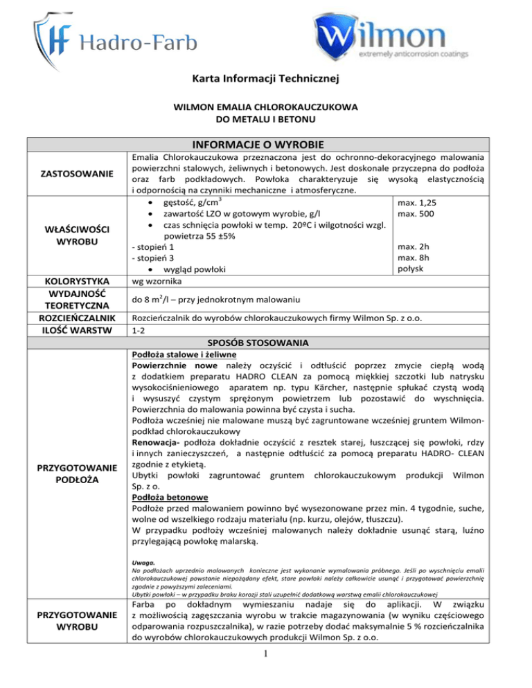 Karta Informacji Technicznej WILMON EMALIA CHLOROKAUCZUKOWA DO METALU I BETONU INFORMACJE O WYROBIE ZASTOSOWANIE WŁAŚCIWOŚCI WYROBU KOLORYSTYKA WYDAJNOŚĆ TEORETYCZNA ROZCIEŃCZALNIK ILOŚĆ WARSTW Emalia Chlorokauczukowa przeznaczona jest do ochronno-dekoracyjnego malowania powierzchni stalowych, żeliwnych i betonowych. Jest doskonale przyczepna do podłoża oraz farb podkładowych. Powłoka charakteryzuje się wysoką elastycznością i odpornością na czynniki mechaniczne i atmosferyczne. gęstość, g/cm3 max. 1,25 zawartość LZO w gotowym wyrobie, g/l max. 500 czas schnięcia powłoki w temp. 20ºC i wilgotności wzgl. powietrza 55 ±5% max. 2h - stopień 1 max. 8h - stopień 3 połysk wygląd powłoki wg wzornika do 8 m2/l – przy jednokrotnym malowaniu Rozcieńczalnik do wyrobów chlorokauczukowych firmy Wilmon Sp. z o.o. 1-2 SPOSÓB STOSOWANIA PRZYGOTOWANIE PODŁOŻA Podłoża stalowe i żeliwne Powierzchnie nowe należy oczyścić i odtłuścić poprzez zmycie ciepłą wodą z dodatkiem preparatu HADRO CLEAN za pomocą miękkiej szczotki lub natrysku wysokociśnieniowego aparatem np. typu Kärcher, następnie spłukać czystą wodą i wysuszyć czystym sprężonym powietrzem lub pozostawić do wyschnięcia. Powierzchnia do malowania powinna być czysta i sucha. Podłoża wcześniej nie malowane muszą być zagruntowane wcześniej gruntem Wilmonpodkład chlorokauczukowy Renowacja- podłoża dokładnie oczyścić z resztek starej, łuszczącej się powłoki, rdzy i innych zanieczyszczeń, a następnie odtłuścić za pomocą preparatu HADRO- CLEAN zgodnie z etykietą. Ubytki powłoki zagruntować gruntem chlorokauczukowym produkcji Wilmon Sp. z o. Podłoża betonowe Podłoże przed malowaniem powinno być wysezonowane przez min. 4 tygodnie, suche, wolne od wszelkiego rodzaju materiału (np. kurzu, olejów, tłuszczu). W przypadku podłoży wcześniej malowanych należy dokładnie usunąć starą, luźno przylegającą powłokę malarską. Uwaga. Na podłożach uprzednio malowanych konieczne jest wykonanie wymalowania próbnego. Jeśli po wyschnięciu emalii chlorokauczukowej powstanie niepożądany efekt, stare powłoki należy całkowicie usunąć i przygotować powierzchnię zgodnie z powyższymi zaleceniami. Ubytki powłoki – w przypadku braku korozji stali uzupełnić dodatkową warstwą emalii chlorokauczukowej PRZYGOTOWANIE WYROBU Farba po dokładnym wymieszaniu nadaje się do aplikacji. W związku z możliwością zagęszczania wyrobu w trakcie magazynowania (w wyniku częściowego odparowania rozpuszczalnika), w razie potrzeby dodać maksymalnie 5 % rozcieńczalnika do wyrobów chlorokauczukowych produkcji Wilmon Sp. z o.o. 1 MALOWANIE METODY APLIKACJI prace malarskie prowadzić w temperaturze otoczenia +10°C do +25 °C, temperatura podłoża co najmniej 3 ºC wyższa od temperatury punktu rosy, powinna mieścić się w przedziale pomiędzy +5 °C a +25ºC wilgotność względna powietrza nie powinna przekraczać 80% nie malować w upalne dni oraz przy silnym wietrze pełne utwardzenie powłoki następuje po ok. 10 dniach od wymalowania Warunki malowania decydują o czasie schnięcia warstwy wyrobu i właściwościach uzyskanej powłoki. nakładać 1-2 warstwy farby, tak, aby łączna grubość powłoki wynosiła min 60-80 µm, w przypadku malowania nowych podłoży stalowych, powierzchnię należy zagruntować podkładem chlorokauczukowym produkcji Wilmon Sp. z o.o., a następnie nałożyć Emalię Chlorokauczukową. kolejną warstwę nakładać do 1 h (mokro na mokro) od nałożenia warstwy poprzedniej lub po 7 dniach. Powierzchnia przed nałożeniem kolejnej warstwy powinna być sucha oraz pozbawiona wszelkich zanieczyszczeń. W przypadku nakładania drugiej warstwy po min. 7 dniach każdorazowo należy wykonać wymalowanie próbne, tj. sprawdzić na małej powierzchni możliwość nakładania tej warstwy. Jeżeli w ciągu 15 min. od próbnego wymalowania nie wystąpią wady powłoki w postaci pomarszczeń malowania można kontynuować. Pędzel, wałek, natrysk hydrodynamiczny (bezpowietrzny), natrysk pneumatyczny (wyłącznie w instalacjach) zalecane parametry natrysku hydrodynamicznego : - średnica dyszy 0,38 mm (0,011- 0,015”) - ciśnienie na dyszy 170 barów Dobór parametrów natrysku uzależniony jest od urządzenia natryskowego i powinien być poprzedzony próbami technicznymi. Do mycia aparatury należy stosować Rozcieńczalnik do wyrobów chlorokauczukowych produkcji Wilmon Sp. z o.o. DODATKOWE INFORMACJE OKRES PRZYDATNOŚCI OPAKOWANIA PRZECHOWYWANIE I TRANSPORT 24 miesiące od daty produkcji 0,75 l, 2,5l, 10l Przechowywanie - w szczelnie zamkniętych opakowaniach w temp. od 0°C do +30°C, z dala od źródeł ciepła i zapłonu 2