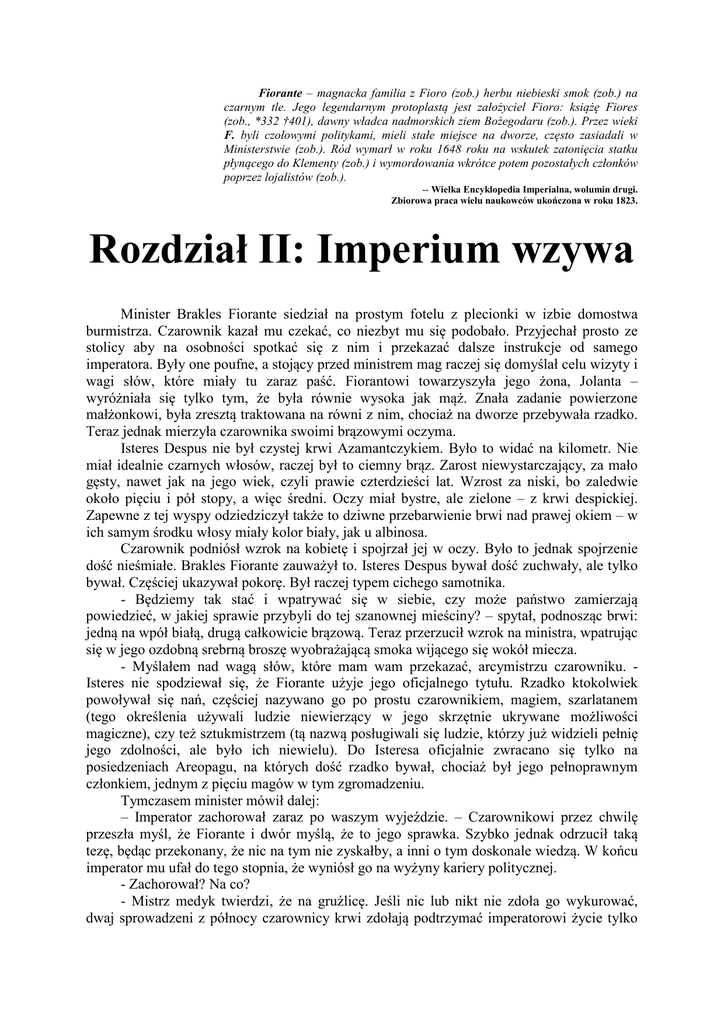 Fiorante – magnacka familia z Fioro (zob.) herbu niebieski smok (zob.) na czarnym tle. Jego legendarnym protoplastą jest założyciel Fioro: książę Fiores (zob., *332 †401), dawny władca nadmorskich ziem Bożegodaru (zob.). Przez wieki F. byli czołowymi politykami, mieli stałe miejsce na dworze, często zasiadali w Ministerstwie (zob.). Ród wymarł w roku 1648 roku na wskutek zatonięcia statku płynącego do Klementy (zob.) i wymordowania wkrótce potem pozostałych członków poprzez lojalistów (zob.). -- Wielka Encyklopedia Imperialna, wolumin drugi. Zbiorowa praca wielu naukowców ukończona w roku 1823. Rozdział II: Imperium wzywa Minister Brakles Fiorante siedział na prostym fotelu z plecionki w izbie domostwa burmistrza. Czarownik kazał mu czekać, co niezbyt mu się podobało. Przyjechał prosto ze stolicy aby na osobności spotkać się z nim i przekazać dalsze instrukcje od samego imperatora. Były one poufne, a stojący przed ministrem mag raczej się domyślał celu wizyty i wagi słów, które miały tu zaraz paść. Fiorantowi towarzyszyła jego żona, Jolanta – wyróżniała się tylko tym, że była równie wysoka jak mąż. Znała zadanie powierzone małżonkowi, była zresztą traktowana na równi z nim, chociaż na dworze przebywała rzadko. Teraz jednak mierzyła czarownika swoimi brązowymi oczyma. Isteres Despus nie był czystej krwi Azamantczykiem. Było to widać na kilometr. Nie miał idealnie czarnych włosów, raczej był to ciemny brąz. Zarost niewystarczający, za mało gęsty, nawet jak na jego wiek, czyli prawie czterdzieści lat. Wzrost za niski, bo zaledwie około pięciu i pół stopy, a więc średni. Oczy miał bystre, ale zielone – z krwi despickiej. Zapewne z tej wyspy odziedziczył także to dziwne przebarwienie brwi nad prawej okiem – w ich samym środku włosy miały kolor biały, jak u albinosa. Czarownik podniósł wzrok na kobietę i spojrzał jej w oczy. Było to jednak spojrzenie dość nieśmiałe. Brakles Fiorante zauważył to. Isteres Despus bywał dość zuchwały, ale tylko bywał. Częściej ukazywał pokorę. Był raczej typem cichego samotnika. - Będziemy tak stać i wpatrywać się w siebie, czy może państwo zamierzają powiedzieć, w jakiej sprawie przybyli do tej szanownej mieściny? – spytał, podnosząc brwi: jedną na wpół białą, drugą całkowicie brązową. Teraz przerzucił wzrok na ministra, wpatrując się w jego ozdobną srebrną broszę wyobrażającą smoka wijącego się wokół miecza. - Myślałem nad wagą słów, które mam wam przekazać, arcymistrzu czarowniku. Isteres nie spodziewał się, że Fiorante użyje jego oficjalnego tytułu. Rzadko ktokolwiek powoływał się nań, częściej nazywano go po prostu czarownikiem, magiem, szarlatanem (tego określenia używali ludzie niewierzący w jego skrzętnie ukrywane możliwości magiczne), czy też sztukmistrzem (tą nazwą posługiwali się ludzie, którzy już widzieli pełnię jego zdolności, ale było ich niewielu). Do Isteresa oficjalnie zwracano się tylko na posiedzeniach Areopagu, na których dość rzadko bywał, chociaż był jego pełnoprawnym członkiem, jednym z pięciu magów w tym zgromadzeniu. Tymczasem minister mówił dalej: – Imperator zachorował zaraz po waszym wyjeździe. – Czarownikowi przez chwilę przeszła myśl, że Fiorante i dwór myślą, że to jego sprawka. Szybko jednak odrzucił taką tezę, będąc przekonany, że nic na tym nie zyskałby, a inni o tym doskonale wiedzą. W końcu imperator mu ufał do tego stopnia, że wyniósł go na wyżyny kariery politycznej. - Zachorował? Na co? - Mistrz medyk twierdzi, że na gruźlicę. Jeśli nic lub nikt nie zdoła go wykurować, dwaj sprowadzeni z północy czarownicy krwi zdołają podtrzymać imperatorowi życie tylko do końca lata, jeśli nie krócej. Gdyby się nie powiodło, magiczna kuracja byłaby tylko odwlekaniem nieuniknionego i zostałaby w końcu przerwana na polecenie samego władcy, lub kogoś z jego familii… Albo nawet czarowników. - Imperator był przecież okazem zdrowia jak na swój wiek. Nie mógł zachorować tak niespodziewanie. - Właśnie. Choroba była trzymana w tajemnicy, ale wieści już rozpierzchły się po ulicach Semedis. A cały dwór pęka w szwach od plotek. Szpiedzy na usługach szefa tajnej policji donoszą o niepokojach. Nasz najwyższy władca sam przyznał, że zbliża się coś niefortunnego. I nie chodzi tu tylko o to, że wkrótce umrze. Przeżył już kilkadziesiąt wiosen rządów, wiec stwierdził, że i tak czas na niego. Na okres jego niedomagania powołał tajne zgromadzenie, do którego masz należeć ty. - Co to za zgromadzenie? - Najwyższa Tajna Rada. Zasiada w niej kilka najbardziej zaufanych osób imperatora, łącznie ze mną i moją małżonką, tobą i imperialnym kapelanem. - Ojciec Sarytes? – Isteres mocno się zdziwił. Naturalnie, niepozorni kapelani często zostawali zausznikami władców, nie tylko w rodzimym Azamancie, ale także w reszcie cywilizowanych krajów świata. Wielokrotnie w przeszłości kasta kapłanów próbowała przejąć władzę w Imperium, a także poza jego granicami. Najczęściej do takich zdarzeń dochodziło w pustynnym Miltenesie, gdzie kapłani różnych bóstw dochodzili do władzy i próbowali wprowadzać monoteizm. Z różnym skutkiem. Ojciec Sarytes był jednak bardzo niepozornym starcem, towarzyszącym elitom państwa w imperialnym orszaku – niemalże zawsze był obecny podczas różnych uroczystości, podróży, polowań, turniejów i wizyt dyplomatycznych. Zawsze w cieniu imperatora i jego świty. Isteres do tej pory nie sądził, że Sarytes jest aż tak znaczącą figurą na wielkim polu gry zwanym dworem imperialnym. Był spowiednikiem, zapewne powierzano mu najskrytsze tajemnice. Ale nie wiedział, że zgodzi się brać w tym udział. Ciekawe, co wpłynęło lub kto wpłynął na niego, oprócz imperatora – pomyślał Isteres. - Ojciec Sary
