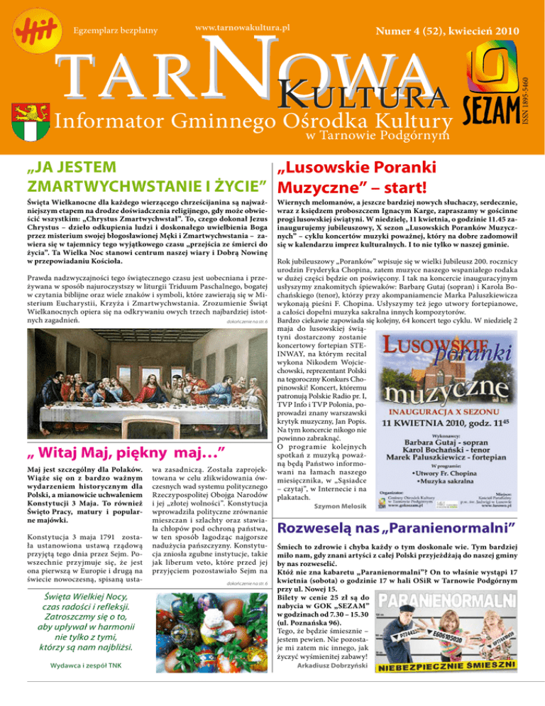 www.tarnowakultura.pl Numer 4 (52), kwiecień 2010 Informator Gminnego Ośrodka Kultury w Tarnowie Podgórnym „Ja jestem „Lusowskie Poranki Zmartwychwstanie i życie” Muzyczne” – start! Święta Wielkanocne dla każdego wierzącego chrześcijanina są najważniejszym etapem na drodze doświadczenia religijnego, gdy może obwieścić wszystkim: „Chrystus Zmartwychwstał”. To, czego dokonał Jezus Chrystus – dzieło odkupienia ludzi i doskonałego uwielbienia Boga przez misterium swojej błogosławionej Męki i Zmartwychwstania – zawiera się w tajemnicy tego wyjątkowego czasu „przejścia ze śmierci do życia”. Ta Wielka Noc stanowi centrum naszej wiary i Dobrą Nowinę w przepowiadaniu Kościoła. Prawda nadzwyczajności tego świątecznego czasu jest uobecniana i przeżywana w sposób najuroczystszy w liturgii Triduum Paschalnego, bogatej w czytania biblijne oraz wiele znaków i symboli, które zawierają się w Misterium Eucharystii, Krzyża i Zmartwychwstania. Zrozumienie Świąt Wielkanocnych opiera się na odkrywaniu owych trzech najbardziej istotnych zagadnień. dokończenie na str. 6 „ Witaj Maj, piękny maj…” Maj jest szczególny dla Polaków. Wiąże się on z bardzo ważnym wydarzeniem historycznym dla Polski, a mianowicie uchwaleniem Konstytucji 3 Maja. To również Święto Pracy, matury i popularne majówki. Konstytucja 3 maja 1791 została ustanowiona ustawą rządową przyjętą tego dnia przez Sejm. Powszechnie przyjmuje się, że jest ona pierwszą w Europie i drugą na świecie nowoczesną, spisaną usta- Święta Wielkiej Nocy, czas radości i refleksji. Zatroszczmy się o to, aby upływał w harmonii nie tylko z tymi, którzy są nam najbliżsi. Wydawca i zespół TNK wa zasadniczą. Została zaprojektowana w celu zlikwidowania ówczesnych wad systemu politycznego Rzeczypospolitej Obojga Narodów i jej „złotej wolności”. Konstytucja wprowadziła polityczne zrównanie mieszczan i szlachty oraz stawiała chłopów pod ochroną państwa, w ten sposób łagodząc najgorsze nadużycia pańszczyzny. Konstytucja zniosła zgubne instytucje, takie jak liberum veto, które przed jej przyjęciem pozostawiało Sejm na dokończenie na str. 6 Wiernych melomanów, a jeszcze bardziej nowych słuchaczy, serdecznie, wraz z księdzem proboszczem Ignacym Karge, zapraszamy w gościnne progi lusowskiej świątyni. W niedzielę, 11 kwietnia, o godzinie 11.45 zainaugurujemy jubileuszowy, X sezon „Lusowskich Poranków Muzycznych” – cyklu koncertów muzyki poważnej, który na dobre zadomowił się w kalendarzu imprez kulturalnych. I to nie tylko w naszej gminie. Rok jubileuszowy „Poranków” wpisuje się w wielki Jubileusz 200. rocznicy urodzin Fryderyka Chopina, zatem muzyce naszego wspaniałego rodaka w dużej części będzie on poświęcony. I tak na koncercie inauguracyjnym usłyszymy znakomitych śpiewaków: Barbarę Gutaj (sopran) i Karola Bochańskiego (tenor), którzy przy akompaniamencie Marka Paluszkiewicza wykonają pieśni F. Chopina. Usłyszymy też jego utwory fortepianowe, a całości dopełni muzyka sakralna innych kompozytorów. Bardzo ciekawie zapowiada się kolejny, 64 koncert tego cyklu. W niedzielę 2 maja do lusowskiej świątyni dostarczony zostanie koncertowy fortepian STEINWAY, na którym recital wykona Nikodem Wojciechowski, reprezentant Polski na tegoroczny Konkurs Chopinowski! Koncert, któremu patronują Polskie Radio pr. I, TVP Info i TVP Polonia, poprowadzi znany warszawski krytyk muzyczny, Jan Popis. Na tym koncercie nikogo nie powinno zabraknąć. O programie kolejnych spotkań z muzyką poważną będą Państwo informowani na łamach naszego miesięcznika, w „Sąsiadce – czytaj”, w Internecie i na plakatach. Szymon Melosik Rozweselą nas „Paranienormalni” Śmiech to zdrowie i chyba każdy o tym doskonale wie. Tym bardziej miło nam, gdy znani artyści z całej Polski przyjeżdżają do naszej gminy by nas rozweselić. Któż nie zna kabaretu „Paranienormalni”? On to właśnie wystąpi 17 kwietnia (sobota) o godzinie 17 w hali OSiR w Tarnowie Podgórnym przy ul. Nowej 15. Bilety w cenie 25 zł są do nabycia w GOK „SEZAM” w godzinach od 7.30 – 15.30 (ul. Poznańska 96). Tego, że będzie śmiesznie – jestem pewien. Nie pozostaje mi zatem nic innego, jak życzyć wyśmienitej zabawy! Arkadiusz Dobrzyński ISSN 1895-5460 Egzemplarz bezpłatny 1 KWIECIEŃ 2010 • TARNOWA KULTURA 2 TARNOWA KULTURA • KWIECIEŃ 2010 Bądźmy razem w Poznaniu Dni Przeźmierowa Na wagę złota jest umiejętność zainteresowania sztuką, na przykład teatrem, młodych ludzi. W gminie Tarnowo Podgórne, w 2002 roku, powstał interesujący projekt. Kolejne jego odsłony budzą uznanie. Proszę Państwa, oto „Teatr w każdej wiosce”! Tradycyjnie kwietniowy finał tego projektu jest prezentacją szerokiej publiczności efektów pracy kilkunastu grup teatralnych. „W każdej wiosce”, w świetlicy lub domu kultury, przez ostatnie pół roku instruktorzy pracowali z dziećmi i młodzieżą nad przedstawieniami, wspierani przez koordynatorów oraz artystów plastyki, choreografii i muzyki. W zeszłym roku porwała nas barwna i różnorodna „Fantazja”. Tym razem czeka nas niespodzianka, gdyż hasło tegorocznego sezonu – „Razem i osobno” – sugeruje, że w projekcie przyszedł czas na zmiany. Przede wszystkim na zmiany w podejściu do współpracy między zespołami. Znana wcześniej formuła „jeden teatr = jeden spektakl” uległa przekształceniu i równanie to nie jest już takie proste. Jakie będzie rozwiązanie, o tym przekonamy się w sobotę, 24 kwietnia. Start o godz. 10. Uwaga! Tym razem teatry zaprezentują się na scenie w Centrum Kultury „Zamek” w Poznaniu. Serdecznie zapraszamy! Dominik Magdziarek Muzyka z różnych stron świata Posłuchaj, co gra w rosyjskiej duszy Naszym sąsiadom ze Wschodu zazdrościmy niekiedy duszy z fantazją, zamiłowania do muzyki, śpiewu zaś w szczególno