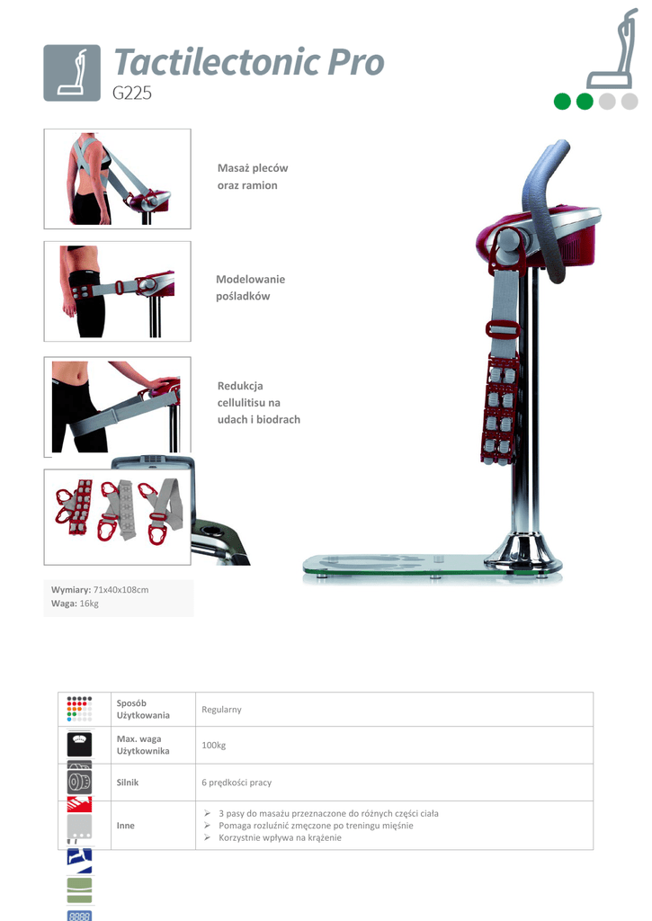 Masaż pleców oraz ramion Modelowanie pośladków Redukcja cellulitisu na udach i biodrach Wymiary: 71x40x108cm Waga: 16kg Sposób Użytkowania Regularny Max. waga Użytkownika 100kg Silnik 6 prędkości pracy Inne 3 pasy do masażu przeznaczone do różnych części ciała Pomaga rozluźnić zmęczone po treningu mięśnie Korzystnie wpływa na krążenie