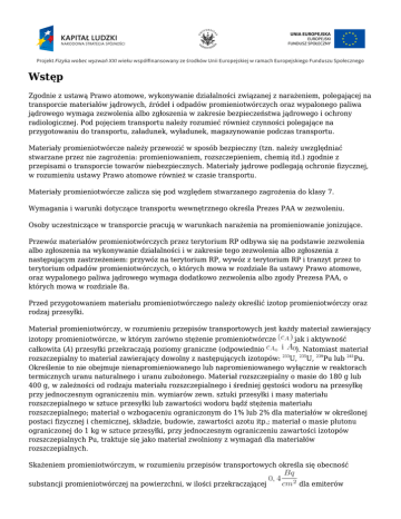 Wstęp Zgodnie z ustawą Prawo atomowe, wykonywanie działalności związanej z narażeniem, polegającej na transporcie materiałów jądrowych, źródeł i odpadów promieniotwórczych oraz wypalonego paliwa jądrowego wymaga zezwolenia albo zgłoszenia w zakresie bezpieczeństwa jądrowego i ochrony radiologicznej. Pod pojęciem transportu należy rozumieć również czynności polegające na przygotowaniu do transportu, załadunek, wyładunek, magazynowanie podczas transportu. Materiały promieniotwórcze należy przewozić w sposób bezpieczny (tzn. należy uwzględniać stwarzane przez nie zagrożenia: promieniowaniem, rozszczepieniem, chemią itd.) zgodnie z przepisami o transporcie towarów niebezpiecznych. Materiały jądrowe podlegają ochronie fizycznej, w rozumieniu ustawy Prawo atomowe również w czasie transportu. Materiały promieniotwórcze zalicza się pod względem stwarzanego zagrożenia do klasy 7. Wymagania i warunki dotyczące transportu wewnętrznego określa Prezes PAA w zezwoleniu. Osoby uczestniczące w transporcie pracują w warunkach narażenia na promieniowanie jonizujące. Przewóz materiałów promieniotwórczych przez terytorium RP odbywa się na podstawie zezwolenia albo zgłoszenia na wykonywanie działalności i w zakresie tego zezwolenia albo zgłoszenia z następującym zastrzeżeniem: przywóz na terytorium RP, wywóz z terytorium RP i tranzyt przez to terytorium odpadów promieniotwórczych, o których mowa w rozdziale 8a ustawy Prawo atomowe, oraz wypalonego paliwa jądrowego wymaga dodatkowo zezwolenia albo zgody Prezesa PAA, o których mowa w rozdziale 8a. Przed przygotowaniem materiału promieniotwórczego należy określić izotop promieniotwórczy oraz rodzaj przesyłki. Materiał promieniotwórczy, w rozumieniu przepisów transportowych jest każdy materiał zawierający izotopy promieniotwórcze, w którym zarówno stężenie promieniotwórcze jak i aktywność całkowita (A) przesyłki przekraczają poziomy graniczne (odpowiednio ). Natomiast materiał 233 rozszczepialny to materiał zawierający dowolny z następujących izotopów: U, 235U, 239Pu lub 241Pu. Określenie to nie obejmuje nienapromieniowanego lub napromieniowanego wyłącznie w reaktorach termicznych uranu naturalnego i uranu zubożonego. Materiał rozszczepialny o masie do 180 g lub 400 g, w zależności od rodzaju materiału rozszczepialnego i średniej gęstości wodoru na przesyłkę przy jednoczesnym ograniczeniu min. wymiarów zewn. sztuki przesyłki i masy materiału rozszczepialnego w sztuce przesyłki lub zawartości wodoru bądź stężenia materiału rozszczepialnego; materiał o wzbogaceniu ograniczonym do 1% lub 2% dla materiałów w określonej postaci fizycznej i chemicznej, składzie, budowie, zawartości azotu itp.; materiał o masie plutonu ograniczonej do 1 kg w sztuce przesyłki, przy jednoczesnym ograniczeniu zawartości izotopów rozszczepialnych Pu, traktuje się jako materiał zwolniony z wymagań dla materiałów rozszczepialnych. Skażeniem promieniotwórczym, w rozumieniu przepisów transportowych określa się obecność substancji promieniotwórczej na powierzchni, w ilości przekraczającej dla emiterów promieniowania beta i gamma oraz dla niskotoksycznych emiterów promieniowania alfa lub dla pozostałych emiterów promieniowania alfa. Rozróżnia się dwa rodzaje skażeń — niezwiązane, które może być usunięte z powierzchni w normalnych warunkach przewozu (bez jej zniszczenia) oraz związane, czyli inne niż skażenie niezwiązane. Nierozpraszalny stały materiał promieniotwórczy albo zamknięta kapsuła zawierająca materiał promieniotwórczy, których co najmniej jeden z wymiarów nie może być mniejszy niż 5 mm, jest określany jako materiał promieniotwórczy w postaci specjalnej (S). Wzór S wymaga zatwierdzenia jednostronnego, czyli wyłącznie przez właściwą władzę państwa pochodzenia tego wzoru. Innym rodzajem zatwierdzenia jest zatwierdzenie wielostronne dokonane przez właściwą władzę zarówno państwa pochodzenia, jak i każdego państwa, przez którego terytorium dokonywany jest przewóz (nie dotyczy przelotu ponad terytorium bez międzylądowań). Przez wzór należy rozumieć opis materiału promieniotwórczego w postaci specjalnej, materiału promieniotwórczego słabo rozpraszalnego, opakowania lub sztuki przesyłki, który pozwala dokładnie określić te wyroby. Opis ten stanowi dokumentację techniczną ww. wyrobów. Materiał o niskiej aktywności właściwej (LSA) to materiał promieniotwórczy, który ze względu na naturalne właściwości ma ograniczoną aktywność właściwą lub materiał promieniotwórczy, do którego mają zastosowanie ograniczenia dotyczące oszacowanej średniej aktywności właściwej (w obliczeniach ww. oszacowanej średniej aktywności właściwej nie uwzględnia się materiałów stosowanych na osłony zewnętrzne LSA). Materiały LSA kwalifikuje się do jednej z trzech grup: LSAI, LSA-II lub LSA-III LSA-I — nierozszczepialny lub rozszczepialny-wyłączony rudy i koncentraty rud U i Th oraz inne rudy zawierające naturalne izotopy promieniotwórcze, nienapromieniowany stały lub ciekły Unat, Udep, Thnat lub ich związki i mieszaniny, materiały dla których wartość jest nieograniczona, inne materiały, dla których oszacowana średnia aktywność właściwa ≤ ; LSA-II woda trytowa o ograniczonym stężeniu, inne materiały, dla których oszacowana średnia aktywność właściwa ≤ (10-4 lub 10-5) x odpowiednio dla ciał stałych i gazów oraz cieczy; LSA-III — materiały stałe z wyłączeniem proszków, w których: materiał promieniotwórczy jest rozłożony w miarę równomiernie, oszacowana średnia aktywność właściwa materiału ≤ materiał przeszedł badanie ługowalności. , Przedmiot skażony powierzchniowo (SCO) to obiekt w postaci ciała stałego (przedmiot), który sam nie jest promieniotwórczy, ale na jego powierzchni znajduje się materiał 