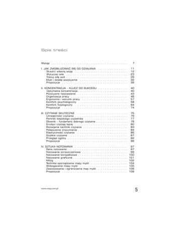 Spis treści Wstęp . . . . . . . . . . . . . . . . . . . . . . . . . . . . . . . . . . . . . . . . . . . 7 I. JAK ZMOBILIZOWAĆ SIĘ DO DZIAŁANIA Stwórz własną wizję . . . . . . . . . . . . . Wytyczaj cele . . . . . . . . . . . . . . . . . . Trenuj siłę woli . . . . . . . . . . . . . . . . . . Myśl i działaj pozytywnie . . . . . . . . . . Propozycje . . . . . . . . . . . . . . . . . . . . . . . . . . . . . . . . . . . . . . . . . . . . . . . . . . . . . . . . . . . . . . . . . . . . . . . . . . . . . . . . . . . . . . . . . . . . . . . . . . . . . . . . . . . . . . . . . . . . . . . . . . 11 12 23 29 32 39 II. KONCENTRACJA – KLUCZ DO SUKCESU Optymalna koncentracja . . . . . . . . . . . Pozytywne nastawienie . . . . . . . . . . . . Organizacja pracy . . . . . . . . . . . . . . . Ergonomia i warunki pracy . . . . . . . . . Komfort psychologiczny . . . . . . . . . . . Komfort fizjologiczny . . . . . . . . . . . . . Propozycje . . . . . . . . . . . . . . . . . . . . . . . . . . . . . . . . . . . . . . . . . . . . . . . . . . . . . . . . . . . . . . . . . . . . . . . . . . . . . . . . . . . . . . . . . . . . . . . . . . . . . . . . . . . . . . . . . . . . . . . . . . . . . . . . . . . . . . . . . . . . . . . . . . . . . . . . . . . . 40 40 43 46 57 58 64 74 III. CZYTANIE SKUTECZNE . . . . . . . . . . . Umiejętność czytania . . . . . . . . . . . . Portret kiepskiego czytelnika . . . . . . Słownik – fundament dobrego czytania Erudyci czytają lepiej . . . . . . . . . . . . Rozwijanie techniki czytania . . . . . . . Polepszenie zrozumienia . . . . . . . . . . Elastyczność czytania . . . . . . . . . . . Szybkie czytanie . . . . . . . . . . . . . . . Przegląd ogólny . . . . . . . . . . . . . . . . Propozycje . . . . . . . . . . . . . . . . . . . . . . . . . . . . . . . . . . . . . . . . . . . . . . . . . . . . . . . . . . . . . . . . . . . . . . . . . . . . . . . . . . . . . . . . . . . . . . . . . . . . . . . . . . . . . . . . . . . . . . . . . . . . . . . . . . . . . . . . . . . . . . . . . . . . . . . . . . . . . . . . . . . . . . . . . . . . . . . . . . . . . . . . . . . . . . . . . . . . . . . . . . . . . . . . . . . . . . . . . 75 76 77 78 80 83 84 86 87 92 96 IV. SZTUKA NOTOWANIA . . . . . . . . . . . . . Sens notowania . . . . . . . . . . . . . . . . . Notowanie streszczeniowe . . . . . . . . . Notowanie konspektowe . . . . . . . . . . . Notowanie graficzne . . . . . . . . . . . . . . Mózg . . . . . . . . . . . . . . . . . . . . . . . . Technika sporządzania mapy myśli . . . . Wzbogacanie mapy myśli . . . . . . . . . . Zastosowania i ograniczenia map myśli Propozycje . . . . . . . . . . . . . . . . . . . . . . . . . . . . . . . . . . . . . . . . . . . . . . . . . . . . . . . . . . . . . . . . . . . . . . . . . . . . . . . . . . . . . . . . . . . . . . . . . . . . . . . . . . . . . . . . . . . . . . . . . . . . . . . . . . . . . . . . . . . . . . . . . . . . . . . . . . . . . . . . . . . . . . . . . . . . . . . . . . . . . . . . . . . . . . 97 97 99 100 101 102 104 105 106 109 www.wsip.com.pl 5 V. OD POWTARZANIA DO ZAPAMIĘTANIA Zrozumieć, by zapamiętać . . . . . . . . Sekrety pamięci . . . . . . . . . . . . . . . Co sprzyja zapamiętywaniu . . . . . . . Strategie uczenia się . . . . . . . . . . . Wspomaganie powtarzania . . . . . . . . Propozycje . . . . . . . . . . . . . . . . . . . 6 . . . . . . . . . . . . . . . . . . . . . . . . . . . . . . . . . . . . . . . . . . . . . . . . . . . . . . . . . . . . . . . . . . . . . . . . . . . . . . . . . . . . . . . . . . . . . . . . . . . . . . . . . 110 111 113 117 120 124 131 VI. MNEMONIKA – CUD CZY SZALBIERSTWO? Kodowanie mnemotechniczne . . . . . . . . . . Metoda miejsc . . . . . . . . . . . . . . . . . . . . Cogito ergo sum . . . . . . . . . . . . . . . . . . . Użyteczność mnemoniki . . . . . . . . . . . . . . Propozycje . . . . . . . . . . . . . . . . . . . . . . . . . . . . . . . . . . . . . . . . . . . . . . . . . . . . . . . . . . . . . . . . . . . . . . . . . . . . . . . . . . . . . . . . . . . . . . . . . . . . . . . . . . . 132 133 138 139 140 143 VII. SUKCES NA EZGAMINIE . . . . . . Pojedynek, gra czy transakcja? . . Egzamin i lęk . . . . . . . . . . . . . . Poskramianie lęku . . . . . . . . . . . Poznaj oczekiwania egzaminatora Egzamin ustny . . . . . . . . . . . . . Egzamin pisemny . . . . . . . . . . . Egzamin testowy . . . . . . . . . . . Zasady formułowania odpowiedzi Kopciuszek, kujon, wamp . . . . . . Olimpijska forma . . . . . . . . . . . . Propozycje . . . . . . . . . . . . . . . . . . . . . . . . . . . . . . . . . . . . . . . . . . . . . . . . . . . . . . . . . . . . . . . . . . . . . . . . . . . . . . . . . . . . . . . . . . . . . . . . . . . . . . . . . . . . . . . . . . . . . . . . . . . . . . . . . . . . . . . . . . . . . . . . . . . . . . . . . . . . . . . . . . . . . . . . . . . . . . . . . . . . . . . . . . . . . . . . . . . . . . . . . . . . . . . . . . . . . . . . . . . . . . . . . . . . . . . . . . . . . . . . . . . . . . . . . . . . . . . . . . . . . . . . . . . . 144 145 145 147 158 159 165 167 171 174 180 183 VIII. A JEŚLI SIĘ NIE POWIEDZIE Gorzki smak porażki . . . . . . Optymiści i pesymiści . . . . . Radzenie sobie ze stresem . Twój czas nadejdzie . . . . . . . Dla pokrzepienia serc . . . . . Propozycje . . . . . . . . . . . . . . . . . . . . . . . . . . . . . . . . . . . . . . . . . . . . . . . . . . . . . . . . . . . . . . . . . . . . . . . . . . . . . . . . . . . . . . . . . . . . . . . . . . . . . . . . . . . . . . . . . . . . . . . . . . . . . . . . . . . . . . . . . . . . . . . . . . . . . . . . . . . . . . . . 184 187 189 194 196 198 211 EPILOG . . . . . . . . . . . . . . . . . . . . . . . . . . . . . . . . . . . . . . . . . . 212 BIBLIOGRAFIA . . . . . . . . . . . . . . . . . . . . . . . . . . . . . . . . . . . . . 213 . . . . . . . . . . . . . . . . . . . . . . . . . . . . . . . . . . . . . . . . .