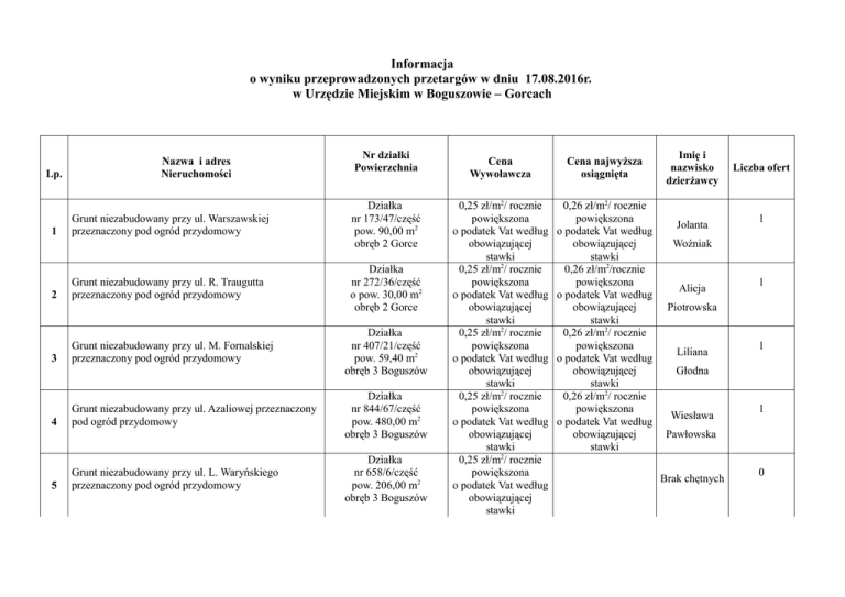 Informacja o wyniku przeprowadzonych przetargów w dniu 17.08.2016r. w Urzędzie Miejskim w Boguszowie – Gorcach Lp. 1 2 3 4 5 Nazwa i adres Nieruchomości Grunt niezabudowany przy ul. Warszawskiej przeznaczony pod ogród przydomowy Grunt niezabudowany przy ul. R. Traugutta przeznaczony pod ogród przydomowy Grunt niezabudowany przy ul. M. Fornalskiej przeznaczony pod ogród przydomowy Grunt niezabudowany przy ul. Azaliowej przeznaczony pod ogród przydomowy Grunt niezabudowany przy ul. L. Waryńskiego przeznaczony pod ogród przydomowy Nr działki Powierzchnia Działka nr 173/47/część pow. 90,00 m2 obręb 2 Gorce Działka nr 272/36/część o pow. 30,00 m2 obręb 2 Gorce Działka nr 407/21/część pow. 59,40 m2 obręb 3 Boguszów Działka nr 844/67/część pow. 480,00 m2 obręb 3 Boguszów Działka nr 658/6/część pow. 206,00 m2 obręb 3 Boguszów Cena Wywoławcza Cena najwyższa osiągnięta 0,25 zł/m2/ rocznie powiększona o podatek Vat według obowiązującej stawki 0,25 zł/m2/ rocznie powiększona o podatek Vat według obowiązującej stawki 0,25 zł/m2/ rocznie powiększona o podatek Vat według obowiązującej stawki 0,25 zł/m2/ rocznie powiększona o podatek Vat według obowiązującej stawki 0,25 zł/m2/ rocznie powiększona o podatek Vat według obowiązującej stawki 0,26 zł/m2/ rocznie powiększona o podatek Vat według obowiązującej stawki 0,26 zł/m2/rocznie powiększona o podatek Vat według obowiązującej stawki 0,26 zł/m2/ rocznie powiększona o podatek Vat według obowiązującej stawki 0,26 zł/m2/ rocznie powiększona o podatek Vat według obowiązującej stawki Imię i nazwisko dzierżawcy Jolanta Liczba ofert 1 Woźniak Alicja 1 Piotrowska Liliana 1 Głodna Wiesława 1 Pawłowska Brak chętnych 0 Grunt niezabudowany przy ul. 1 Maja przeznaczony pod ogród przydomowy Działka nr 581/14/część pow. 88,00 m2 obręb 3 Boguszów 7 Grunt niezabudowany przy ul. 1 Maja przeznaczony pod ogród przydomowy Działka nr 581/14/część pow. 204,00 m2 obręb 3 Boguszów 8 Grunt niezabudowany przy ul. M. Kopernika przeznaczony pod ogród przydomowy 9 Grunt niezabudowany przy ul. Górnej przeznaczony pod ogród przydomowy 6 Działka nr 331/25/część pow. 77,00 m2 obręb 7 Kuźnice Świdnickie Działka nr 237/5/część pow. 49,00 m2 obręb 7 Kuźnice Świdnickie 0,25 zł/m2/ rocznie 0,26 zł/m2/ rocznie powiększona powiększona Dariusz Kotus o podatek Vat według o podatek Vat według obowiązującej obowiązującej stawki stawki 0,25 zł/m2/ rocznie 0,26 zł/m2/ rocznie powiększona powiększona Kamila o podatek Vat według o podatek Vat według Romejko obowiązującej obowiązującej stawki stawki 0,25 zł/m2/ rocznie 0,26 zł/m2/ rocznie powiększona powiększona Krzysztof o podatek Vat według o podatek Vat według Taborski obowiązującej obowiązującej stawki stawki 0,25 zł/m2/ rocznie powiększona Brak chętnych o podatek Vat według obowiązującej stawki 1 1 1 0 Boguszów-Gorce, dnia 29 sierpnia 2016r. Sporządzała: M. S. Burmistrz Miasta Boguszowa-Gorc /-/ Waldemar Kujawa