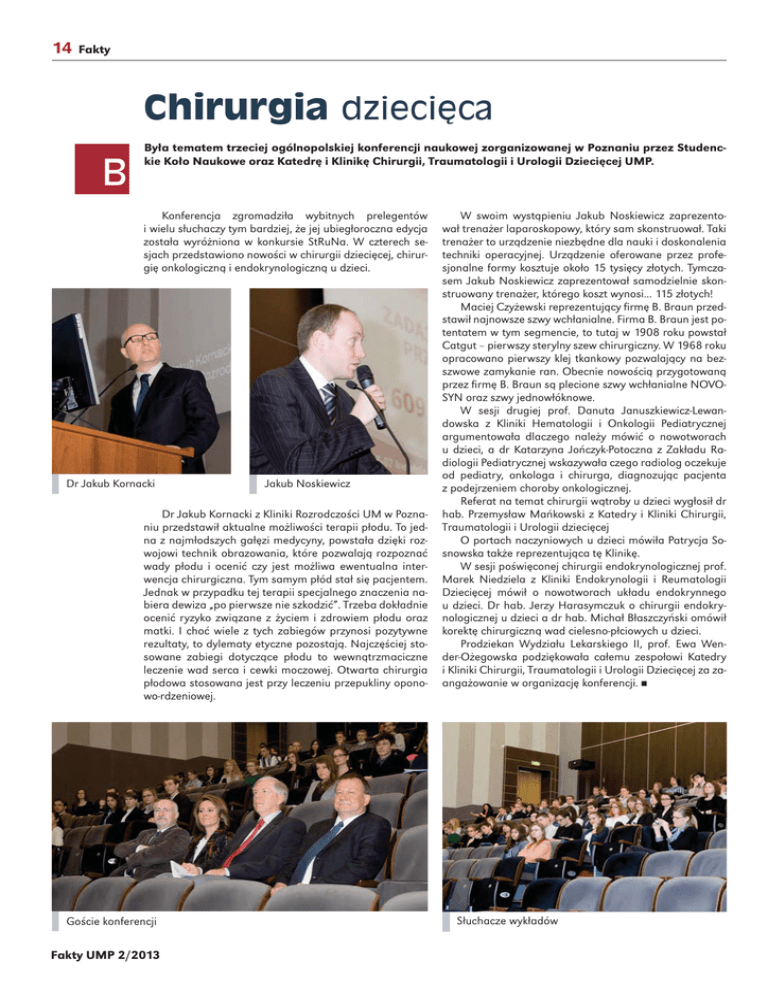 14 Fakty Chirurgia dziecięca B Była tematem trzeciej ogólnopolskiej konferencji naukowej zorganizowanej w Poznaniu przez Studenckie Koło Naukowe oraz Katedrę i Klinikę Chirurgii, Traumatologii i Urologii Dziecięcej UMP. Konferencja zgromadziła wybitnych prelegentów i wielu słuchaczy tym bardziej, że jej ubiegłoroczna edycja została wyróżniona w konkursie StRuNa. W czterech sesjach przedstawiono nowości w chirurgii dziecięcej, chirurgię onkologiczną i endokrynologiczną u dzieci. Dr Jakub Kornacki Jakub Noskiewicz Dr Jakub Kornacki z Kliniki Rozrodczości UM w Poznaniu przedstawił aktualne możliwości terapii płodu. To jedna z najmłodszych gałęzi medycyny, powstała dzięki rozwojowi technik obrazowania, które pozwalają rozpoznać wady płodu i ocenić czy jest możliwa ewentualna interwencja chirurgiczna. Tym samym płód stał się pacjentem. Jednak w przypadku tej terapii specjalnego znaczenia nabiera dewiza „po pierwsze nie szkodzić”. Trzeba dokładnie ocenić ryzyko związane z życiem i zdrowiem płodu oraz matki. I choć wiele z tych zabiegów przynosi pozytywne rezultaty, to dylematy etyczne pozostają. Najczęściej stosowane zabiegi dotyczące płodu to wewnątrzmaciczne leczenie wad serca i cewki moczowej. Otwarta chirurgia płodowa stosowana jest przy leczeniu przepukliny oponowo-rdzeniowej. Goście konferencji Fakty UMP 2/2013 W swoim wystąpieniu Jakub Noskiewicz zaprezentował trenażer laparoskopowy, który sam skonstruował. Taki trenażer to urządzenie niezbędne dla nauki i doskonalenia techniki operacyjnej. Urządzenie oferowane przez profesjonalne formy kosztuje około 15 tysięcy złotych. Tymczasem Jakub Noskiewicz zaprezentował samodzielnie skonstruowany trenażer, którego koszt wynosi... 115 złotych! Maciej Czyżewski reprezentujący firmę B. Braun przedstawił najnowsze szwy wchłanialne. Firma B. Braun jest potentatem w tym segmencie, to tutaj w 1908 roku powstał Catgut – pierwszy sterylny szew chirurgiczny. W 1968 roku opracowano pierwszy klej tkankowy pozwalający na bezszwowe zamykanie ran. Obecnie nowością przygotowaną przez firmę B. Braun są plecione szwy wchłanialne NOVOSYN oraz szwy jednowłóknowe. W sesji drugiej prof. Danuta Januszkiewicz-Lewandowska z Kliniki Hematologii i Onkologii Pediatrycznej argumentowała dlaczego należy mówić o nowotworach u dzieci, a dr Katarzyna Jończyk-Potoczna z Zakładu Radiologii Pediatrycznej wskazywała czego radiolog oczekuje od pediatry, onkologa i chirurga, diagnozując pacjenta z podejrzeniem choroby onkologicznej. Referat na temat chirurgii wątroby u dzieci wygłosił dr hab. Przemysław Mańkowski z Katedry i Kliniki Chirurgii, Traumatologii i Urologii dziecięcej O portach naczyniowych u dzieci mówiła Patrycja Sosnowska także reprezentująca tę Klinikę. W sesji poświęconej chirurgii endokrynologicznej prof. Marek Niedziela z Kliniki Endokrynologii i Reumatologii Dziecięcej mówił o nowotworach układu endokrynnego u dzieci. Dr hab. Jerzy Harasymczuk o chirurgii endokrynologicznej u dzieci a dr hab. Michał Błaszczyński omówił korektę chirurgiczną wad cielesno-płciowych u dzieci. Prodziekan Wydziału Lekarskiego II, prof. Ewa Wender-Ożegowska podziękowała całemu zespołowi Katedry i Kliniki Chirurgii, Traumatologii i Urologii Dziecięcej za zaangażowanie w organizację konferencji. ■ Słuchacze wykładów