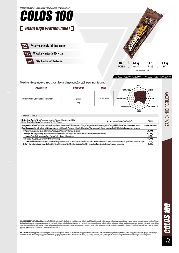ŚRODEK SPOŻYWCZY SPECJALNEGO PRZEZNACZENIA ŻYWIENIOWEGO COLOS 100 Giant High Protein Cake! Pyszny na ciepło jak i na zimno Wysoka wartość odżywcza 30 g białka w 1 batonie 30 g PROTEIN 41 g CARBS 3g FIBRE 11 g FAT PER 1 PORTION – 100 G Wysokobiałkowy baton o smaku czekoladowym dla sportowców i osób aktywnych fizycznie. MASA SMAKI Chocolate Delight 1-2 batonów na dobę, popijając dużą ilością wody. WITALNOŚĆ 5 4 3 2 1 KONCENTRACJA MIĘŚNIE SIŁA 100g ODCHUDZANIE WYTRZYMAŁOŚĆ RZEŹBA SKŁADY I TABELE SKŁADNIKI DODATKOWE: Składniki na 100 g: COLOS 100 Protein Blend [Izolat Białka Serwatki, Koncentrat Białka Serwatki]; kawałki czekolady [cukier, aromat czekoladowy, masło kakaowe, lecytyna sojowa - emulgator, aromat waniliowy]; izolat białka soi; cukier; margaryna; syrop z ryżu brązowego - substancja słodząca; izolat białka pszenicy; gliceryna - substancja utrzymująca wilgotność; sorbitol, maltitol - substancje słodzące; jaja; kakao odtłuszczone w proszku - substancja wzmacniająca smak; aromat czekoladowy; sól; soda oczyszczona - substancja spulchniająca; propionian wapnia, sorbinian potasu - substancje konserwujące; guma guar - nośnik; wapń (mleczan wapnia) - 110 mg (14%*); żelazo (fumaran żelaza) - 5 mg (36%*); wit. C (kwas L-askorbinowy) - 0,5 mg (0,6%*); wit. A (retinol) - 105 µg (13%*). (*)Zalecanego Dziennego Spożycia OSTRZEŻENIA: Nie należy przekraczać zalecanej porcji do spożycia w ciągu dnia. Produkt nie może być stosowany jako substytut zróżnicowanej diety. Preparat nie jest przeznaczony dla dzieci, kobiet w ciąży oraz karmiących. Spożycie w nadmiernych ilościach może mieć efekt przeczyszczający. Produkt nie może być spożywany przez osoby z nadwrażliwością na mleko, soję, orzechy, kukurydzę, kakao, pszenicę. Może zawierać orzechy lub owoce drzew orzechowych, nasiona lub pszenicę. ZAMIENNIKI POSIŁKÓW OPAKOWANIA COLOS 100 SPOSÓB UŻYCIA 1/2 Powered by TCPDF (www.tcpdf.org) SZCZEGÓŁOWE INFORMACJE Chcesz zbudować gigantyczne mięśnie i zamienić się w prawdziwego kolosa? Jeśli naprawdę dbasz o swoje ciało to nie możesz sobie pozwolić nawet na najmniejsze błędy żywieniowe. Źle dobrana dieta, jedzenie w pośpiechu, brak czasu na przygotowanie pełnowartościowych posiłków mogą zniweczyć twoje plany. Nie chcesz chyba, aby Twój ciężki trening i codzienne wyrzeczenia zostały zmarnowane? Nie wiesz co zjeść, a życiowa sytuacja zmusza Cię do podejmowania szybkich decyzji? Intensywna praca zawodowa, delegacja, szkoła czy urlop spędzają Ci sen z powiek? Już teraz martwisz się o to jak nakarmisz swoje wygłodniałe mięśnie? Zapomnij o domowych kanapeczkach! Nie jesteś skazany na dania fast-food i słodycze. Odrzuć półśrodki! Sięgnij po najsmaczniejszy baton na rynku, który doskonale zastąpi pełnowartościowy, bogaty w wysokiej jakości białko posiłek! Masz wielki apetyt? Nie bój się, nie będziesz głodny! COLOS 100 to aż 100 g najlepszych składników odżywczych, a w tym 30 g niezbędnych dla Twoich mięśni protein. OLBRZYMIA PRZYJEMNOŚĆ SMAKU COLOS 100 to innowacyjny wysokobiałkowy baton, który dzięki unikalnemu procesowi produkcji posiada nie tylko doskonałe wartości odżywcze, ale także niespotykaną dotąd konsystencję. Masz już dość twardych i gumowatych batonów, które są ciężkie do ugryzienia? COLOS 100 tworzy zupełnie nową jakość wśród wysokobiałkowych batonów dla sportowców. Dzięki łagodnej obróbce cieplnej jest on wyjątkowo puszysty i miękki. Na równi cenisz sobie smak produktu jak i jego skład i działanie? Spróbuj COLOS 100, a na pewno nie pożałujesz! To pyszny czekoladowy baton, w środku którego ukryte są kawałki chrupiącej czekolady. COLOS 100 dostarczy niezapomnianych wrażeń dla Twojego podniebienia. Śpieszysz się, a jesteś głodny i masz ochotę na bogaty w białko ciepły posiłek? COLOS 100 został wyprodukowany tak, aby można go było spożywać także po podgrzaniu. Wystarczy 8-10 s w mikrofalówce, a przemieni się on w aromatyczne i sycące czekoladowe ciastko. Wybór należy do Ciebie, bo smak COLOS 100 jest doskonały zarówno na zimno jak i na ciepło. PRAWDZIWY KOLOS WŚRÓD BATONÓW COLOS 100 dostarcza Twoim mięśniom 30 g wysokowartościowych protein, a także bogatych w energię węglowodanów, tłuszczu i ważnego w diecie sportowców błonnika. Optymalne proporcje wszystkich składników odżywczych sprawiają, że COLOS 100 to doskonały zamiennik pełnowartościowego, sportowego posiłku. Jego unikatowy smak pozwoli także zaspokoić Twoje podniebienie zawsze wtedy gdy masz ochotę na coś słodkiego. Zapomnij jednak o wyrzutach sumienia! Dzięki starannemu doborowi najwyższej jakości surowców, COLOS 100 charakteryzuje się niską zawartością cukru i nasyconego tłuszczu. Ten pyszny baton w przeciwieństwie do pełnych pustych kalorii słodyczy dostarcza tylko najlepszych składników odżywczych i w łagodny sposób wpływa na poziom cukru we krwi. Nasz 100 g kolos zapewni Ci długotrwałe odczucie sytości i pozwoli zwalczyć naprawdę duży głód, uzupełniając niezbędne w Twojej codziennej diecie składniki pokarmowe. KOMU POLECANY JEST TEN PRODUKT? COLOS 100 COLOS 100 to wysokobiałkowy baton polecany dla sportowców oraz osób aktywnych fizycznie, wykazujących zwiększone zapotrzebowanie na pełnowartościowe proteiny. COLOS 100 dostarcza oprócz 30 g białka także pozostałe niezbędne składniki pokarmowe: węglowodany, tłuszcze i błonnik. Dlatego produkt ten stanowi idealny zamiennik posiłkowy, który może być stosowany o każdej porze dnia. COLOS 100 to także doskonała alternatywa dla słodyczy, która pomaga w utrzymaniu codziennej diety. 2/2