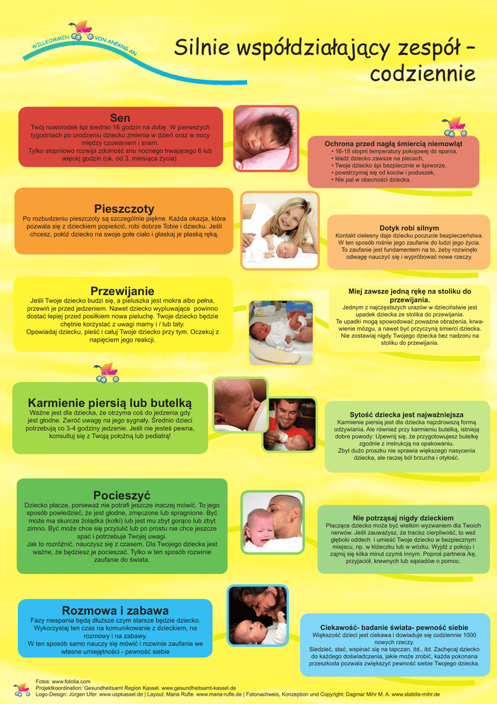 Silnie współdziałający zespół – codziennie Sen Twój noworodek śpi średnio 16 godzin na dobę. W pierwszych tygodniach po urodzeniu dziecko zmienia w dzień oraz w nocy między czuwaniem i snem. Tylko stopniowo rozwija zdolność snu nocnego trwającego 6 lub więcej godzin.(ok. od 3. miesiąca życia). Ochrona przed nagłą śmiercią niemowląt • 16-18 stopni temperatury pokojowej do spania, • kładź dziecko zawsze na plecach, • Twoje dziecko śpi bezpiecznie w śpiworze, • powstrzymaj się od koców i poduszek, • Nie pal w obecności dziecka. Pieszczoty Po rozbudzeniu pieszczoty są szczególnie piękne. Każda okazja, która pozwala się z dzieckiem popieścić, robi dobrze Tobie i dziecku. Jeśli chcesz, połóż dziecko na swoje gołe ciało i głaskaj je płaską ręką. Przewijanie Jeśli Twoje dziecko budzi się, a pieluszka jest mokra albo pełna, przewiń je przed jedzeniem. Nawet dziecko wypluwające powinno dostać lepiej przed posiłkiem nowa pieluchę. Twoje dziecko będzie chętnie korzystać z uwagi mamy i / lub taty. Opowiadaj dziecku, pieść i całuj Twoje dziecko przy tym. Oczekuj z napięciem jego reakcji. Karmienie piersią lub butelką Ważne jest dla dziecka, że otrzyma coś do jedzenia gdy jest głodne. Zwróć uwagę na jego sygnały. Średnio dzieci potrzebują co 3-4 godziny jedzenie. Jeśli nie jesteś pewna, konsultuj się z Twoją położną lub pediatrą! Dotyk robi silnym Kontakt cielesny daje dziecku poczucie bezpieczeństwa. W ten sposób rośnie jego zaufanie do ludzi jego życia. To zaufanie jest fundamentem na to, żeby rozwinęło odwagę nauczyć się i wypróbować nowe rzeczy. Miej zawsze jedną rękę na stoliku do przewijania. Jednym z najczęstszych urazów w dzieciństwie jest upadek dziecka ze stolika do przewijania. Te upadki mogą spowodować poważne obrażenia, krwawienie mózgu, a nawet być przyczyną śmierci dziecka. Nie zostawiaj nigdy Twojego dziecka bez nadzoru na stoliku do przewijania. Sytość dziecka jest najważniejsza Karmienie piersią jest dla dziecka najzdrowszą formą odżywiania. Ale również przy karmieniu butelką, istnieją dobre powody: Upewnij się, że przygotowujesz butelkę zgodnie z instrukcją na opakowaniu. Zbyt dużo proszku nie sprawia większego nasycenia dziecka, ale raczej ból brzucha i otyłość. Pocieszyć Dziecko płacze, ponieważ nie potrafi jeszcze inaczej mówić. To jego sposób powiedzieć, że jest głodne, zmęczone lub spragnione. Być może ma skurcze żołądka (kolki) lub jest mu zbyt gorąco lub zbyt zimno. Być może chce się przytulić lub po prostu nie chce jeszcze spać i potrzebuje Twojej uwagi. Jak to rozróżnić, nauczysz się z czasem. Dla Twojego dziecka jest ważne, że będziesz je pocieszać. Tylko w ten sposób rozwinie zaufanie do świata. Nie potrząsaj nigdy dzieckiem Płaczące dziecko może być wielkim wyzwaniem dla Twoich nerwów. Jeśli zauważysz, że tracisz cierpliwość, to weź głęboki oddech i umieść Twoje dziecko w bezpiecznym miejscu, np. w łóżeczku lub w wózku. Wyjdź z pokoju i zajmij się kilka minut czymś innym. Poproś partnera /kę, przyjaciół, krewnych lub sąsiadów o pomoc. Rozmowa i zabawa Fazy niespania będą dłuższe czym starsze będzie dziecko. Wykorzystaj ten czas na komunikowanie z dzieckiem, na rozmowy i na zabawy. W ten sposób samo nauczy się mówić i rozwinie zaufanie we własne umiejętności - pewność siebie Ciekawość- badanie świata- pewność siebie Większość dzieci jest ciekawa i dowiaduje się codziennie 1000 nowych rzeczy. Siedzieć, stać, wspinać się na tapczan, itd., itd. Zachęcaj dziecko do każdego doświadczenia, jakie może zrobić, każda pokonana przeszkoda pozwala zwiększyć pewność siebie Twojego dziecka. Fotos: www.fotolia.com Projektkoordination: Gesundheitsamt Region Kassel. www.gesundheitsamt-kassel.de Logo-Design: Jürgen Ufer. www.uspkassel.de | Layout: Maria Rufle. www.maria-rufle.de | Fotonachweis, Konzeption und Copyright: Dagmar Mihr M. A. www.stabilis-mihr.de
