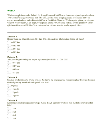 WISŁA Wisła to najdłuższa rzeka Polski. Jej długość wynosi 1047 km, a dorzecze zajmuje powierzchnię 194 424 km2z czego w Polsce 168 547 km2. Źródła rzeki znajdują się na wysokości 1107 m n.p.m. na zachodnim stoku Baraniej Góry w Beskidzie Śląskim. Wisła swoim głównym biegiem wiąże 6 województw, a jej dopływy zajmują około 54% obszaru Polski. Średni przepływ (przy ujściu rzeki) wynosi 1050 m3/s, a maksymalna różnica stanów wody wynosi 10 m. Zadanie 1. Rzeka Odra ma długość około 854 km. O ile kilometrów dłuższa jest Wisła od Odry? o 187 km o 193 km o 191 km o 183 km Zadanie 2. Jaka jest długość Wisły na mapie wykonanej w skali 1 : 1 000 000? 10,47 cm 104,7 cm 1047 cm 14,7 cm Zadanie 3. Średnia prędkość nurtu Wisły wynosi 3,2 km/h. Ile czasu zajmie flisakom spływ tratwą z Torunia do Bydgoszczy na odcinku długości 38,4 km? 9 godz. 11 godz. 12 godz. 13 godz. Zadanie 4. Koszt rejsu statkiem spacerowym po Wiśle dla 25 uczniów wyniósł 300 zł. Ile kosztował jeden bilet? 11 zł 15 zł 16 zł 12 zł Zadanie 5. Z Wisły do Bałtyku wpływa w ciągu sekundy około 1050 m3 wody. Ile m3 wody wpływa do Bałtyku w ciągu godziny? 63000 m3 1512000 m3 3780000 m3 105000 m3 Zadanie 6. Wędkarz na Wiśle złowił trzy ryby: szczupaka o wadze 2,45 kg, sandacza o wadze 1,83 kg i bolenia o wadze 1,78 kg. Jaka jest łączna waga trzech ryb? 6 kg i 6 dag 6 kg i 6 g 6 kg i 60 dag 6 kg i 600 g Zadanie 7. Rejs statkiem z Grudziądza do Gdańska trwa 5 godzin i 15 minut. Statek wyruszył o godzinie 9.30 i podczas rejsu zatrzymał się cztery razy na postoje po 10 minut. O której godzinie statek dotarł do Gdańska? 15.45 15.25 15.35 15.55 Zadanie 8. Jaką część Polski zajmują dopływy Wisły? około 1/2 około 3/4 około 1/3 około 1/5 Zadanie 9. Poziom wody w Wiśle podniósł się w porównaniu z poprzednim dniem o 1/10 i wynosi 220 cm. O ile cm podniósł się stan wody w Wiśle? o 10 cm o 20 cm o 5 cm o 25 cm Zadanie 10. Średnia roczna temperatura wody w Wiśle wynosi ok 9°C. W okresie zimowym średnia temperatura wynosi 2,2°C, a w okresie letnim średnia temperatura wody wynosi 16,1°C. Ile wynosi różnica temperatur wody między okresem letnim a zimowym? 13,7°C 14,9°C 14,1°C 13,9°C Zadanie 11. Rzeka Nil płynąca w Afryce ma długość ok 6670 km. O ile km dłuższa jest rzeka Nil od Wisły? Odp. km Zadanie 12. Korzystając z wyżej zawartej informacji oblicz jaka powierzchnia dorzecza Wisły jest poza granicami Polski? Odp. km2 Zadanie 13. Długość szlaku żeglownego Wisły, który od ujścia Przemszy koło Oświęcimia do Bałtyku wynosi 942 km. Grupa kajakarzy postanowiła spłynąć tym szlakiem. Ile dni zajął im spływ, jeśli codziennie pokonywali odległość 50 km? Odp. dni Zadanie 14. Oblicz rzeczywistą powierzchnię delty Wisły wiedząc, że na mapie w skali 1 : 1 000 000 zajmuje ona 35 cm2 Odp. km2 Zadanie 15. Za 40-minutowy rejs po Wiśle statkiem Wanda w Toruniu dorośli płacą 14 zł, a dzieci i młodzież po 10 zł. Jaki jest koszt rejsu dla grupy liczącej 37 uczniów i 4 opiekunów? Odp. zł