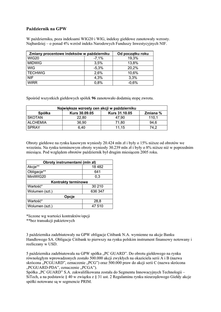 Październik na GPW W październiku, poza indeksami WIG20 i WIG, indeksy giełdowe zanotowały wzrosty. Najbardziej – o ponad 4% wzrósł indeks Narodowych Funduszy Inwestycyjnych NIF. Zmiany procentowe indeksów w październiku WIG20 -7,1% MIDWIG 3,5% WIG -5,3% TECHWIG 2,6% NIF 4,3% WIRR 0,8% Od początku roku 19,3% 13,8% 20,2% 10,6% 3,3% -0,6% Spośród wszystkich giełdowych spółek 96 zanotowało dodatnią stopę zwrotu. Spółka SKOTAN ALCHEMIA SPRAY Największe wzrosty cen akcji w październiku Kurs 30.09.05 Kurs 31.10.05 22,80 47,90 36,90 71,80 6,40 11,15 Zmiana % 110,1 94,6 74,2 Obroty giełdowe na rynku kasowym wyniosły 20.424 mln zł i były o 15% niższe od obrotów we wrześniu. Na rynku terminowym obroty wyniosły 30.239 mln zł i były o 8% niższe niż w poprzednim miesiącu. Pod względem obrotów październik był drugim miesiącem 2005 roku. Obroty instrumentami (mln zł) Akcje** 18 482 Obligacje** 641 MiniWIG20 0,3 Kontrakty terminowe Wartość* 30 210 Wolumen (szt.) 636 347 Opcje Wartość* 28,8 Wolumen (szt.) 47 510 *liczone wg wartości kontraktów/opcji **bez transakcji pakietowych 3 października zadebiutowały na GPW obligacje Citibank N.A. wymienne na akcje Banku Handlowego SA. Obligacje Citibank to pierwszy na rynku polskim instrument finansowy notowany i rozliczany w USD. 5 października zadebiutowała na GPW spółka „PC GUARD”. Do obrotu giełdowego na rynku równoległym wprowadzonych zostało 500.000 akcji zwykłych na okaziciela serii A i B (nazwa skrócona „PCGUARD”, oznaczenie „PCG”) oraz 500.000 praw do akcji serii C (nazwa skrócona „PCGUARD-PDA”, oznaczenie „PCGA”). Spółka „PC GUARD” S.A. zakwalifikowana została do Segmentu Innowacyjnych Technologii – SiTech, a na podstawie § 40 w związku z § 31 ust. 2 Regulaminu rynku nieurzędowego Giełdy akcje spółki notowane są w segmencie PRIM. „PC GUARD” S.A. tworzy i wdraża oprogramowanie wspomagające proces zarządzania przedsiębiorstwem pod wspólną nazwą Graffiti. 5 października po raz ostatni notowane były obligacje zamienne spółki SAGITTARIUS - STRZELEC S.A. (nazwa skrócona STCOB0409). Na sesji w dniu 6 października 2005 wolumen obrotu kontraktami terminowymi wyniósł 54.877 sztuk i jest to największa wartość w historii notowań tych instrumentów na GPW. 10 października rozpoczął działanie na giełdzie na rynku podstawowym i równoległym członek giełdy CONCORDE SECURITIES LIMITED. Od 13 października akcje spółki MUZA S.A. notowane są w systemie notowań ciągłych (wcześniej były notowane w systemie notowań jednolitych z dwukrotnym określaniem kursu). W dniach 13 – 15 października odbyło się XI Polskie Forum Kapitałowo-Finansowe „Twoje Pieniądze”. 13 października 2005 roku został przeprowadzony w ramach publicznej subskrypcji przydział 1.876.500 akcji nowej emisji spółki Zakłady Azotowe „Puławy” S.A oferowanych w Transzy Inwestorów Indywidualnych. W ramach publicznej subskrypcji akcji spółki Zakłady Azotowe „Puławy” S.A. w Transzy Inwestorów Indywidualnych zostało złożonych łącznie 14.734 zleceń kupna na łączną liczbę 46.914.817 akcji. Przydziału akcji dokonano po cenie 54 zł. Średnia stopa redukcji dla zleceń kupna wyniosła 96%. 14 października wolumen obrotu opcjami na sesji wyniósł 4.883 sztuki i był najwyższy od dnia wprowadzenia tego instrumentu do notowań na GPW. Na sesji giełdowej w dniu 17 października po raz pierwszy notowane były certyfikaty inwestycyjne serii A wyemitowane przez KBC ZŁOTY DOLAR FUNDUSZ INWESTYCYJNY ZAMKNIĘTY (nazwa skrócona „KBCZDRFIZ”). 17 października na warszawskiej Giełdzie zadebiutował nowy instrument - opcje na akcje. W obrocie znalazły się opcje na akcje 5 spółek: PKN ORLEN, Telekomunikacji Polskiej, KGHM, PROKOM, PEKAO. Pierwszego dnia notowań wolumen obrotu nowym instrumentem wyniósł 86 sztuk, a wartość obrotu osiągnęła poziom 117,35 tys. zł. 18 października po raz pierwszy notowane były obligacje 1-roczne na okaziciela serii A123 Banku BPH S.A. o terminie wykupu 11 lipca 2006 r. (nazwa skrócona BPHOB0706). Z dniem 18 października został zmieniony system notowań dla akcji INSTAL KRAKÓW S.A. z notowań jednolitych z dwukrotnym określaniem kursu na notowania ciągłe. 19 października zadebiutowała na GPW spółka ZAKŁADY AZOTOWE „PUŁAWY” S.A.. Do obrotu giełdowego na rynku podstawowym wprowadzonych zostało 5.515.000 (pięć milionów pięćset piętnaście tysięcy) praw do akcji zwykłych na okaziciela serii B (nazwa skrócona „PULAWY-PDA”, oznaczenie „ZAPA”). Działalność spółki „PUŁAWY” S.A. prowadzona jest w dwóch podstawowych segmentach produktów nawozowych oraz produktów nienawozowych (głównie chemikaliów), które trafiają bezpośrednio do odbiorców końcowych lub są przetwarzane dalej. 20 października po raz ostatni notowane były trzyletnie obligacje skarbowe o zmiennej stopie procentowej i terminie wykupu 5 listopada 2005 r. (nazwa skrócona TZ1105) 20 października po raz ostatni notowane były obligacje 1-roczne na okaziciela serii A118 Banku BPH S.A. o terminie wykupu 8 listopada 2005 r. (nazwa skrócona BPHOB1105). 20 października zadebiutowała na GPW spółka TELL S.A.. Do obrotu giełdowego na rynku podstawowym wprowadzonych zostało 350.000 (trzysta pięćdziesiąt tysięcy) praw do akcji zwykłych na okaziciela serii B (nazwa skrócona „TELL-PDA”, oznaczenie „TELA”). Spółka TELL S.A.. jest Autoryzowanym Przedstawicielem Ogólnopolskim PTK Centertel. Działa na rynku sprzedaży detalicznej usług telefonii komórkowej. 21 października spółka WIELKOPOLSKIE FABRYKI MEBLI S.A. została oznaczona w sposób szczególny poprzez umieszczenie przy nazwie spółki odnośnika w postaci liczby porządkowej oznaczającej: „emitent złożył do sądu wniosek o ogłoszenie swojej upadłości”. W związku ze zmianą nazwy spółki COMP RZESZÓW na ASSECO P
