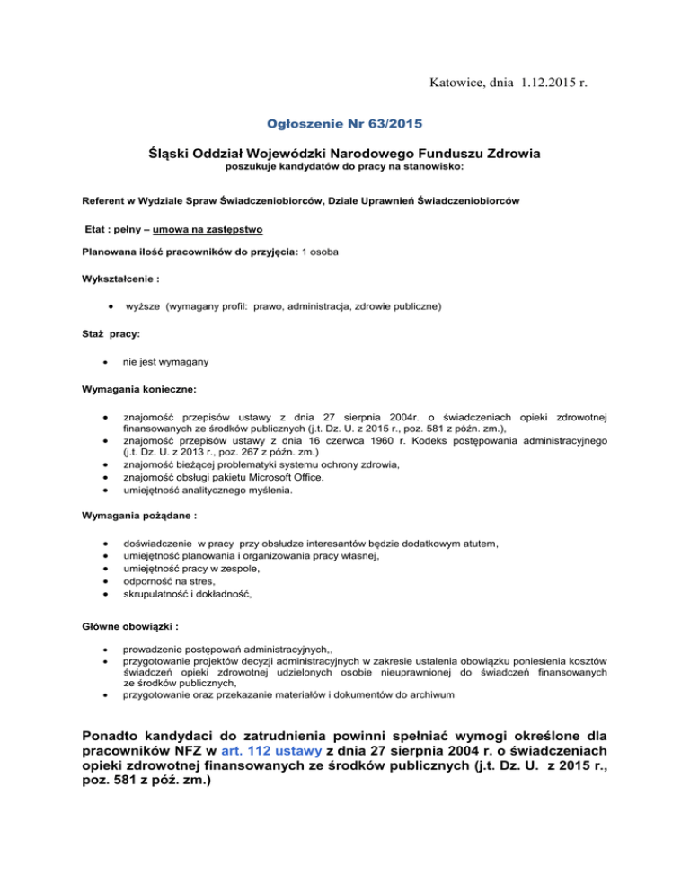 Katowice, dnia 1.12.2015 r. Ogłoszenie Nr 63/2015 Śląski Oddział Wojewódzki Narodowego Funduszu Zdrowia poszukuje kandydatów do pracy na stanowisko: Referent w Wydziale Spraw Świadczeniobiorców, Dziale Uprawnień Świadczeniobiorców Etat : pełny – umowa na zastępstwo Planowana ilość pracowników do przyjęcia: 1 osoba Wykształcenie : wyższe (wymagany profil: prawo, administracja, zdrowie publiczne) Staż pracy: nie jest wymagany Wymagania konieczne: znajomość przepisów ustawy z dnia 27 sierpnia 2004r. o świadczeniach opieki zdrowotnej finansowanych ze środków publicznych (j.t. Dz. U. z 2015 r., poz. 581 z późn. zm.), znajomość przepisów ustawy z dnia 16 czerwca 1960 r. Kodeks postępowania administracyjnego (j.t. Dz. U. z 2013 r., poz. 267 z późn. zm.) znajomość bieżącej problematyki systemu ochrony zdrowia, znajomość obsługi pakietu Microsoft Office. umiejętność analitycznego myślenia. Wymagania pożądane : doświadczenie w pracy przy obsłudze interesantów będzie dodatkowym atutem, umiejętność planowania i organizowania pracy własnej, umiejętność pracy w zespole, odporność na stres, skrupulatność i dokładność, Główne obowiązki : prowadzenie postępowań administracyjnych,, przygotowanie projektów decyzji administracyjnych w zakresie ustalenia obowiązku poniesienia kosztów świadczeń opieki zdrowotnej udzielonych osobie nieuprawnionej do świadczeń finansowanych ze środków publicznych, przygotowanie oraz przekazanie materiałów i dokumentów do archiwum Ponadto kandydaci do zatrudnienia powinni spełniać wymogi określone dla pracowników NFZ w art. 112 ustawy z dnia 27 sierpnia 2004 r. o świadczeniach opieki zdrowotnej finansowanych ze środków publicznych (j.t. Dz. U. z 2015 r., poz. 581 z póź. zm.) Wymagane dokumenty : list motywacyjny i życiorys (CV) opatrzony własnoręcznym podpisem dokumenty potwierdzające wykształcenie, odbyte kursy i szkolenia (kopie) kwestionariusz osobowy dla osoby ubiegającej się o pracę *wzór do pobrania dokumenty potwierdzające dotychczasowe zatrudnienie - świadectwa/o pracy (a w przypadku pozostawania w zatrudnieniu – aktualne zaświadczenie o zatrudnieniu) oświadczenia kandydata o: wyrażeniu zgody na przetwarzanie danych osobowych zawartych w ofercie pracy w zakresie niezbędnym do przeprowadzenia rekrutacji, korzystaniu w pełni z praw publicznych i o niekaralności za przestępstwo popełnione umyślnie oraz spełnieniu wymogów wynikających z art.112 ustawy z dnia 27 sierpnia 2004r. o świadczeniach opieki zdrowotnej finansowanych ze środków publicznych *wzór do pobrania Inne informacje : Aplikacje należy przesłać lub dostarczyć w terminie do 14 dni od daty ukazania się ogłoszenia na adres: Śląski Oddział Wojewódzki Narodowego Funduszu Zdrowia, 40-844 Katowice, ul. Kossutha 13 Wydział Organizacyjny, Kadr i Szkoleń, pokój 5.21a (Dokumenty należy składać w biurze podawczym na parterze) z dopiskiem: Oferta pracy Nr 63/2015 na stanowisko referent w Wydziale Spraw Świadczeniobiorców, Dziale Uprawnień Świadczeniobiorców. Informacje telefoniczne pod nr 32/735-15-68 Aplikacje niekompletne, niezgodne z wymogami zawartymi w ogłoszeniu oraz po upływie wyżej określonego terminu nie będą rozpatrywane (liczy się data wpływu do Śląskiego OW NFZ). Kandydaci spełniający wymogi formalne zostaną powiadomieni o terminie spotkania rekrutacyjnego. Dokumentów aplikacyjnych nie zwracamy. Informacja o wynikach naboru zostanie umieszczona w Biuletynie Informacji Publicznej na stronie www.nfz-katowice.pl oraz tablicy ogłoszeń w siedzibie Oddziału, Katowice, ul. Kossutha 13 V p.