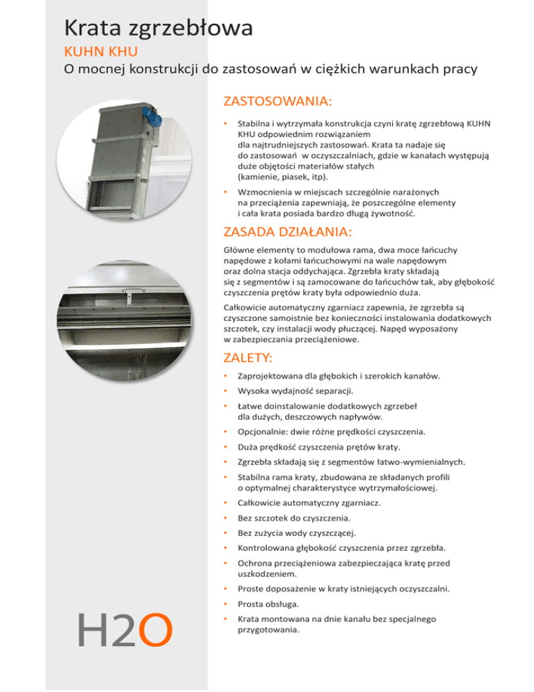 Krata zgrzebłowa KUHN KHU O mocnej konstrukcji do zastosowań w ciężkich warunkach pracy ZASTOSOWANIA: • Stabilna i wytrzymała konstrukcja czyni kratę zgrzebłową KUHN KHU odpowiednim rozwiązaniem dla najtrudniejszych zastosowań. Krata ta nadaje się do zastosowań w oczyszczalniach, gdzie w kanałach występują duże objętości materiałów stałych (kamienie, piasek, itp). • Wzmocnienia w miejscach szczególnie narażonych na przeciążenia zapewniają, że poszczególne elementy i cała krata posiada bardzo długą żywotność. ZASADA DZIAŁANIA: Główne elementy to modułowa rama, dwa moce łańcuchy napędowe z kołami łańcuchowymi na wale napędowym oraz dolna stacja oddychająca. Zgrzebła kraty składają się z segmentów i są zamocowane do łańcuchów tak, aby głębokość czyszczenia prętów kraty była odpowiednio duża. Całkowicie automatyczny zgarniacz zapewnia, że zgrzebła są czyszczone samoistnie bez konieczności instalowania dodatkowych szczotek, czy instalacji wody płuczącej. Napęd wyposażony w zabezpieczania przeciążeniowe. ZALETY: • Zaprojektowana dla głębokich i szerokich kanałów. • Wysoka wydajność separacji. • Łatwe doinstalowanie dodatkowych zgrzebeł dla dużych, deszczowych napływów. • Opcjonalnie: dwie różne prędkości czyszczenia. • Duża prędkość czyszczenia prętów kraty. • Zgrzebła składają się z segmentów łatwo-wymienialnych. • Stabilna rama kraty, zbudowana ze składanych profili o optymalnej charakterystyce wytrzymałościowej. • Całkowicie automatyczny zgarniacz. • Bez szczotek do czyszczenia. • Bez zużycia wody czyszczącej. • Kontrolowana głębokość czyszczenia przez zgrzebła. • Ochrona przeciążeniowa zabezpieczająca kratę przed uszkodzeniem. • Proste doposażenie w kraty istniejących oczyszczalni. • Prosta obsługa. • Krata montowana na dnie kanału bez specjalnego przygotowania. KONSTRUKCJA I WŁAŚCIWOŚCI TECHNICZNE: Zgarniacz, w pełni automatyczny Optymalne czyszczenie zgrzebła i przesył do leja zrzutowego Duża objętość leja zrzutowego Prosty i bezpieczny przesył skratek Napęd z ochroną przeciążeniową Optymalna budowa dla wszystkich przypadków zastosowań Pokrywy hermetyczne, zdejmowane Gwarancja pełnej hermetyzacji odorów i drobnoustrojów Klapy serwisowe Bardzo mocne łańcuchy napędowe Dostępne ze stali nierdzewnej Opcjonalnie z materiałów kompozytowych Rama systemowa, stal nierdzewna Optymalne dostosowanie do każdego kanału Ruszt kraty, wybór prześwitu kraty dowolny wybór szerokości prześwitu dla wszystkich zastosowań Profile prętów, optymalne charakterystyki przepływu Dla maksymalnych przepustowości Zgrzebła, segmentowe Zamontowane eko-łożyska Ciągłe smarowanie, niezawodne i bezobsługowe. WYMIARY Głęboka penetracja zapobiega zatykaniu i uzyskuje się optymalne wyniki oczyszczania MATERIAŁY STANDARDOWE Szerokość koryta do max. 4m Korpus urządzenia, pokrywy AISI 304 stal nierdzewna Głębokość koryta do max. 15m Profile prętów AISI 304 stal nierdzewna Łańcuch AISI 304 stal nierdzewna Szerokość prześwitu 6 – 25 mm NAPĘD Inne wykonania materiałowe dostępne na zamówienie. Klasa zabezpieczenia IP 55 (możliwe wykonanie w wersji Eex) ul. Hajoty 61 • 01-821 Warszawa • tel: 22 897 00 30, 22 897 00 31 • fax: 22 897 00 32 • [email protected] • www.h2-o.com.pl