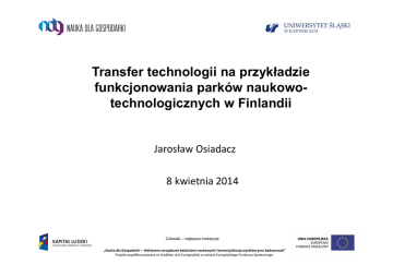 Transfer technologii na przykładzie funkcjonowania parków naukowotechnologicznych w Finlandii Jarosław Osiadacz 8 kwietnia 2014 Człowiek – najlepsza inwestycja „Nauka dla Gospodarki – efektywne zarządzanie badaniami naukowymi i komercjalizacja wyników prac badawczych” Projekt współfinansowany ze środków Unii Europejskiej w ramach Europejskiego Funduszu Społecznego. Plan prezentacji • Finlandia jako lider innowacyjności • Innowacyjność napędzana transferem technologii • Rola parków naukowo-technologicznych we wspieraniu innowacyjności • Fiński model wykorzystania parków technologicznych w transferze technologii • Wnioski i rekomendacje Człowiek – najlepsza inwestycja „Nauka dla Gospodarki – efektywne zarządzanie badaniami naukowymi i komercjalizacja wyników prac badawczych” Projekt współfinansowany ze środków Unii Europejskiej w ramach Europejskiego Funduszu Społecznego. Finlandia jako lider innowacyjności Człowiek – najlepsza inwestycja „Nauka dla Gospodarki – efektywne zarządzanie badaniami naukowymi i komercjalizacja wyników prac badawczych” Projekt współfinansowany ze środków Unii Europejskiej w ramach Europejskiego Funduszu Społecznego. Źródło: Innovation Union Scoreboard 2013. http://ec.europa.eu/enterprise/policies/innovation/files/ius-2013_en.pdf Człowiek – najlepsza inwestycja „Nauka dla Gospodarki – efektywne zarządzanie badaniami naukowymi i komercjalizacja wyników prac badawczych” Projekt współfinansowany ze środków Unii Europejskiej w ramach Europejskiego Funduszu Społecznego. Źródło: Innovation Union Scoreboard 2013. http://ec.europa.eu/enterprise/policies/innovation/files/ius-2013_en.pdf Człowiek – najlepsza inwestycja „Nauka dla Gospodarki – efektywne zarządzanie badaniami naukowymi i komercjalizacja wyników prac badawczych” Projekt współfinansowany ze środków Unii Europejskiej w ramach Europejskiego Funduszu Społecznego. Źródło: Innovation Union Scoreboard 2013. http://ec.europa.eu/enterprise/policies/innovation/files/ius-2013_en.pdf Człowiek – najlepsza inwestycja „Nauka dla Gospodarki – efektywne zarządzanie badaniami naukowymi i komercjalizacja wyników prac badawczych” Projekt współfinansowany ze środków Unii Europejskiej w ramach Europejskiego Funduszu Społecznego. Źródło: Innovation Union Scoreboard 2013. http://ec.europa.eu/enterprise/policies/innovation/files/ius-2013_en.pdf Człowiek – najlepsza inwestycja „Nauka dla Gospodarki – efektywne zarządzanie badaniami naukowymi i komercjalizacja wyników prac badawczych” Projekt współfinansowany ze środków Unii Europejskiej w ramach Europejskiego Funduszu Społecznego. Innowacyjność napędzana transferem technologii Człowiek – najlepsza inwestycja „Nauka dla Gospodarki – efektywne zarządzanie badaniami naukowymi i komercjalizacja wyników prac badawczych” Projekt współfinansowany ze środków Unii Europejskiej w ramach Europejskiego Funduszu Społecznego. Innowacja zamknięta IDEA B+R PRODUKCJA SPRZEDAŻ & MARKETING PROCES INNOWACYJNY Źródło: H.W. Chesbrough: Open Innovation. The New Imperative for Creating and Profiting from Technology. Boston–Massachusttes, Harvard Business Press, 2006 Człowiek – najlepsza inwestycja „Nauka dla Gospodarki – efektywne zarządzanie badaniami naukowymi i komercjalizacja wyników prac badawczych” Projekt współfinansowany ze środków Unii Europejskiej w ramach Europejskiego Funduszu Społecznego. Lejek innowacyjny Innowacyjność „stanowi cechę podmiotów gospodarczych lub gospodarek, oznaczającą zdolność do tworzenia oraz wdrażania innowacji, jak również ich absorpcji, wiążącą się z aktywnym angażowaniem się w procesy innowacyjne i podejmowanie działań w tym kierunku. Oznacza również zaangażowanie w zdobywanie zasobów i umiejętności niezbędnych do uczestniczenia w tych procesach. Źródło: AMR Research „The Consumer Goods Innovation Funnel” Harvard Business Review, May 22nd, 2009 http://web.hbr.org/email/archive/dailystat.php?date=052209 Definicje za: „Innowacje i transfer technologii - SŁOWNIK POJĘĆ” pod redakcją Krzysztofa B. Matusiaka, Wydanie drugie rozszerzone, Polska Agencja Rozwoju Przedsiębiorczości; Warszawa 2011] Człowiek – najlepsza inwestycja „Nauka dla Gospodarki – efektywne zarządzanie badaniami naukowymi i komercjalizacja wyników prac badawczych” Projekt współfinansowany ze środków Unii Europejskiej w ramach Europejskiego Funduszu Społecznego. Innowacja otwarta Transfer Technologii to przekazywanie określonej wiedzy technicznej i organizacyjnej i związanej z nią know-how celem gospodarczego wykorzystania. To przekazanie informacji niezbędnych, aby jeden podmiot był w stanie powielać pracę innego podmiotu Komercjalizację technologii można określić jako celowe, ukierunkowane przekazywanie wiedzy i umiejętności z procesu B&R do procesu innowacyjnego, celem udanego jej urynkowienia w postaci produktu. To całokształt działań związanych z przekształcaniem wiedzy w nowe produkty, technologie i rozwiązania organizacyjne. IDEA B+R PRODUKCJA SPRZEDAŻ & MARKETING PROCES INNOWACYJNY Źródło: H.W. Chesbrough: Open Innovation. The New Imperative for Creating and Profiting from Technology. Boston–Massachusttes, Harvard Business Press, 2006. Definicje za: „Innowacje i transfer technologii - SŁOWNIK POJĘĆ” pod redakcją Krzysztofa B. Matusiaka, Wydanie drugie rozszerzone, Polska Agencja Rozwoju Przedsiębiorczości; Warszawa 2011] Człowiek – najlepsza inwestycja „Nauka dla Gospodarki – efektywne zarządzanie badaniami naukowymi i komercjalizacja wyników prac badawczych” Projekt współfinansowany ze środków Unii Europejskiej w ramach Europejskiego Funduszu Społecznego. Rola parków naukowotechnologicznych we wspieraniu innowacyjności Człowiek – najlepsza inwestycja 12 „Nauka dla Gospodarki – efektywne zarządzani