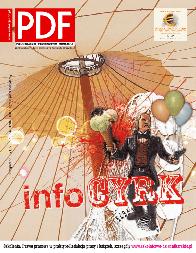 www.redakcjaPDF.pl DODATEK SPECJALNY 02/2009 POLSKA DROGA DO EURO Projekt dofinansowany ze środków Narodowego Banku Polskiego listopad nr 8 (21)/2009 • ISSN 1898–3480 • egzemplarz bezpłatny pismo warsztatowe Instytutu Dziennikarstwa Uniwersytetu Warszawskiego Szkolenia: Prawo prasowe w praktyce/Redakcja prasy i książek, szczegóły www.szkolnictwo-dziennikarskie.pl dziennikarstwo | Słowo – Obraz Naczelna strona współpraca: Jan Brykczyński, Aleksandra Gałka, Sylwia Książek, Łukasz Miedziejewski, Pulina Pawlak, Maciej Puchała, Aleksandra Solarska, Maria I. Szulc autorskie cykle: Gdzie sie zaczęłam - Magdalena Karst-Adamczyk Zapisz to, Kisch! - Agnieszka Wojcińska Kolumna Zygmunta - Andrzej Zygmuntowicz projekt graficzny, okładka i skład DTP: Karol Grzywaczewski / [email protected] korekta: Joanna Maria Sawicka WYDAWCA: Instytut Dziennikarstwa Uniwersytetu Warszawskiego koordynator wydawcy: Grażyna Oblas druk: Polskapresse Sp. z o.o., nakład: 10 tys. egz. Na przesuwających się w dole ekranu paskach telewizyjnych serwisów informacyjnych co jakiś czas można natknąć się na wiadomość w rodzaju: w indyjskim stanie Madhya Pradesh przepełniony autobus spadł z górskiej drogi, kilkunastu pasażerów jest rannych, w tym troje ciężko. Innym razem jest to indonezyjska wyspa Celebes i pociąg, który zderzył się z ciężarówką, albo Chiny i obsunięty wysoki brzeg rzeki. Te tragiczne wieści wplatane są między „zwykłe” doniesienia o spotkaniach polityków, wyborach prezydenckich i premierach filmo- MINUS Anita Krajewska Powtórka z Orsona Wellesa adres redakcji: PDF pismo warsztatowe Instytutu Dziennikarstwa UW ul. Nowy Świat 69, pok. 51, (IV piętro), 00–046 Warszawa, tel. 022 5520293, e–mail: [email protected] PLUS Więcej tekstów w portalu internetowym: www.redakcjaPDF.pl współpraca z serwisem foto: stała współpraca: Teksty na stronach 6, 11, 13 powstały pod kierunkiem redaktora stażu redakcyjnego, prowadzonego przez redakcję PDF, w ramach przedmiotu Podstawy informacji dziennikarskiej w Instytucie Dziennikarstwa UW. Piszesz, fotografujesz, interesujesz się PR? Szukamy współpracowników. Kolegia redakcyjne, każda środa godz. 18:30 Instytut Dziennikarstwa UW, sala 313 (III piętro) | 02 | zdanie, które brzmiało mniej więcej następująco: „Gdy widzimy taką tragedię, to wszystkie inne sprawy przestają mieć znaczenie”. Stacja zdążyła nawet połączyć się z dwoma korespondentami w USA, którzy w swoich wejściach na żywo relacjonowali jedynie to, co sami widzieli w CNN, czyli to, co my w TVN 24. Oglądałam to i nie wierzyłam własnym oczom. Telewizja robi obecnie spektakl ze wszystkiego i nie potrafi już zachować jakiegokolwiek dystansu do rzeczywistości. Mam nadzieję, że prezenter i wydawcy mieli podobną refleksję, kiedy okazało się, że chłopca w środku nie było, a wszystko zostało najprawdopodobniej wyreżyserowane przez szalonego ojca Falcona. Mówiąc inaczej – mam nadzieję, że było im głupio. Godne potępienia jest to, że Amerykanin postawił na nogi połowę policji i wojska stanowego. Ale może mężczyzna przypomniał też dziennikarzom, że warto być trochę bardziej zdystansowanym i krytycznym wobec świata, bo zagrał im na nosie. To pewnie zbyt daleko idące porównanie, ale taka analogia nasuwa mi się w tyle głowy: daliśmy się nabrać ojcu Falcona tak, jak mieszkańcy New Jersey 70 lat temu, gdy słuchając radiowej adaptacji „Wojny światów” Orsona Wellesa, w panice próbowali ratować się przed inwazją Marsjan. Przedstawiciele mediów przed domem rodziny Heeney w Fort Collins, Colorado, USA 16 października 2009 roku. Richard Henne samodzielnie zbudował balon, którego lot transmitowała na żywo większość telewizji na świecie. W balonie miał być 6-letni syn Falcon Heene. 15 października świat wstrzymał oddech i po raz kolejny skierował wzrok na Stany Zjednoczone. Telewidzowie wszystkich stacji informacyjnych przez kilkanaście minut śledzili sunący po niebie srebrny balon, kształtem przypominający latający talerz, podobno z sześcioletnim Falkonem Heenem w środku. Przyznaję - sama także przyglądałam się tej podniebnej wyprawie, co więcej, przeskakiwałam między kanałami, by zobaczyć, czy zwariował tylko Bogdan Rymanowski w TVN24, czy także prowadzący w innych telewizjach. Rymanowski – przypominam: Dziennikarz Roku 2008 – w porównaniu do swoich kolegów po fachu, wyjątkowo usiłował podkręcić dramatyzm sytuacji. Niestety, efekt był odwrotny – wyszło raczej żałośnie. Czemu? Prezenter nie był w studiu sam. Kamery zaczęły śledzić lot balonu w chwili (swoją drogą całe wydarzenie po raz kolejny udowodniło, że żyjemy w świecie bez granic i media w sekundzie są w stanie uczynić z nas uczestników każdego wydarzenia), gdy w TVN o PZPN dyskutowali m.in. Olaf Lubaszenko i Jan Tomaszewski (był w studiu poza Warszawą i w ogóle nie wiedział, skąd całe zamieszanie). Dysputę panów o kondycji polskiej piłki co chwilę przerywał Rymanowski, komentując na gorąco to, co widział na ekranie: „Czy w środku jest sześcioletni chłopiec?”, „Proszę państwa, cały świat patrzy teraz na dramat. Co panowie sądzą na ten temat?” – zapytał w pewnym momencie swoich gości. Oczywiście, goście - obeznani z występami przed kamerą - wczuli się błyskawicznie w sytuację i wtórowali dziennikarzowi. Zapamiętałam Kto dla kogo drukuje? W jedną z październikowych niedziel w programie TVN 24 „Loża prasowa” gościli m.in. Piotr Gabryel z „Rzeczpospolitej” i Piotr Stasiński z „Gazety Wyborczej”. Przysłuchiwałam się raczej znudzona do momentu, w którym wicenaczelny „Wyborczej” powiedział: - „Gazeta” nie jest drukarką CBA. W tym momencie ożywiła się nawet prowadząca program Małgorzata Łaszcz. – Sugeruje pan, że „Rzeczpospolita” jest drukarką CBA? – spytała. Stasiński,