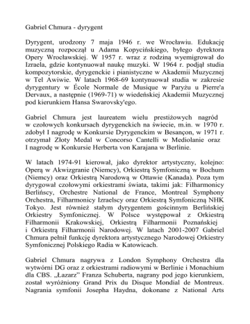 Gabriel Chmura - dyrygent Dyrygent, urodzony 7 maja 1946 r. we Wrocławiu. Edukację muzyczną rozpoczął u Adama Kopycińskiego, byłego dyrektora Opery Wrocławskiej. W 1957 r. wraz z rodziną wyemigrował do Izraela, gdzie kontynuował naukę muzyki. W 1964 r. podjął studia kompozytorskie, dyrygenckie i pianistyczne w Akademii Muzycznej w Tel Awiwie. W latach 1968-69 kontynuował studia w zakresie dyrygentury w École Normale de Musique w Paryżu u Pierre'a Dervaux, a następnie (1969-71) w wiedeńskiej Akademii Muzycznej pod kierunkiem Hansa Swarovsky'ego. Gabriel Chmura jest laureatem wielu prestiżowych nagród w czołowych konkursach dyrygenckich na świecie, m.in. w 1970 r. zdobył I nagrodę w Konkursie Dyrygenckim w Besançon, w 1971 r. otrzymał Złoty Medal w Concorso Cantelli w Mediolanie oraz I nagrodę w Konkursie Herberta von Karajana w Berlinie. W latach 1974-91 kierował, jako dyrektor artystyczny, kolejno: Operą w Akwizgranie (Niemcy), Orkiestrą Symfoniczną w Bochum (Niemcy) oraz Orkiestrą Narodową w Ottawie (Kanada). Poza tym dyrygował czołowymi orkiestrami świata, takimi jak: Filharmonicy Berlińscy, Orchestre National de France, Montreal Symphony Orchestra, Filharmonicy Izraelscy oraz Orkiestrą Symfoniczną NHK Tokyo. Jest również stałym dyrygentem gościnnym Berlińskiej Orkiestry Symfonicznej. W Polsce występował z Orkiestrą Filharmonii Krakowskiej, Orkiestrą Filharmonii Poznańskiej i Orkiestrą Filharmonii Narodowej. W latach 2001-2007 Gabriel Chmura pełnił funkcję dyrektora artystycznego Narodowej Orkiestry Symfonicznej Polskiego Radia w Katowicach. Gabriel Chmura nagrywa z London Symphony Orchestra dla wytwórni DG oraz z orkiestrami radiowymi w Berlinie i Monachium dla CBS. „Łazarz” Franza Schuberta, nagrany pod jego kierunkiem, został wyróżniony Grand Prix du Disque Mondial de Montreux. Nagrania symfonii Josepha Haydna, dokonane z National Arts Centre Orchestra dla CBS, zostały uznane za "Best Choice" przez American Record Guide i zyskały nominację do kanadyjskiej nagrody "Juno". W Operze Narodowej przygotował premierę „Fausta” Gounoda” (2008).