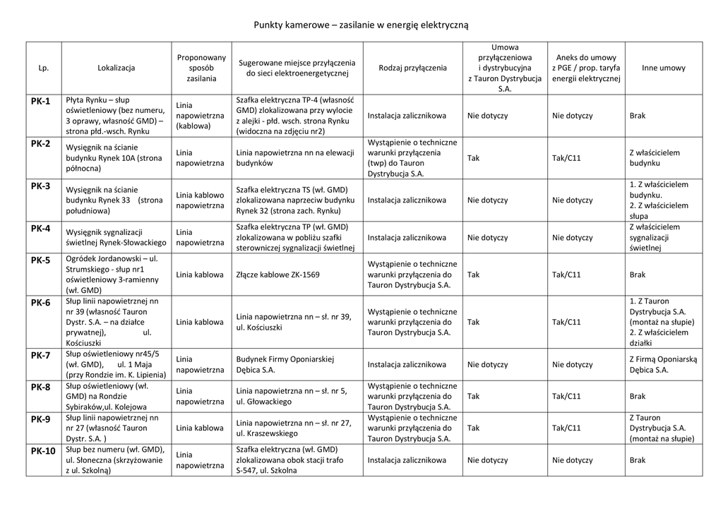 Punkty kamerowe – zasilanie w energię elektryczną Lp. PK-1 PK-2 PK-3 PK-4 PK-5 PK-6 PK-7 PK-8 PK-9 PK-10 Umowa przyłączeniowa i dystrybucyjna z Tauron Dystrybucja S.A. Aneks do umowy z PGE / prop. taryfa energii elektrycznej Instalacja zalicznikowa Nie dotyczy Nie dotyczy Brak Wystąpienie o techniczne warunki przyłączenia (twp) do Tauron Dystrybucja S.A. Tak Tak/C11 Z właścicielem budynku Lokalizacja Proponowany sposób zasilania Sugerowane miejsce przyłączenia do sieci elektroenergetycznej Rodzaj przyłączenia Płyta Rynku – słup oświetleniowy (bez numeru, 3 oprawy, własność GMD) – strona płd.-wsch. Rynku Linia napowietrzna (kablowa) Szafka elektryczna TP-4 (własność GMD) zlokalizowana przy wylocie z alejki - płd. wsch. strona Rynku (widoczna na zdjęciu nr2) Wysięgnik na ścianie budynku Rynek 10A (strona północna) Linia napowietrzna Linia napowietrzna nn na elewacji budynków Wysięgnik na ścianie budynku Rynek 33 (strona południowa) Linia kablowo napowietrzna Szafka elektryczna TS (wł. GMD) zlokalizowana naprzeciw budynku Rynek 32 (strona zach. Rynku) Instalacja zalicznikowa Nie dotyczy Nie dotyczy Wysięgnik sygnalizacji świetlnej Rynek-Słowackiego Linia napowietrzna Szafka elektryczna TP (wł. GMD) zlokalizowana w pobliżu szafki sterowniczej sygnalizacji świetlnej Instalacja zalicznikowa Nie dotyczy Nie dotyczy Linia kablowa Złącze kablowe ZK-1569 Wystąpienie o techniczne warunki przyłączenia do Tauron Dystrybucja S.A. Tak Tak/C11 Brak Linia kablowa Linia napowietrzna nn – sł. nr 39, ul. Kościuszki Wystąpienie o techniczne warunki przyłączenia do Tauron Dystrybucja S.A. Tak Tak/C11 1. Z Tauron Dystrybucja S.A. (montaż na słupie) 2. Z właścicielem działki Linia napowietrzna Budynek Firmy Oponiarskiej Dębica S.A. Instalacja zalicznikowa Nie dotyczy Nie dotyczy Z Firmą Oponiarską Dębica S.A. Linia napowietrzna Linia napowietrzna nn – sł. nr 5, ul. Głowackiego Tak Tak/C11 Brak Linia kablowa Linia napowietrzna nn – sł. nr 27, ul. Kraszewskiego Tak Tak/C11 Z Tauron Dystrybucja S.A. (montaż na słupie) Linia napowietrzna Szafka elektryczna (wł. GMD) zlokalizowana obok stacji trafo S-547, ul. Szkolna Nie dotyczy Nie dotyczy Brak Ogródek Jordanowski – ul. Strumskiego - słup nr1 oświetleniowy 3-ramienny (wł. GMD) Słup linii napowietrznej nn nr 39 (własność Tauron Dystr. S.A. – na działce prywatnej), ul. Kościuszki Słup oświetleniowy nr45/5 (wł. GMD), ul. 1 Maja (przy Rondzie im. K. Lipienia) Słup oświetleniowy (wł. GMD) na Rondzie Sybiraków,ul. Kolejowa Słup linii napowietrznej nn nr 27 (własność Tauron Dystr. S.A. ) Słup bez numeru (wł. GMD), ul. Słoneczna (skrzyżowanie z ul. Szkolną) Wystąpienie o techniczne warunki przyłączenia do Tauron Dystrybucja S.A. Wystąpienie o techniczne warunki przyłączenia do Tauron Dystrybucja S.A. Instalacja zalicznikowa Inne umowy 1. Z właścicielem budynku. 2. Z właścicielem słupa Z właścicielem sygnalizacji świetlnej Witacz, ul. Lwowska Linia napowietrzna (kablowa) Złącze kablowe na sklepie ? Wystąpienie o techniczne warunki przyłączenia do Tauron Dystrybucja S.A. Tak Tak/C11 Z właścicielem działki Słup oświetleniowy (wł. GMD), ul. Rzeszowska Drogowców strona zachodnia Linia kablowa Złącze kablowe ZK-1719 Wystąpienie o techniczne warunki przyłączenia do Tauron Dystrybucja S.A Tak Tak/C11 Z właścicielem działki Jeśli 1. to Tak Jeśli 1. to Tak/C11 Z właścicielem sklepu Tak Tak/C11 Tak Tak/C11 PK-11 PK-12 PK-13 Chyba słup z wysięgnikiem ? – ul. 3Maja - Brzegowa PK-14 PK-15 Słup oświetleniowy nr 30 ul. Cmentarna (własność Tauron Dystr. S.A. ) Słup oświetleniowy nr 58 ul. Rzeszowska (własność Tauron Dystr. S.A. ) Linia napowietrzna (kablowa) Złącze kablowe ZK-448 Linia kablowa Zgodnie z wydanymi technicznymi warunkami przyłączenia Linia napowietrzna Zgodnie z wydanymi technicznymi warunkami przyłączenia 1. Wystąpienie o techniczne warunki przyłączenia do Tauron Dystrybucja S.A. lub 2. Podpisać umowę z właścicielem sklepu Wystąpienie o techniczne warunki zasilania do Tauron Dystrybucja S.A Wystąpienie o techniczne warunki zasilania do Tauron Dystrybucja S.A Z Tauron Dystrybucja S.A. (montaż na słupie) Z Tauron Dystrybucja S.A. (montaż na słupie) Uwaga: W aktualnie obowiązującej umowie na dostawę energii elektrycznej z PGE Obrót S.A. nie ma grupy taryfowej „R”, w związku z powyższym dla zasilania punktów kamerowych nie może być podpisana umowa na dystrybucję z Tauron Dystrybucja S.A. dla grupy taryfowej „R”. 29.01.2016r.