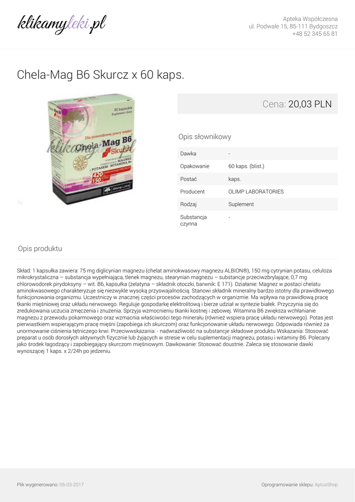 Apteka Współczesna ul. Podwale 15, 85-111 Bydgoszcz +48 52 345 65 81 Chela-Mag B6 Skurcz x 60 kaps. Cena: 20,03 PLN Opis słownikowy Dawka - Opakowanie 60 kaps. (blist.) Postać kaps. Producent OLIMP LABORATORIES Rodzaj Suplement Substancja czynna - Opis produktu Skład: 1 kapsułka zawiera: 75 mg diglicynian magnezu (chelat aminokwasowy magnezu ALBION®), 150 mg cytrynian potasu, celuloza mikrokrystaliczna – substancja wypełniająca, tlenek magnezu, stearynian magnezu – substancje przeciwzbrylające, 0,7 mg chlorowodorek pirydoksyny – wit. B6, kapsułka (żelatyna – składnik otoczki, barwnik: E 171). Działanie: Magnez w postaci chelatu aminokwasowego charakteryzuje się niezwykle wysoką przyswajalnością. Stanowi składnik mineralny bardzo istotny dla prawidłowego funkcjonowania organizmu. Uczestniczy w znacznej części procesów zachodzących w organizmie. Ma wpływa na prawidłową pracę tkanki mięśniowej oraz układu nerwowego. Reguluje gospodarkę elektrolitową i bierze udział w syntezie białek. Przyczynia się do zredukowania uczucia zmęczenia i znużenia. Sprzyja wzmocnieniu tkanki kostnej i zębowej. Witamina B6 zwiększa wchłanianie magnezu z przewodu pokarmowego oraz wzmacnia właściwości tego minerału (również wspiera pracę układu nerwowego). Potas jest pierwiastkiem wspierającym pracę mięśni (zapobiega ich skurczom) oraz funkcjonowanie układu nerwowego. Odpowiada również za unormowanie ciśnienia tętniczego krwi. Przeciwwskazania: - nadwrażliwość na substancje składowe produktu Wskazania: Stosować preparat u osób dorosłych aktywnych fizycznie lub żyjących w stresie w celu suplementacji magnezu, potasu i witaminy B6. Polecany jako środek łagodzący i zapobiegający skurczom mięśniowym. Dawkowanie: Stosować doustnie. Zaleca się stosowanie dawki wynoszącej 1 kaps. x 2/24h po jedzeniu. Plik wygenerowano: 06-03-2017 Powered by TCPDF (www.tcpdf.org) Oprogramowanie sklepu: AptusShop