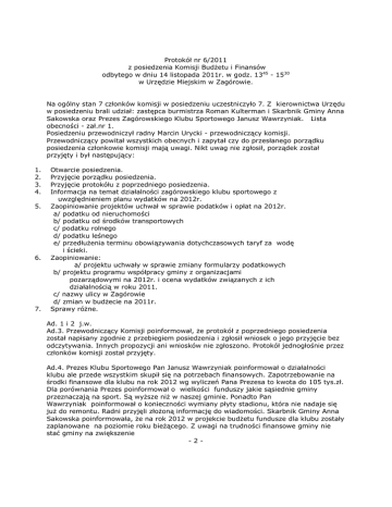 Protokół nr 6/2011 z posiedzenia Komisji Budżetu i Finansów odbytego w dniu 14 listopada 2011r. w godz. 1345 - 1530 w Urzędzie Miejskim w Zagórowie. Na ogólny stan 7 członków komisji w posiedzeniu uczestniczyło 7. Z kierownictwa Urzędu w posiedzeniu brali udział: zastępca burmistrza Roman Kulterman i Skarbnik Gminy Anna Sakowska oraz Prezes Zagórowskiego Klubu Sportowego Janusz Wawrzyniak. Lista obecności - zał.nr 1. Posiedzeniu przewodniczył radny Marcin Urycki - przewodniczący komisji. Przewodniczący powitał wszystkich obecnych i zapytał czy do przesłanego porządku posiedzenia członkowie komisji mają uwagi. Nikt uwag nie zgłosił, porządek został przyjęty i był następujący: 1. 2. 3. 4. 5. 6. 7. Otwarcie posiedzenia. Przyjęcie porządku posiedzenia. Przyjęcie protokółu z poprzedniego posiedzenia. Informacja na temat działalności zagórowskiego klubu sportowego z uwzględnieniem planu wydatków na 2012r. Zaopiniowanie projektów uchwał w sprawie podatków i opłat na 2012r. a/ podatku od nieruchomości b/ podatku od środków transportowych c/ podatku rolnego d/ podatku leśnego e/ przedłużenia terminu obowiązywania dotychczasowych taryf za wodę i ścieki. Zaopiniowanie: a/ projektu uchwały w sprawie zmiany formularzy podatkowych b/ projektu programu współpracy gminy z organizacjami pozarządowymi na 2012r. i ocena wydatków związanych z ich działalnością w roku 2011. c/ nazwy ulicy w Zagórowie d/ zmian w budżecie na 2011r. Sprawy różne. Ad. 1 i 2 j.w. Ad.3. Przewodniczący Komisji poinformował, że protokół z poprzedniego posiedzenia został napisany zgodnie z przebiegiem posiedzenia i zgłosił wniosek o jego przyjęcie bez odczytywania. Innych propozycji ani wniosków nie zgłoszono. Protokół jednogłośnie przez członków komisji został przyjęty. Ad.4. Prezes Klubu Sportowego Pan Janusz Wawrzyniak poinformował o działalności klubu ale przede wszystkim skupił się na potrzebach finansowych. Zapotrzebowanie na środki finansowe dla klubu na rok 2012 wg wyliczeń Pana Prezesa to kwota do 105 tys.zł. Dla porównania Prezes poinformował o wielkości funduszy jakie sąsiednie gminy przeznaczają na sport. Są wyższe niż w naszej gminie. Ponadto Pan Wawrzyniak poinformował o konieczności wymiany płyty stadionu, która nie nadaje się już do remontu. Radni przyjęli złożoną informację do wiadomości. Skarbnik Gminy Anna Sakowska poinformowała, że na rok 2012 w projekcie budżetu fundusze dla klubu zostały zaplanowane na poziomie roku bieżącego. Z uwagi na trudności finansowe gminy nie stać gminy na zwiększenie -2- tych środków. Radni ze zrozumieniem przyjęli zarówno informację złożoną przez Prezesa Klubu jak i wyjaśnienia Pani Skarbnik. Ad.5a-e/. Pani Skarbnik przedstawiła projekty uchwał w sprawie podatków na rok 2012. Pani Skarbnik poinformowała, że proponowane stawki podatków na rok 2012 to wzrost o 3 - 5 % w stosunku do roku 2011. Radny Lech Bartecki zgłosił wniosek aby nie podwyższać podatku od nieruchomości w § 1 pkt 2 uchwały tj. wysokości podatku od budynków lub ich części związanych z prowadzeniem działalności gospodarczej oraz od budynków mieszkalnych lub ich części zajętych na prowadzenie działalności gospodarczej od 1m2 pow.użytkowej. W roku bieżącym ta stawka wynosi zł.17,88 i należy ją pozostawić bez zmian. Radna Romualda Matusiak zgłosiła wniosek by proponowaną przez burmistrza podwyżkę w tym punkcie obniżyć o połowę / burmistrz proponuje stawkę 18,77 zł. a radna proponuje by była to kwota 18,32/ Innych wniosków do projektu uchwały w sprawie podatku od nieruchomości nie zgłoszono. Przewodniczący komisji prosił o przegłosowanie zgłoszonych wniosków. Wniosek radnego Lecha Barteckiego poparło 5 członków komisji. Przewodniczący Komisji poinformował, że na sesji przedstawi powyższe dwa wnioski. Komisja pozytywnie jednogłośnie zaopiniowała projekty uchwał w sprawie: - podatku od środków transportowych - podatku leśnego - przedłużenia terminu obowiązywania taryf za wodę i ścieki na 2012r. Jeśli chodzi o cenę żyta do naliczania podatku rolnego to komisja po dyskusji jednogłośnie zaproponowała aby obniżyć cenę podaną przez GUS z kwoty 74,18 zł /dt do kwoty 55,00 zł /dt. Ad.6a/. Pani Skarbnik przedstawiła projekt uchwały zmieniającej wzory formularzy podatkowych. Stwierdziła, że zmiana formularzy dotyczy terminu składania informacji i deklaracji podatkowych /termin składania formularzy był do 15 stycznia a po zmianie będzie do 31 stycznia danego roku/. Komisja jednogłośnie pozytywnie zaopiniowała projekt uchwały. Ad.6b/. Zastępca burmistrza Roman Kulterman przedstawił sprawozdanie z realizacji programu współpracy gminy z organizacjami pożytku publicznego w 2011r. i przedstawił projekt programu na rok 2012. Komisja pozytywnie zaopiniowała przedłożone materiały. Radny Lech Bartecki zaproponował, by do komisji konkursowej włączyć przedstawiciela z rady. Radny tę poprawkę do projektu uchwały zgłosi na sesji rady. Ad.6c/. Zastępca burmistrza Roman Kulterman przedstawił projekt uchwały w sprawie nadania nazwy nowej ulicy w Zagórowie. Chodzi o ulicę równoległą do ulicy Gajowej od strony strugi Białki. Przy tej ulicy są już budowane budynki mieszkalne i niebawem mieszkańcy będą zwracać się o dopełnienie obowiązków meldunkowych a także nadania numerów tym budynkom. Proponowane są różne nazwy m.in. Cicha, Zacisze, Ptasia. Członkowie komisji wskazali na nazwę ulicy ZACISZE. Przed nadaniem nazwy ulicy musi być spełniony wymóg ustawowy a mianowicie przeprowadzenie konsultacji społecznych. Burmistrz zarządził przeprowadzenie tych konsultacji na ogólnym -3zebraniu mieszkańców Zagórowa w dniu 16 listopada o godz. 1800 w Urzędzie Miejskim /sala posiedzeń/. Ad.6d/. Skarbnik Gminy Anna Sakowska przedstawiła propozycje zmian w budżecie gminy na 2011r. Zmiany p