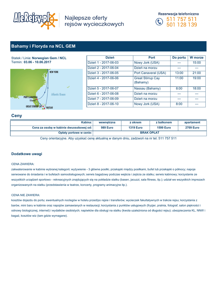 Bahamy i Floryda na NCL GEM Statek / Linia: Norwegian Gem / NCL Termin: 03.06 - 10.06.2017 Dzień Port Do portu W morze --- 15:00 Dzień 1 - 2017-06-03 Nowy Jork (USA) Dzień 2 - 2017-06-04 Dzień na morzu --- --- Dzień 3 - 2017-06-05 Port Canaveral (USA) 13:00 21:00 Dzień 4 - 2017-06-06 Great Stirrup Cay (Bahamy) 11:00 19:00 Dzień 5 - 2017-06-07 Nassau (Bahamy) 8:00 18:00 Dzień 6 - 2017-06-08 Dzień na morzu --- --- Dzień 7 - 2017-06-09 Dzień na morzu --- --- Dzień 8 - 2017-06-10 Nowy Jork (USA) 8:00 --- Ceny Kabina: Cena za osobę w kabinie dwuosobowej od: wewnętrzna z oknem z balkonem apartament 989 Euro 1319 Euro 1599 Euro 2709 Euro Opłaty portowe w cenie: BRAK OPŁAT Ceny orientacyjne. Aby uzyskać cenę aktualną w danym dniu, zadzwoń na nr tel. 511 757 511 Dodatkowe uwagi CENA ZAWIERA: zakwaterowanie w kabinie wybranej kategorii; wyżywienie - 3 główne posiłki, przekąski między posiłkami, bufet lub przekąski o północy; napoje serwowane do śniadania i w bufetach samoobsługowych; serwis bagażowy podczas wejścia i zejścia ze statku; serwis kabinowy; korzystanie ze wszystkich urządzeń sportowo - rekreacyjnych znajdujących się na pokładzie statku (basen, jacuzzi, sala fitness, itp.); udział we wszystkich imprezach organizowanych na statku (przedstawienia w teatrze, koncerty, programy animacyjne itp.). CENA NIE ZAWIERA: kosztów dojazdu do portu; ewentualnych noclegów w hotelu przed/po rejsie i transferów; wycieczek fakultatywnych w trakcie rejsu; korzystania z barów, mini baru w kabinie oraz napojów zamawianych w restauracji; korzystania z punktów usługowych (fryzjer, pralnia, fotograf, salon piękności i odnowy biologicznej, internet) i wydatków osobistych; napiwków dla obsługi na statku (kwota uzależniona od długości rejsu); ubezpieczenia KL, NNW i bagaż, kosztów wiz (tam gdzie wymagane). Norwegian Gem Norwegian Gem Tonaż: 93.502 ton Rok budowy: 2007 Długość: 295 m Szerokość: 33 m Szybkość: 25 węzłów Pokłady pasażerskie: 12 Załoga: 1.154 Pasażerowie: 2.394 Basen: 2 (6 jacuzzi, basen dla dzieci) Waluta: USD Przedstawiamy Norwegian Gem. Ten całkowicie nowy statek oferuje wszystko to, co najlepsze w linii NCL Cruises - wszystkie te restauracje, bary i lounges plus zupełny brak zwracania uwagi na zegarki i budziki. To najnowszy z rodziny statków klasy Jewel, siostrzana jednostka Norwegian Pearl. Waszym jedynym zmartwieniem to zastanawiać się czy pójść na drzemkę, zagrać na torze bowlingowym a może dobry trening, czy ...cokolwiek. Norwegian Gem to do odkrycia 11 barów i lounges, 13 restauracji. Czterotorowa aleja do bowlingu*, druga na pokładzie statku. (*pierwszy tor bowlingowy znajduje się na statku Norwegain Pearl). Ekskluzywne apartamenty Courtyard Villas i Garden Villas, przez które dodasz słowo "dekadencki" do swojego słownika. Elastyczne, łączone kabiny doskonałe dla rodzin czy grup. Do dyspozycji: restauracje, bary, kasyno, dyskoteka,salon odnowy biologicznej SPA, fitness center, sauna, jacuzzi, boisko i trasa do joggingu, kort tenisowy oraz do gry w koszykówkę i siatkówkę, ściana do wspinaczki, symulator do gry w golfa, kręgle, salon piękności, pokój zabaw dla dzieci, basen dla dzieci ze zjeżdżalnią, punkt medyczny, biblioteka, kawiarenka internetowa, sala gier video, butiki, galeria, kaplica. Kabiny: łazienka (prysznic, wc, suszarka), klimatyzacja, radio pokładowe, telefon do użytku wewnętrznego, sejf, mini barek, TV, lodówka. Większość kabin ma 2 pojedyncze łóżka, które na zamówienie można połączyć w 1 podwójne. Opis kabin typu suite i apartamentów na zapytanie.