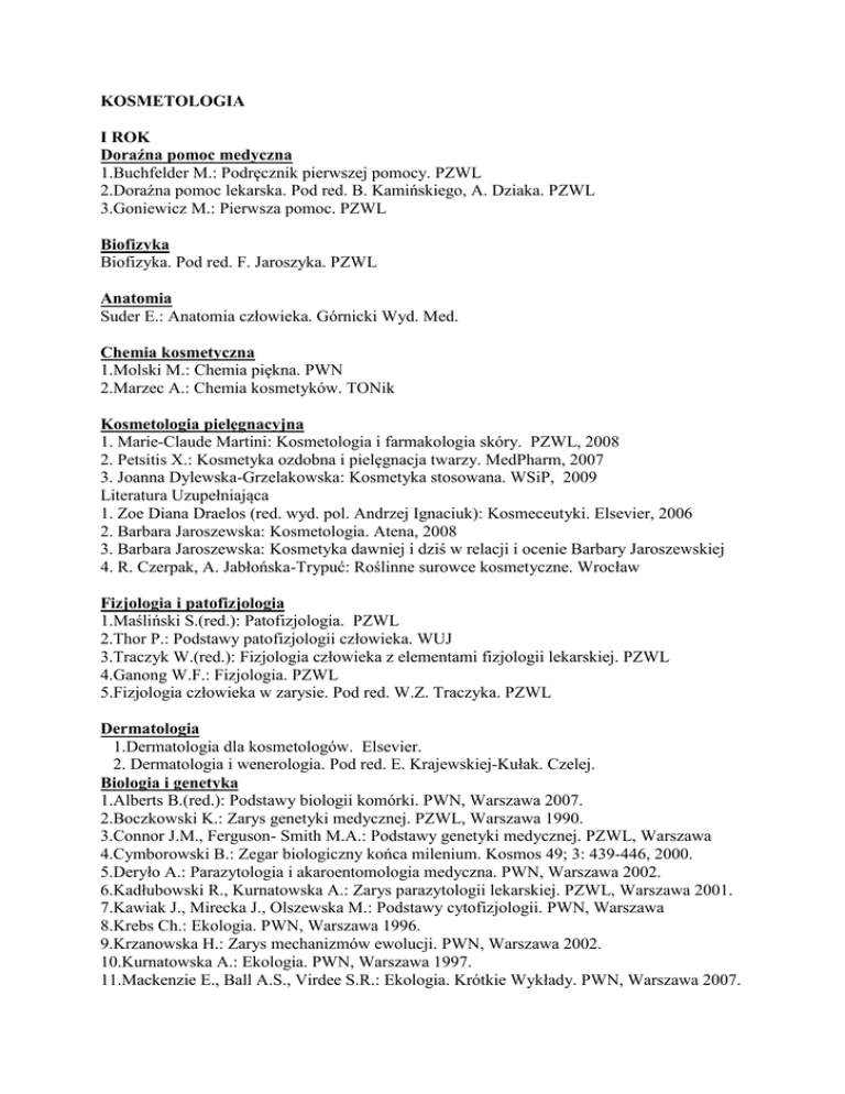KOSMETOLOGIA I ROK Doraźna pomoc medyczna 1.Buchfelder M.: Podręcznik pierwszej pomocy. PZWL 2.Doraźna pomoc lekarska. Pod red. B. Kamińskiego, A. Dziaka. PZWL 3.Goniewicz M.: Pierwsza pomoc. PZWL Biofizyka Biofizyka. Pod red. F. Jaroszyka. PZWL Anatomia Suder E.: Anatomia człowieka. Górnicki Wyd. Med. Chemia kosmetyczna 1.Molski M.: Chemia piękna. PWN 2.Marzec A.: Chemia kosmetyków. TONik Kosmetologia pielęgnacyjna 1. Marie-Claude Martini: Kosmetologia i farmakologia skóry. PZWL, 2008 2. Petsitis X.: Kosmetyka ozdobna i pielęgnacja twarzy. MedPharm, 2007 3. Joanna Dylewska-Grzelakowska: Kosmetyka stosowana. WSiP, 2009 Literatura Uzupełniająca 1. Zoe Diana Draelos (red. wyd. pol. Andrzej Ignaciuk): Kosmeceutyki. Elsevier, 2006 2. Barbara Jaroszewska: Kosmetologia. Atena, 2008 3. Barbara Jaroszewska: Kosmetyka dawniej i dziś w relacji i ocenie Barbary Jaroszewskiej 4. R. Czerpak, A. Jabłońska-Trypuć: Roślinne surowce kosmetyczne. Wrocław Fizjologia i patofizjologia 1.Maśliński S.(red.): Patofizjologia. PZWL 2.Thor P.: Podstawy patofizjologii człowieka. WUJ 3.Traczyk W.(red.): Fizjologia człowieka z elementami fizjologii lekarskiej. PZWL 4.Ganong W.F.: Fizjologia. PZWL 5.Fizjologia człowieka w zarysie. Pod red. W.Z. Traczyka. PZWL Dermatologia 1.Dermatologia dla kosmetologów. Elsevier. 2. Dermatologia i wenerologia. Pod red. E. Krajewskiej-Kułak. Czelej. Biologia i genetyka 1.Alberts B.(red.): Podstawy biologii komórki. PWN, Warszawa 2007. 2.Boczkowski K.: Zarys genetyki medycznej. PZWL, Warszawa 1990. 3.Connor J.M., Ferguson- Smith M.A.: Podstawy genetyki medycznej. PZWL, Warszawa 4.Cymborowski B.: Zegar biologiczny końca milenium. Kosmos 49; 3: 439-446, 2000. 5.Deryło A.: Parazytologia i akaroentomologia medyczna. PWN, Warszawa 2002. 6.Kadłubowski R., Kurnatowska A.: Zarys parazytologii lekarskiej. PZWL, Warszawa 2001. 7.Kawiak J., Mirecka J., Olszewska M.: Podstawy cytofizjologii. PWN, Warszawa 8.Krebs Ch.: Ekologia. PWN, Warszawa 1996. 9.Krzanowska H.: Zarys mechanizmów ewolucji. PWN, Warszawa 2002. 10.Kurnatowska A.: Ekologia. PWN, Warszawa 1997. 11.Mackenzie E., Ball A.S., Virdee S.R.: Ekologia. Krótkie Wykłady. PWN, Warszawa 2007. 12.Magdzik W.: Choroby zakaźne i pasożytnicze – epidemiologia i profilaktyka. Wyd. AlfaMedica Press, 2007. 13.Winter P.C., Hickey G.I., Fletcher H.L.:Genetyka. Krótkie Wykłady. PWN, Warszawa Histologia 1.Zabel M.: Histologia: podręcznik dla studentów medycyny i stomatologii . Elsevier. 2.Cichocki T.: Kompendium histologii. WUJ Chemia medyczna. Gałasiński W.: Chemia medyczna. PZWL Podstawowa aparatura w kosmetologii