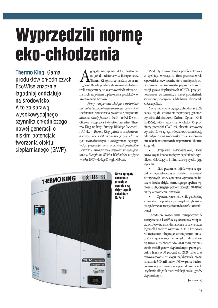 7YPRZEDZILINORMÃ EKOCHODZENIA 4HERMO+ING'AMA PRODUKTÌWCHODNICZYCH %CO7ISEZNACZNIE AGODNIEJODDZIAUJE NAuRODOWISKO !TOZASPRAW WYSOKOWYDAJNEGO CZYNNIKACHODNICZEGO NOWEJGENERACJIO NISKIMPOTENCJALE TWORZENIAEFEKTU CIEPLARNIANEGO'70 A gregaty naczepowe SLXe, dostarczane już do odbiorców w Europie przez Thermo King (markę należącą do firmy Ingersoll Rand), producenta rozwiązań do kontroli temperatury w zastosowaniach niestacjonarnych, są jednymi z pierwszych produktów w asortymencie EcoWise. – Firmy transportowe dbające o środowisko naturalne i ekonomię działania oczekują wysokiej wydajności i zapewnienia zgodności z przepisami, które nie weszły jeszcze w życie – mówi Dwight Gibson, wiceprezes i dyrektor naczelny Thermo King na kraje Europy, Bliskiego Wschodu i Afryki. – Thermo King spełnia te oczekiwania, a naszym celem jest utrzymanie pozycji lidera w tym technologicznym i ekologicznym wyścigu, wciąż poszerzając nasz asortyment produktów EcoWise o samochodowe rozwiązania transportowe w Europie, na Bliskim Wschodzie i w Afryce w roku 2015 – dodaje Dwight Gibson. .OWEAGREGATY CHODNICZE PRACUJW OPARCIUOWY DAJNYCZYNNIK CHODNICZY $U0ONT Produkty Thermo King z portfolio EcoWise spełniają wymagania firm przewozowych, zapewniając rozwiązania, które zmniejszają oddziaływanie na środowisko poprzez obniżenie emisji gazów cieplarnianych (GHG), przy jednoczesnym utrzymaniu, a nawet podniesieniu sprawności, wydajności schładzania i ekonomiki zużycia paliwa. Nowe naczepowe agregaty chłodnicze SLXe nadają się do stosowania najnowszej generacji czynnika chłodniczego DuPont Opteon XP44 (R-452A), który zapewnia o około 50 proc. niższy potencjał GWP niż obecnie stosowany czynnik. Nowe agregaty dodatkowo zmniejszają oddziaływanie na środowisko dzięki zastosowaniu takich nowatorskich usprawnień Thermo King, jak: • Skraplacze mikrokanałowe, które pozwalają na jeszcze mniejsze napełnienie czynnikiem chłodzącym i minimalizują ryzyko jego wycieku. • Niski poziom emisji dźwięku ze specjalnie zaprojektowanym pakietem rozwiązań akustycznych, który ogranicza wytwarzanie hałasu u źródła, dzięki czemu agregat spełnia wymogi PIEK, osiągając poziom dźwięku 60 dB lub niższy w promieniu 7 metrów. • Opatentowane sterowniki geofencing automatycznie przełączają agregat w tryb niskiej emisji dźwięku po wjechaniu do strefy kontrolowanej. Chłodnicze rozwiązania transportowe w asortymencie EcoWise są stworzone w oparciu o zobowiązanie klimatyczne przyjęte przez Ingersoll Rand we wrześniu 2014 r. Powyższe zobowiązanie obejmuje zmniejszenie emisji gazów cieplarnianych w związku z działalnością firmy o 35 procent do 2020 roku, zmniejszenie emisji gazów cieplarnianych przez produkty firmy o 50 procent do 2020 roku oraz zainwestowanie w ciągu najbliższych pięciu lat łącznie 500 milionów USD w prace badawczo-rozwojowe związane z produktami w celu uzyskania długofalowej redukcji emisji gazów cieplarnianych. PQSqBNB