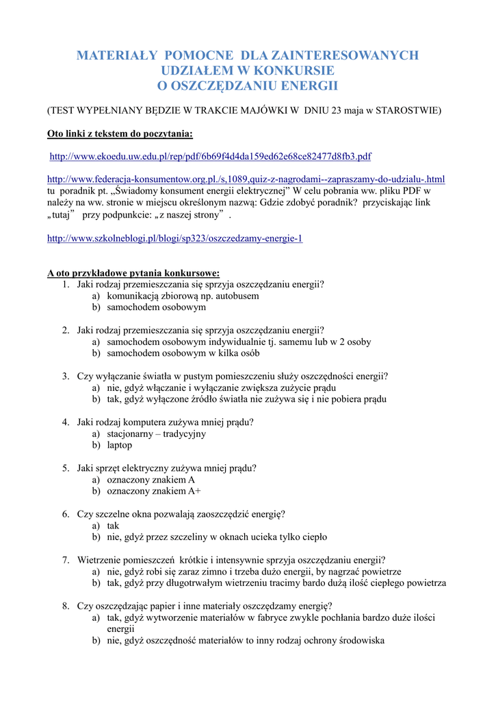 MATERIAŁY POMOCNE DLA ZAINTERESOWANYCH UDZIAŁEM W KONKURSIE O OSZCZĘDZANIU ENERGII (TEST WYPEŁNIANY BĘDZIE W TRAKCIE MAJÓWKI W DNIU 23 maja w STAROSTWIE) Oto linki z tekstem do poczytania: http://www.ekoedu.uw.edu.pl/rep/pdf/6b69f4d4da159ed62e68ce82477d8fb3.pdf http://www.federacja-konsumentow.org.pl./s,1089,quiz-z-nagrodami--zapraszamy-do-udzialu-.html tu poradnik pt. „Świadomy konsument energii elektrycznej” W celu pobrania ww. pliku PDF w należy na ww. stronie w miejscu określonym nazwą: Gdzie zdobyć poradnik? przyciskając link „tutaj” przy podpunkcie: „z naszej strony”. http://www.szkolneblogi.pl/blogi/sp323/oszczedzamy-energie-1 A oto przykładowe pytania konkursowe: 1. Jaki rodzaj przemieszczania się sprzyja oszczędzaniu energii? a) komunikacją zbiorową np. autobusem b) samochodem osobowym 2. Jaki rodzaj przemieszczania się sprzyja oszczędzaniu energii? a) samochodem osobowym indywidualnie tj. samemu lub w 2 osoby b) samochodem osobowym w kilka osób 3. Czy wyłączanie światła w pustym pomieszczeniu służy oszczędności energii? a) nie, gdyż włączanie i wyłączanie zwiększa zużycie prądu b) tak, gdyż wyłączone źródło światła nie zużywa się i nie pobiera prądu 4. Jaki rodzaj komputera zużywa mniej prądu? a) stacjonarny – tradycyjny b) laptop 5. Jaki sprzęt elektryczny zużywa mniej prądu? a) oznaczony znakiem A b) oznaczony znakiem A+ 6. Czy szczelne okna pozwalają zaoszczędzić energię? a) tak b) nie, gdyż przez szczeliny w oknach ucieka tylko ciepło 7. Wietrzenie pomieszczeń krótkie i intensywnie sprzyja oszczędzaniu energii? a) nie, gdyż robi się zaraz zimno i trzeba dużo energii, by nagrzać powietrze b) tak, gdyż przy długotrwałym wietrzeniu tracimy bardo dużą ilość ciepłego powietrza 8. Czy oszczędzając papier i inne materiały oszczędzamy energię? a) tak, gdyż wytworzenie materiałów w fabryce zwykle pochłania bardzo duże ilości energii b) nie, gdyż oszczędność materiałów to inny rodzaj ochrony środowiska 9. Czy używanie akumulatorków a nie jednorazowych baterii służy oszczędzaniu energii? a) tak, gdyż produkcja baterii i akumulatorków pochłania dużo energii b) nie, gdyż częste ładowanie akumulatorków pochłania dużo energii 10. Czy w miarę napełniania się worka na kurz w odkurzaczu rośnie zużycie energii przy odkurzaniu powierzchni domowych? a) tak b) nie 11. Czy skrót ISE to: a) Interaktywny System Energetyczny b) Inteligentne Sieci Energetyczne