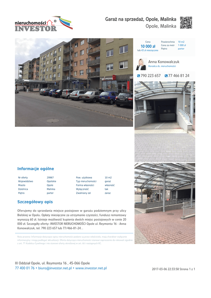 Garaż na sprzedaż, Opole, Malinka Opole, Malinka Cena 10 000 zł lub 43 zł miesięcznie Powierzchnia Cena za metr Piętro 10 m2 1 000 zł parter Anna Konowalczuk Doradca ds. nieruchomości 790 223 657 77 466 81 24 Informacje ogólne Nr oferty 29967 Pow. użytkowa 10 m2 Województwo Opolskie Typ nieruchomości garaż Miasto Opole Forma własności własność Dzielnica Malinka Wyłączność tak Piętro parter Zwalniany od zaraz Szczegółowy opis Oferujemy do sprzedania miejsce postojowe w garażu podziemnym przy ulicy Bielskiej w Opolu. Opłaty miesięczne za utrzymanie czystości, fundusz remontowy wynoszą 60 zł. Istnieje możliwość kupienia dwóch miejsc postojowych w cenie 20 000 zł. Szczegóły oferty: INVESTOR NIERUCHOMOŚCI Opole ul. Reymonta 16 - Anna Konowalczuk, tel. 790 223 657 lub 77/466-81-24. . Nota prawna: Informacje dotyczące opisu nieruchomości podane są przez właściciela, mają charakter wyłącznie informacyjny i mogą podlegać aktualizacji. Oferta dotycząca nieruchomości stanowi zaproszenie do rokowań zgodnie z art. 71 Kodeksu Cywilnego i nie stanowi oferty określonej w art. 66 i następnych KC. III Oddział Opole, ul. Reymonta 16 , 45-066 Opole 77 400 01 76 • [email protected] • www.investor.net.pl 2017-03-06 22:33:58 Strona 1 z 1