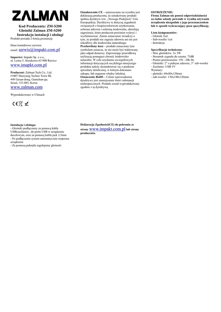 Kod Producenta: ZM-S200 Głośniki Zalman ZM-S200 Instrukcja instalacji i obsługi Produkt posiada 2-letnią gwarancję Dane kontaktowe serwisu: email: [email protected] Importer: Impakt Sp. z o.o., ul. Leśna 5, Sierakowo 63-900 Rawicz www.imapkt.com.pl Producent: Zalman Tech Co., Ltd. #1007 Daeryung Techno Town III, 448 Gasan-dong, Gumchun-gu, Seoul, 153-803, Korea www.zalman.com Oznakowanie CE – umieszczone na wyrobie jest deklaracją producenta, że oznakowany produkt spełnia dyrektyw tzw. „Nowego Podejścia” Unii Europejskiej. Dyrektywy te dotyczą zagadnień związanych z bezpieczeństwem użytkowania, ochrona zdrowia i ochroną środowiska, określają zagrożenia, które producent powinien wykryć i wyeliminować. Zatem oznaczenie świadczy o tym, że produkt nie zagraża zdrowiu ani nie jest szkodliwy dla środowiska naturalnego. Przekreślony kosz – produkt oznaczony tym symbolem oznacza, że nie może być traktowany jako odpad domowy. Zapewniając prawidłową utylizację pomagasz chronić środowisko naturalne. W celu uzyskania szczegółowych informacji dotyczących recyklingu niniejszego produktu należy skontaktować się z punktem sprzedaży detalicznej, w którym dokonano zakupu, lub organem władzy lokalnej. Oznaczenie RoHS – Celem wprowadzenia dyrektywy jest zmniejszenie ilości substancji niebezpiecznych. Produkt został wyprodukowany zgodnie z tą dyrektywą Wyprodukowano w Chinach Instalacja i obsługa: - Głośniki podłączamy za pomocą kabla USB(zasilanie) , do portu USB w urządzeniu docelowym, oraz za pomocą kabla jack 3,5mm - Po podłączeniu system automatycznie rozpozna urządzenie - Za pomocą pokrętła regulujemy głośność Deklaracja Zgodności(CE) do pobrania ze strony www.impakt.com.pl lub strony producenta. OSTRZEŻENIE: Firma Zalman nie ponosi odpowiedzialności za żadne szkody powstałe w wyniku używania urządzenia niezgodnie z jego przeznaczeniem lub w sposób wykraczający poza specyfikację. Lista komponentów: - Głośnik 2szt - Sub-woofer 1szt - Instrukcja Specyfikacja techniczna: - Moc głośników: 2x 3W - Stosunek sygnału do szumu: 75dB - Pasmo przenoszenia: 150 - 20k Hz - Głośniki: 2" o pełnym zakresie, 3” sub-woofer - Zasilanie: USB 5V Wymiary: - głośniki: 68x80x120mm - sub-woofer: 130x140x120mm