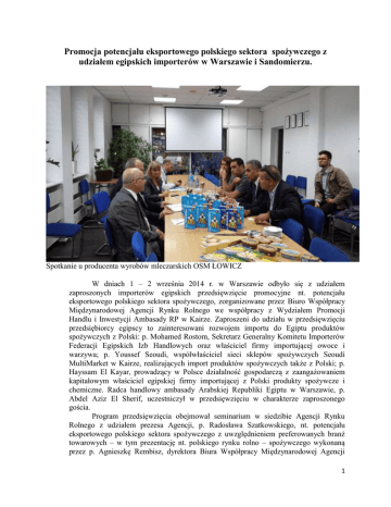 Promocja potencjału eksportowego polskiego sektora spożywczego z udziałem egipskich importerów w Warszawie i Sandomierzu. Spotkanie u producenta wyrobów mleczarskich OSM ŁOWICZ W dniach 1 – 2 września 2014 r. w Warszawie odbyło się z udziałem zaproszonych importerów egipskich przedsięwzięcie promocyjne nt. potencjału eksportowego polskiego sektora spożywczego, zorganizowane przez Biuro Współpracy Międzynarodowej Agencji Rynku Rolnego we współpracy z Wydziałem Promocji Handlu i Inwestycji Ambasady RP w Kairze. Zaproszeni do udziału w przedsięwzięciu przedsiębiorcy egipscy to zainteresowani rozwojem importu do Egiptu produktów spożywczych z Polski: p. Mohamed Rostom, Sekretarz Generalny Komitetu Importerów Federacji Egipskich Izb Handlowych oraz właściciel firmy importującej owoce i warzywa; p. Youssef Seoudi, współwłaściciel sieci sklepów spożywczych Seoudi MultiMarket w Kairze, realizujących import produktów spożywczych także z Polski; p. Hayssam El Kayar, prowadzący w Polsce działalność gospodarczą z zaangażowaniem kapitałowym właściciel egipskiej firmy importującej z Polski produkty spożywcze i chemiczne. Radca handlowy ambasady Arabskiej Republiki Egiptu w Warszawie, p. Abdel Aziz El Sherif, uczestniczył w przedsięwzięciu w charakterze zaproszonego gościa. Program przedsięwzięcia obejmował seminarium w siedzibie Agencji Rynku Rolnego z udziałem prezesa Agencji, p. Radosława Szatkowskiego, nt. potencjału eksportowego polskiego sektora spożywczego z uwzględnieniem preferowanych branż towarowych – w tym prezentację nt. polskiego rynku rolno – spożywczego wykonaną przez p. Agnieszkę Rembisz, dyrektora Biura Współpracy Międzynarodowej Agencji 1 Rynku Rolnego, oraz prezentację uwarunkowań importu do Egiptu produktów spożywczych, w tym owoców i warzyw, wykonaną przez p. Mohameda Rostoma, Sekretarza Generalnego Komitetu Importerów Federacji Egipskich Izb Handlowych. Podczas seminarium miała miejsce także prezentacja uczestniczących polskich producentów spożywczych oraz spotkania b2b. Zaproszeni przedsiębiorcy egipscy wizytowali także polskich producentów jabłek i produktów mleczarskich. II Konferencja w Sandomierzu nt. potencjału gospodarczego sektora owocowo–warzywnego Przedsięwzięcie promocyjne zrealizowane przez Agencję Rynku Rolnego odbyło się bezpośrednio po II Konferencji nt. potencjału gospodarczego sektora przetwórstwa owocowo - warzywnego Ziemi Sandomierskiej, która zorganizowana została w Sandomierzu w dniach 28 – 31 sierpnia 2014 r. przez Urząd Marszałkowski Województwa Świętokrzyskiego RP w Kielcach pod patronatem Ministra Gospodarki i Ministra Rolnictwa i Rozwoju Wsi oraz Stowarzyszenia Eksporterów Polskich. W efekcie współpracy Wydziału Promocji Handlu i Inwestycji Ambasady RP w Kairze z Departamentem Polityki Regionalnej Urzędu Marszałkowskiego Województwa Świętokrzyskiego w Kielcach egipscy przedsiębiorcy uczestniczyli w charakterze zaproszonych gości również w Konferencji w Sandomierzu. Program Konferencji obejmował prezentację potencjału przetwórstwa owocowo - warzywnego Ziemi Sandomierskiej i grup producenckich regionu oraz dyskusje panelowe nt. perspektyw rozwoju eksportu branży owocowo – warzywnej regionu. Na zaproszenie organizatorów Konferencji w dyskusji panelowej uczestniczył p. Mohamed Rostom, który 2 zaprezentował uwarunkowania współpracy importowej polskiej branży owoców i warzyw z rynkiem Egiptu. Zaproszeni na Konferencję importerzy egipscy uczestniczyli także w spotkaniach b2b oraz wizytowali wybrane zakłady przetwórstwa owocowo – warzywnego w regionie. W ocenie egipskich uczestników potencjał produkcyjno – eksportowy zaprezentowany w przedsięwzięciach promocyjnych w Sandomierzu i w Warszawie stanowi realną zachętę do kontynuacji zainteresowania współpracą importową z polskim sektorem spożywczym. Sporządził: Tomasz Przygoda radca WPHI w Kairze, wrzesień 2014 r. 3