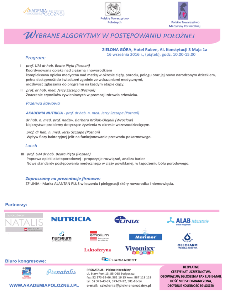 Polskie Towarzystwo Położnych Polskie Towarzystwo Medycyny Perinatalnej WYBRANE ALGORYTMY W POSTĘPOWANIU POŁOŻNEJ ZIELONA GÓRA, Hotel Ruben, Al. Konstytucji 3 Maja 1a 16 września 2016 r., (piątek), godz. 10.00-15.00 Program: I prof. UM dr hab. Beata Pięta (Poznań) Koordynowana opieka nad ciężarną i noworodkiem kompleksowa opieka medyczna nad matką w okresie ciąży, porodu, połogu oraz jej nowo narodzonym dzieckiem, pełna dostępność do świadczeń zgodnie ze wskazaniami medycznymi, możliwość zgłaszania do programu na każdym etapie ciąży. II prof. dr hab. med. Jerzy Szczapa (Poznań) Znaczenie czynników żywieniowych w promocji zdrowia człowieka. Przerwa kawowa AKADEMIA NUTRICIA - prof. dr hab. n. med. Jerzy Szczapa (Poznań) dr hab. n. med. prof. nadzw. Barbara Królak-Olejnik (Wrocław) Najczęstsze problemy dotyczące żywienia w okresie wczesnodziecięcym. prof. dr hab. n. med. Jerzy Szczapa (Poznań) Wpływ flory bakteryjnej jelit na funkcjonowanie przewodu pokarmowego. Lunch III prof. UM dr hab. Beata Pięta (Poznań) Poprawa opieki okołoporodowej - propozycje rozwiązań, analiza barier. Nowe standardy postępowania medycznego w ciąży powikłanej, w łagodzeniu bólu porodowego. Zapraszamy na prezentacje firmowe: ZF UNIA - Marka ALANTAN PLUS w leczeniu i pielęgnacji skóry noworodka i niemowlęcia. Partnerzy: . Biuro kongresowe: PRENATALIS - Piękne Narodziny ul. Stary Port 13, 85-068 Bydgoszcz fax: 52 373-39-66, 581 16 15 kom. 887 118 118 tel. 52 373-43-37, 373-24-92, 581-16-14 WWW.AKADEMIAPOLOZNEJ.PL e-mail: [email protected] BEZPŁATNE CERTYFIKAT UCZESTNICTWA OBOWIĄZUJĄ ZGŁOSZENIA FAX LUB E-MAIL ILOŚĆ MIEJSC OGRANICZONA, DECYDUJE KOLEJNOŚĆ ZGŁOSZEŃ