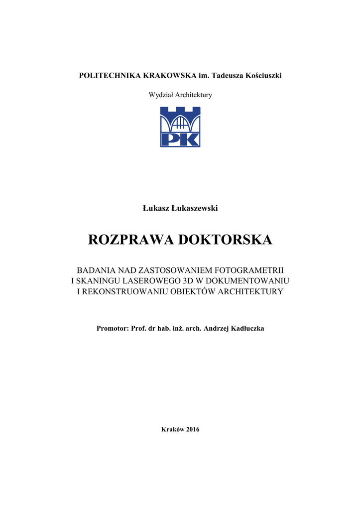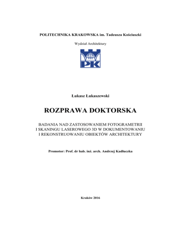 POLITECHNIKA KRAKOWSKA im. Tadeusza Kościuszki Wydział Architektury Łukasz Łukaszewski ROZPRAWA DOKTORSKA BADANIA NAD ZASTOSOWANIEM FOTOGRAMETRII I SKANINGU LASEROWEGO 3D W DOKUMENTOWANIU I REKONSTRUOWANIU OBIEKTÓW ARCHITEKTURY Promotor: Prof. dr hab. inż. arch. Andrzej Kadłuczka Kraków 2016 Streszczenie Celem rozprawy doktorskiej jest przedstawienie zastosowania fotogrametrii i skaningu laserowego 3D w dokumentowaniu, zabezpieczaniu i rekonstruowaniu obiektów architektonicznych. Fotogrametria i skaning 3D są ważnymi narzędziami w nieinwazyjnym procesie digitalizacji dziedzictwa narodowego. Analizując ostatnie lata rozwoju skaningu laserowego oraz fotogrametrii obserwuje się szybki rozwój tej dziedziny nauki. Zastosowanie techniki cyfrowej gwarantuje uzyskanie niedostępnej dotąd szybkości, najwyższej jakości badań i stopnia odwzorowania badanego obiektu. Przeprowadzone badania promują i przedstawiają szeroki wachlarz możliwości zastosowania skaningu 3D i fotogrametrii w procesie digitalizacji dziedzictwa narodowego. Połączone ze sobą wyniki metod przeprowadzonych badań dokonują różnego rodzaju analizy mające na celu uprościć wybór metody pomiarowej w zależności od oczekiwanych produktów, wyników i kosztów. Analizowane metody w badaniach mogą być wykorzystane do zabezpieczenia istniejących obiektów dziedzictwa kulturowego, tak aby mogły one teraz i w przyszłości pełnić funkcję reprezentacyjną danych obszarów, oraz być skarbnicą wiedzy dla obecnych i przyszłych pokoleń. Niniejsza praca została podzielona na części mające pomóc wybrać odpowiednią metodę, oraz pokazać w jaki sposób przeprowadzić zainteresowaną osobę przez cały etap digitalizacji wybranych obiektów. W tym celu przedstawiono obszerną prezentację literatury naukowej w której zaprezentowano wykorzystanie skaningu laserowego 3D, oraz fotogrametrii w różnych dyscyplinach nauki takich jak archeologia, muzealnictwo, konserwatorstwo, budownictwo, geoinformacja, geologia oraz innych dyscyplin pokrewnych wykorzystujących rozpatrywane narzędzia. Zaprezentowano wybrane narzędzia i omówiono sposób ich działania, porównano wyniki pomiarów, oraz dokonano wyboru odpowiedniej metody pomiarowe w zależności od oczekiwanego produktu jak i jego dokładności. Przeprowadzono analizę problemów powstałych w procesie tworzenia interaktywnej dokumentacji, która posłużyła do określenia optymalnych parametrów skanowania. Badania przeprowadzono etapami: 1 1) prezentacja techniki pomiarowej dla określonego badania 2) określono cel tworzenia dokumentacji 3D 3) przeanalizowano środowisko i parametry pracy podczas procesu digitalizacji 5) przeprowadzono analizę porównawczą rozbieżności uzyskanych wyników dla wybranych metod pomiarowych Badania porównawcze metody fotogrametrycznej i skaningu laserowego 3D przeprowadzono dla następujących obiektów architektonicznych: 1) fasady kamienicy „Pod Śpiewającą Żabą” autorstwa Teodora Talowskiego w Krakowie 2) fasady zabytkowego kościoła pw. Najświętszego Serca Pana Jezusa w Krakowie 3) wybranych detali archeologiczno-architektonicznych z Lapidarium na Zamku Królewskim na Wawelu w Krakowie 4) powierzchni zewnętrznych trzech wybranych kapliczek z Dróżek w Kalwarii Zebrzydowskiej Przeprowadzona analiza metod i urządzeń pomiarowych wykorzystanych do badań digitalizacyjnych obiektów architektonicznych objętych rozprawą doktorską, potwierdziła skuteczność ich zastosowania w nieinwazyjnych badaniach Techniki zaprezentowane przez autora znajdują zastosowanie również w translokacji elementów, obiektów architektonicznych jak i transferach elementów polichromii ściennej. Bezinwazyjna procedura wykonywania badań umożliwia analizowanie i zabezpieczanie najbardziej wrażliwych obiektów, przedmiotów. Analiza przeprowadzonych badań potwierdza prawidłowość wykorzystania interaktywnej dokumentacji 3D jako „piątej” formy ochrony dziedzictwa, tworzącej dokument interaktywny, który ma taką samą wartość jak obiekt dokumentowany, zwiększając trwałość obiektu przed kataklizmami oraz skutkami wojennymi i powojennymi grabieżami mienia. Nowe technologie znajdują zastosowanie w pracy konserwatorów, oraz osób zajmujących się ochroną dziedzictwa narodowego. Możliwość tworzenia i kreowania interaktywnej przestrzeni przez użytkownika sprawi, że użytkownik sam będzie poprzez „zabawę” szybciej uczył się aspektów budowlanych i architektonicznych w historycznych obiektach. Umożliwi to również rozwój nowych metod rozwiązywania problemów cyfryzacji inwentaryzowanych obiektów. Wykonane badania mogą być podstawą do tego, aby proces digitalizacji – cyfryzacji stał się kolejną formą ochrony zabytków. 2