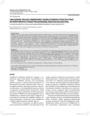 Medycyna Pracy 2008;59(4):287 – 292 © Instytut Medycyny Pracy im. prof. J. Nofera w Łodzi http://medpr.imp.lodz.pl PRACA ORYGINALNA Ewa Kułagowska OBCIĄŻENIE UKŁADU MIĘŚNIOWO-SZKIELETOWEGO PODCZAS PRAC WYKONYWANYCH PRZEZ PIELĘGNIARKĘ ANESTEZJOLOGICZNĄ THE MUSCULOSKELETAL SYSTEM LOAD DURING WORK PERFORMED BY NURSE ANESTHETISTS Instytut Medycyny Pracy i Zdrowia Środowiskowego, Sosnowiec Zakład Fizjologii Pracy i Ergonomii Streszczenie Wstęp: Celem pracy była analiza obciążenia układu mięśniowo-szkieletowego w czasie prac wykonywanych przez pielęgniarkę anestezjologiczną, identyfikacja aktywności wymagających przyjmowania wymuszonych pozycji ciała i ich przyczyn. Materiał i metody: Do badań wykorzystano obserwację procesu pracy oraz metodę OWAS (Ovako Working Posture Analysing System). Łącznie przeprowadzono 57 obserwacji procesu pracy i zidentyfikowano 31 210 pozycji przy pracy. Wyniki i wnioski: Według uzyskanych wyników badań (1) średni czas poświęcany przez pielęgniarkę na podstawowe prace to: 20% czasu trwania zmiany — prace przygotowawcze do znieczulenia, 30% — prowadzenie znieczulenia, 4% — prace porządkowe po zakończeniu zabiegów operacyjnych, 2% — inne prace, 44% — przerwy w pracy; (2) średni czas przebywania przez pielęgniarkę anestezjologiczną w poszczególnych kategoriach pozycji OWAS to: kategoria 1. — 66%, kategoria 2. — 30%, 3 — kategoria 2% oraz kategoria 4 — 2%. Zebrane dane wskazują, że głównymi przyczynami obciążenia układu mięśniowo-szkieletowego była organizacja pracy i czynniki techniczne. Med. Pr. 2008;59(4):287–292 Słowa kluczowe: pozycja ciała, pielęgniarki, sale operacyjne, warunki pracy, organizacja pracy Abstract Background: The aims of the survey was to analyze the musculoskeletal system load during work performed by nurse anesthetists and to identify activities involving poor work postures along with their causes. Material and Methods: The observation process and the Ovako Working Posture Analysing System (OWAS) method were used as major tools of this survey. Altogether 57 observations of work process were made and 31 210 work postures were identified. Results and Conclusions: The results of the survey revealed the following average proportion of time spent by nurses performing basic work activities: preparation for anesthetization — 20%; anesthetization — 30%; cleaning — 4%; other tasks — 2%; and breaks at work — 44%.The average propotion of time spend by nurse anesthetists in OWAS posture categories were: category 1 — 66%; category 2 — 30%; category 3 — 2%; and category 4 — 2%. The collected data show that the main causes of the musculoskeletal system load were poor work organization and technical factors. Med Pr 2008;59(4):287–292 Key words: body posture, nurse anesthetists, operating rooms, working conditions, work organization Adres autorki: Instytut Medycyny Pracy i Zdrowia Środowiskowego, Zakład Fizjologii Pracy i Ergonomii, Kościelna 13, 41-200 Sosnowiec, e-mail: [email protected] Nadesłano: 11 lipca 2008 Zatwierdzono: 12 sierpnia 2008 WSTĘP Dolegliwości mięśniowo-szkieletowe związane z wykonywaną pracą (work-related musculoskeletal disorders — WRMSDs) stanowią coraz poważniejszy problem związany z ochroną zdrowia pracujących. Są bezpośrednim powodem obniżenia jakości życia pracowników, pośrednio wpływają na ilościowe i jakościowe efekty pracy, w obu przypadkach stanowiąc również o ponoszeniu wysokich kosztów finansowych. Wśród zawodów, w których odnotowuje się odczuwanie przez pracowników WRMSDs jest zawód pielęgniarki. Jest on kwalifikowany w literaturze jako drugi w kolejności po pracownikach przemysłu pod względem wielkości obciążenia fizycznego i związanych z pracą dolegliwości w obrębie układu mięśniowo-szkieletowego (1). Wśród przyczyn wymieniane jest głównie podnoszenie i przenoszenie obiektów o znacznej masie (w tym Medycyna_4_2008.indb 287 sprzętu, aparatury medycznej oraz pacjentów), a także wykonywanie prac z utrzymywaniem wymuszonej pozycji ciała (2–5). Większość przeprowadzonych badań w tym zakresie dotyczyła jednak personelu pielęgniarskiego pracującego na oddziałach szpitalnych, podczas gdy obciążenie pracą pielęgniarek anestezjologicznych ma odmienny charakter, a specyfika pracy na sali operacyjnej wywiera zasadniczy wpływ na kształtowanie procesu pracy, jego przebieg i sposób realizacji poszczególnych zadań, nieporównywalny z pracą na oddziale. Dotychczasowe doniesienia dotyczące kondycji zdrowotnej wskazują również na potrzebę przeprowadzenia badań obciążenia układu mięśniowo-szkieletowego tej grupy zawodowej. Ponad 80% pielęgniarek anestezjologicznych uskarża się bowiem na dolegliwości bólowe towarzyszące wykonywaniu pracy zawodowej, 2008-10-23 12:27:18 288 E. Kułagowska ze wskazaniem na kręgosłup, a w szczególności jego odcinek lędźwiowo-krzyżowy oraz szyjny (6). Celem pracy była zatem ocena i wskazanie przyczyn obciążenia układu mięśniowo-szkieletowego w czasie typowych prac wykonywanych na sali operacyjnej przez pielęgniarkę anestezjologiczną. MATERIAŁ I METODY Badania wykonano na salach operacyjnych, na stanowiskach pracy pielęgniarek anestezjologicznych. Przeprowadzono 57 obserwacji procesu pracy w trakcie zabiegów różnych specjalności operacyjnych. Łączny czas obserwacji wynosił 31 210 minut, w tym: ▪ 15 120 minut w trakcie zmian dziennych 12-godzinnych (21 obserwacji) ▪ 16 090 minut w trakcie zmian rannych (36 obserwacji), o czasie trwania zróżnicowanym ze względów organizacyjnych wewnątrz jednostek, w zakresie od 395 do 480 minut — w tym: 2 obserwacje po 395 minut, 7 obserwacji po 420 minut, 1 obserwacja 430-minutowa, 22 obserwacje po 455 minut, 4 obserwacje po 480 minut. W każdej z obserwacji wyodrębniono i poddano analizie podstawowe prace wykonywane przez personel, różniące się pom