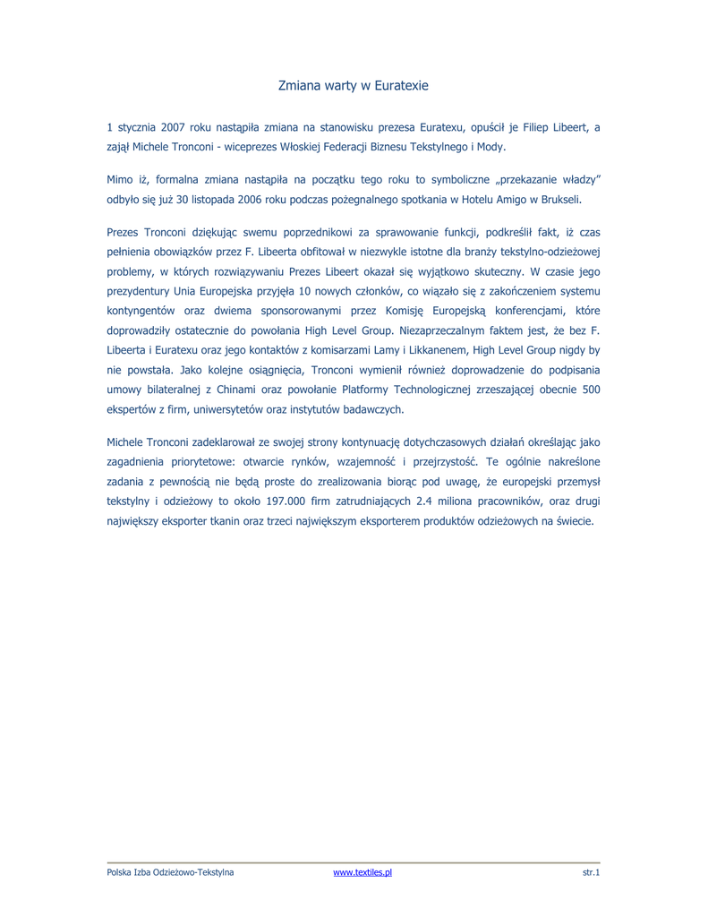 Zmiana warty w Euratexie 1 stycznia 2007 roku nastąpiła zmiana na stanowisku prezesa Euratexu, opuścił je Filiep Libeert, a zajął Michele Tronconi - wiceprezes Włoskiej Federacji Biznesu Tekstylnego i Mody. Mimo iŜ, formalna zmiana nastąpiła na początku tego roku to symboliczne „przekazanie władzy” odbyło się juŜ 30 listopada 2006 roku podczas poŜegnalnego spotkania w Hotelu Amigo w Brukseli. Prezes Tronconi dziękując swemu poprzednikowi za sprawowanie funkcji, podkreślił fakt, iŜ czas pełnienia obowiązków przez F. Libeerta obfitował w niezwykle istotne dla branŜy tekstylno-odzieŜowej problemy, w których rozwiązywaniu Prezes Libeert okazał się wyjątkowo skuteczny. W czasie jego prezydentury Unia Europejska przyjęła 10 nowych członków, co wiązało się z zakończeniem systemu kontyngentów oraz dwiema sponsorowanymi przez Komisję Europejską konferencjami, które doprowadziły ostatecznie do powołania High Level Group. Niezaprzeczalnym faktem jest, Ŝe bez F. Libeerta i Euratexu oraz jego kontaktów z komisarzami Lamy i Likkanenem, High Level Group nigdy by nie powstała. Jako kolejne osiągnięcia, Tronconi wymienił równieŜ doprowadzenie do podpisania umowy bilateralnej z Chinami oraz powołanie Platformy Technologicznej zrzeszającej obecnie 500 ekspertów z firm, uniwersytetów oraz instytutów badawczych. Michele Tronconi zadeklarował ze swojej strony kontynuację dotychczasowych działań określając jako zagadnienia priorytetowe: otwarcie rynków, wzajemność i przejrzystość. Te ogólnie nakreślone zadania z pewnością nie będą proste do zrealizowania biorąc pod uwagę, Ŝe europejski przemysł tekstylny i odzieŜowy to około 197.000 firm zatrudniających 2.4 miliona pracowników, oraz drugi największy eksporter tkanin oraz trzeci największym eksporterem produktów odzieŜowych na świecie. Polska Izba OdzieŜowo-Tekstylna www.textiles.pl str.1