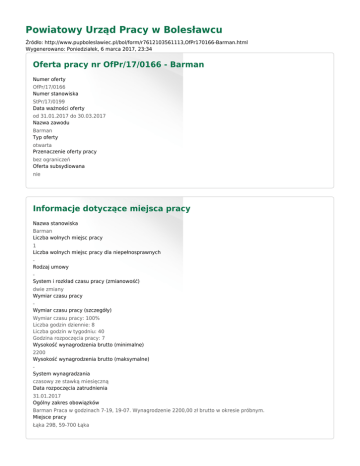 Powiatowy Urząd Pracy w Bolesławcu Źródło: http://www.pupboleslawiec.pl/bol/form/r7612103561113,OfPr170166-Barman.html Wygenerowano: Poniedziałek, 6 marca 2017, 23:34 Oferta pracy nr OfPr/17/0166 - Barman Numer oferty OfPr/17/0166 Numer stanowiska StPr/17/0199 Data ważności oferty od 31.01.2017 do 30.03.2017 Nazwa zawodu Barman Typ oferty otwarta Przenaczenie oferty pracy bez ograniczeń Oferta subsydiowana nie Informacje dotyczące miejsca pracy Nazwa stanowiska Barman Liczba wolnych miejsc pracy 1 Liczba wolnych miejsc pracy dla niepełnosprawnych Rodzaj umowy System i rozkład czasu pracy (zmianowość) dwie zmiany Wymiar czasu pracy Wymiar czasu pracy (szczegóły) Wymiar czasu pracy: 100% Liczba godzin dziennie: 8 Liczba godzin w tygodniu: 40 Godzina rozpoczęcia pracy: 7 Wysokość wynagrodzenia brutto (minimalne) 2200 Wysokość wynagrodzenia brutto (maksymalne) System wynagradzania czasowy ze stawką miesięczną Data rozpoczęcia zatrudnienia 31.01.2017 Ogólny zakres obowiązków Barman Praca w godzinach 7-19, 19-07. Wynagrodzenie 2200,00 zł brutto w okresie próbnym. Miejsce pracy Łąka 29B, 59-700 Łąka Oczekiwania pracodawcy Poziom wykształcenia brak lub niepełne podstawowe Kierunek wyksztalcenia Wymagania Uprawnienia: Książeczka sanitarno epidemiologiczna Inne wymagania: Umiejętność obsługi kasy fiskalnej, doświadczenie mile widziane, książeczka sanitarno epidemiologiczna, osoba mobilna. Pracodawca zapewnia pracownikowi zakwaterowanie Pracodawca ponosi koszty zakwaterowania Pracodawca zapewnia pracownikowi wyżywienie Finasowanie kosztów podróży lub przeprowadzki Aplikowanie Sposób aplikowania na ofertę pracy Bezpośrednio do pracodawcy Język aplikowania polski Wymagane dokumenty Kontakt z pracodawcą telefoniczny w godzinach 8-16, tel: 695-423-060 Pracodawca Firma Transportowa Mirko Spółka Cywilna ul. Kościuszki 51, 59-700 Bolesławiec Osoba kontaktowa: Lucyna Seneszyn Telefon: 695-423-060 Osoba kontaktowa w urzędzie pracy Nizioł-Bąk Beata 757326601 w. 134 Drukuj Generuj PDF Powiadom znajomego Wstecz
