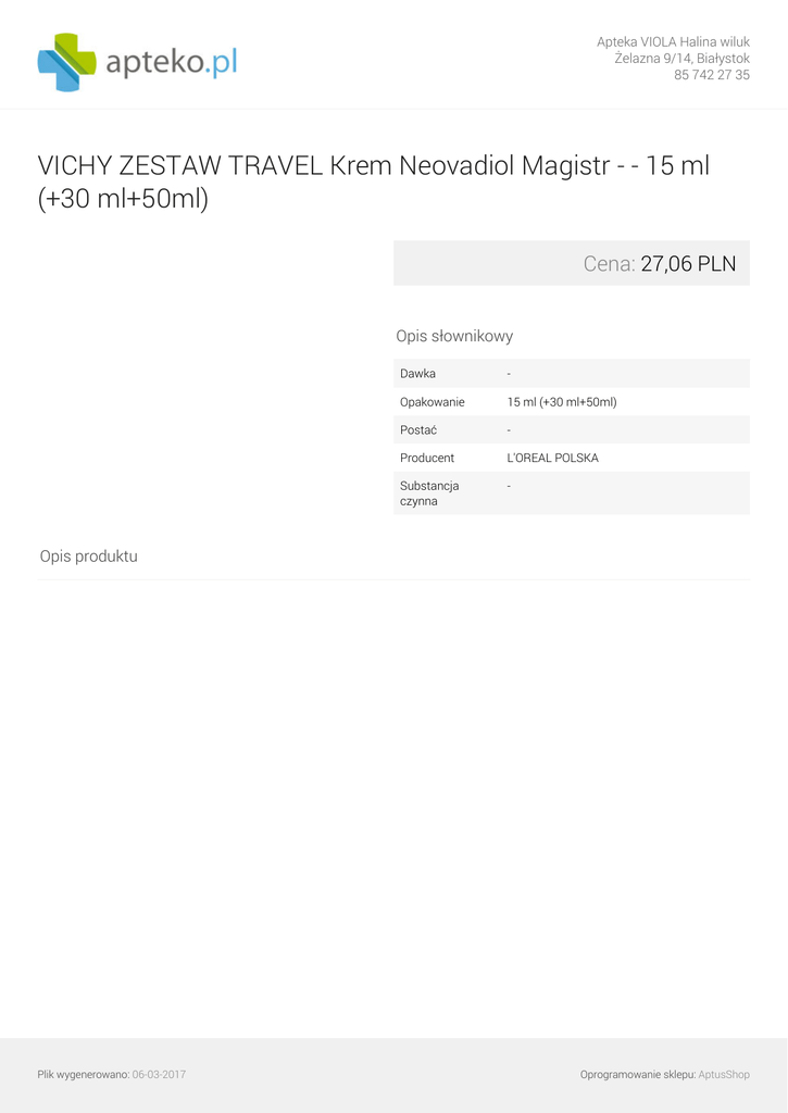 Apteka VIOLA Halina wiluk Żelazna 9/14, Białystok 85 742 27 35 VICHY ZESTAW TRAVEL Krem Neovadiol Magistr - - 15 ml (+30 ml+50ml) Cena: 27,06 PLN Opis słownikowy Dawka - Opakowanie 15 ml (+30 ml+50ml) Postać - Producent L'OREAL POLSKA Substancja czynna - Opis produktu Plik wygenerowano: 06-03-2017 Powered by TCPDF (www.tcpdf.org) Oprogramowanie sklepu: AptusShop