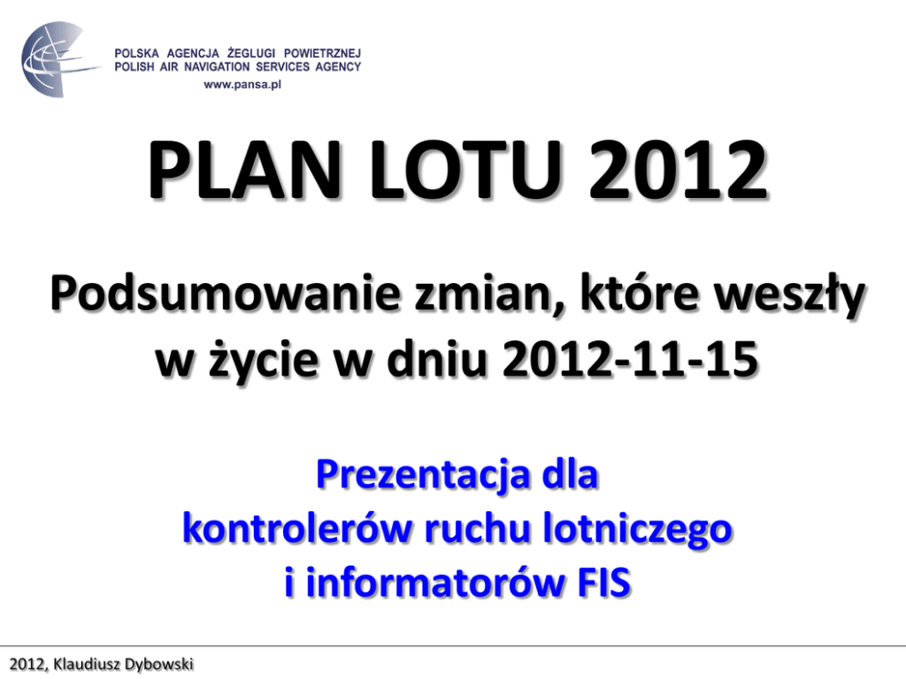PLAN LOTU 2012 Podsumowanie zmian, które weszły w życie w dniu 2012-11-15 Prezentacja dla kontrolerów ruchu lotniczego i informatorów FIS 2012, Klaudiusz Dybowski Wszelkie ewentualne uwagi, pytania i komentarze można kierować bezpośrednio do mnie na adres: Klaudiusz Dybowski tel.: +48 (22) 574-5653 tel.: +48 609-130-018 faks: +48 (22)-574-5639 e-mail: [email protected] 2012, Klaudiusz Dybowski Cel prezentacji: Ogólne zapoznanie ze zmianami, które weszły w życie w dniu 2012-11-15 Niniejsza wersja prezentacji obejmuje zmiany wynikające z wprowadzenia Wytycznych nr 6 Prezesa ULC (polska wersja dokumentu PANS-ATM 4444) oraz aktualizację wyposażenia standardowego obowiązującą od 2013-01-10 2012, Klaudiusz Dybowski W NINIEJSZYM OPRACOWANIU POMINIĘTO POLA PLANU LOTU, W KTÓRYCH ZMIANY NIE ZACHODZĄ LUB SĄ ONE NIEZNACZĄCE RÓŻNICE ZAZNACZONO KOLOREM CZERWONYM 2012, Klaudiusz Dybowski Polskie wydanie PANS-ATM DOSTĘPNE OD 05.11.2012 WYTYCZNE NR 6 PREZESA URZĘDU LOTNICTWA CYWILNEGO z dnia 17 października 2012 r. w sprawie ogłoszenia wymagań ustanowionych przez Organizację Międzynarodowego Lotnictwa Cywilnego (ICAO) – Doc 4444. (Dziennik Urzędowy Prezesa ULC nr 102) 2012, Klaudiusz Dybowski Podstawa prawna wprowadzenia zmian Zmiana nr 1 do PANS – ATM Doc 4444 Obowiązuje od: 2012-11-15 2012, Klaudiusz Dybowski Konsekwencje wprowadzanych zmian obejmą: • Systemy zarządzania ruchem lotniczym oraz interfejsy tych systemów • Systemy planowania lotów • Systemy naliczania opłat trasowych (np. CRCO) • Systemy automatycznej wymiany danych (np. systemy OLDI) • Systemy CFMU i IFPS • Zmianę formatów depesz ATS, OLDI i depesz ADEXP • Frazeologię lotniczą (głównie w zakresie wprowadzenia CPDLC) 2012, Klaudiusz Dybowski Cele wprowadzanych zmian: • Rozdzielenie wyposażenia statku powietrznego od umiejętności / uprawnień załóg statków powietrznych (np. statek powietrzny wyposażony w ILS kategorii IIIc, ale załoga nie ma uprawnień do podejścia w tej kategorii). • Aktualizacja wersji ICAO planu lotu pod kątem potrzeb statków powietrznych o zaawansowanym wyposażeniu oraz stale zmieniających się wymagań automatycznego zarządzania ruchem • Potrzeby związane z wzajemną kompatybilnością istniejących systemów, czynnikami ludzkimi, szkoleniem, kosztami oraz aspektami przejściowymi. 2012, Klaudiusz Dybowski Należy pamiętać, że: • ICAO Doc 4444 obowiązuje na świecie • W Europie obowiązują przepisy ICAO Doc 4444 oraz ICAO Doc 7030 (region EUR). • ICAO Doc 7030 wprowadza do stosowania dokumenty Eurocontrol (IFPS Manual, ATFCM Users Manual itp.), a więc obowiązują zapisy zawarte w tych dokumentach. 2012, Klaudiusz Dybowski Składanie FPL przed odlotem Plan lotu można złożyć na maksymalnie 120 godzin przed przewidywanym czasie odblokowania (EOBT) 2012, Klaudiusz Dybowski Składanie FPL w USA przed odlotem Ponieważ w USA złożenie FPL jest możliwe najwcześniej na 24 godziny przed EOBT, mogą występować problemy z datą zapisaną po wskaźniku DOF/, np. data ta może być nieaktualna. 2012, Klaudiusz Dybowski Obowiązkowe zgłaszanie opóźnień do planu lotu Zgodnie z PL-4444 należy zgłaszać opóźnienia: dla lotu kontrolowanego - przekraczające 30 minut od planowanego EOBT. W regionie EUR – na mocy zapisów ICAO Doc 7030 - obowiązuje zgłaszanie opóźnienia przekraczającego 15 minut dla lotów kontrolowanych 2012, Klaudiusz Dybowski Metody zgłaszania opóźnień do planu lotu Depesza o opóźnieniu (DLA) lub Depesza modyfikacyjna (CHG)* w strefie IFPS lub Depesza unieważniająca stary plan lotu (CNL) i złożenie nowego FPL *w niektórych przypadkach 2012, Klaudiusz Dybowski POLE 8 – Przepisy wykonywania lotu i rodzaj lotu I V Y Z IFR VFR jeżeli lot najpierw będzie wykonywany zgodnie z IFR, po czym nastąpi zmiana lub zmiany przepisów wykonywania lotu jeżeli lot najpierw będzie wykonywany zgodnie z VFR, po czym nastąpi zmiana lub zmiany przepisów wykonywania lotu W punkcie 15 podać miejsce/miejsca, w których jest planowana zmiana. 2012, Klaudiusz Dybowski POLE 8 – Przepisy wykonywania lotu i rodzaj lotu S N G M X rozkładowy nierozkładowy lot lotnictwa ogólnego lot wojskowy* lot innego rodzaju niż zdefiniowane powyżej * Dotychczas w Polsce litera M obejmowała także loty państwowych statków powietrznych. 2012, Klaudiusz Dybowski Zmiany – pole 10 FPL Wyposażenie i możliwości (capabilities) Możliwości obejmują następujące elementy: a) obecność na pokładzie statku powietrznego odpowiedniego, sprawnego wyposażenia, b) wyposażenie i możliwości są zgodne z kwalifikacjami załogi, oraz c) w stosownym przypadku, upoważnienie właściwej władzy. 2012, Klaudiusz Dybowski Pole 10 – nowa tabela Litera A B C D E1 E2 E3 F G H I J1 J2 J3 J4 J5 J6 J7 System Litera System System lądowania GBAS K MLS LPV (APV z SBAS) L ILS LORAN C M1 ATC RTF SATCOM (INMARSAT) DME M2 ATC RTF SATCOM (MTSAT) FMC WPR ACARS M3 ATC RTF SATCOM (Iridium) D-FIS ACARS N Brak wyposażenia PDC ACARS O VOR ADF P1-P9 Zarezerwowane dla RCP GNSS R Zgodny z PBN HF RTF S Wyposażenie standardowe INS T TACAN CPDLC ATN VDL Mode 2 U UHF RTF CPDLC FANS 1/A HFDL V VHF RTF CPDLC FANS 1/A VDL Mode 4 W Zgodny z RVSM CPDLC FANS 1/A VDL Mode 2 X Zgodny z MNPS CPDLC FANS 1/A SATCOM (INMARSAT) Y 8.33 kHz CPDLC FANS 1/A SATCOM (MTSAT) Z Inne wyposażenie lub zdolności CPDLC FANS 1/A SATCOM (IRIDIUM) 2012, Klaudiusz Dybowski Na dalszych slajdach omówiono wszystkie litery i kombinacje liter i cyfr, które będą stosowane w polach 10a (wyposażenie nawigacyjne i łączności) oraz 10b (wyposażenie dozorowania). 2012, Klaudiusz Dybowski A System lądowania GBAS (Ground Based Augmentation System) 2012, Klaudiusz Dybowski B Localizer Performance with Vertical Guidance (LPV). Obejmuje procedury podejścia według wskazań przyrządów z prowadzeniem pionowym (APV - Approach Procedure with Vertical Guidance ) zdefiniowane jako proc