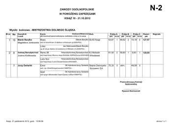 N-2 ZAWODY OGÓLNOPOLSKIE W POWOŻENIU ZAPRZĘGAMI KSIĄŻ 19 - 21.10.2012 Wyniki końcowe - MISTRZOSTWA DOLNEGO ŚLĄSKA M-ce No Zawodnik Luzak Konie Hodowca/Właściciel Klub płeć\rasa\maść\ojciec\matka/ojciec matki\data ur.\kraj ur.\nr paszp. .\Marek Baryłko SLKS Książ Blues Magdalena Jankowska wał.\śl.\kara\Arsen śl.\Baltona m/Historyk sp\2000\POL\. 1 15 Marek Baryłko Lotos Próba A pkt m-ce Próba B pkt m-ce Próba C Razem pkt m-ce pkt 53,67 1 58,82 2 15,18 2 127,67 61,00 2 58,60 1 9,00 1 128,60 75,33 3 elim. 48,09 3 Nagroda Jan Malinowski\Marek Baryłko og.\śl.\sk.gn.\Epikur śl.\Lewkonia śl./Wibrator śl.\2005\POL\. 2 8 Holandia\Andrzej Benedykciński KJ Michelin Andrzej Benedykciński Remo 98 Joanna Kretkowska wał.\kwpn\kasz.\Renovo kwpn\Kothilde KWPN/Donau\2000\NED\. Włocławek Larix Son Holandia\Andrzej Benedykciński wał.\kwpn\kasz.\Larix\Olanda/Gaston\2002\NED\. 7 Jerzy Świteńki Emer SK Kalników\Jerzy Świteńki Stajnia Dworzysko wał.\.\gn.\Grek\Emisja/Leandro\1999\POL\. Opel Szczawno Zdr. SK Kalników\Jerzy Świteńki wał.\sp\gn.\Montevideo kwpn\Opawa m/Elan\1999\POL\. Przewodniczący Komisji Sędziowskiej ............................ Ryszard Bartmański Książ 21 październik 2012, godz. 13:06:58 strona 1 z 1 L-1 ZAWODY OGÓLNOPOLSKIE W POWOŻENIU ZAPRZĘGAMI KSIĄŻ 19 - 21.10.2012 Wyniki końcowe - ZAWODY KRAJOWE M-ce 1 No Zawodnik 3 Konie Hodowca/Właściciel Klub Luzak płeć\rasa\maść\ojciec\matka/ojciec matki\data ur.\kraj ur.\nr paszp. Bartłomiej Kwiatek Lawenda SO Sieraków\SO Książ SLKS Książ Próba A pkt m-ce Próba B pkt m-ce Próba C Razem pkt m-ce pkt 61,00 1 29,37 1 0,00 1 90,37 76,33 3 47,16 3 13,41 4 136,90 85,00 4 46,63 2 10,10 3 141,73 73,00 2 elim. 6,08 2 Nagroda Robert Kudlik / Kamil Jastrzębski kl.\śl.\c.gn.\Arabetto śl\Lokana śl/Glockner old.\2008\POL\. 2 12 Andrzej Lange 3 5 6 Werset Andrzej Lange\Andrzej Lange SKJ Siwek Siedlec Sylwia Mendyka og.\sp\gn.\Endos sp\Wejmutka m/Despota m\2003\POL\. Marek Hałas Barbara Hałas kl.\śl.\sk.gn.\Tramer śl\Alma śl/Abdul śl\2008\POL\. Almira Trzebnicki Katarzyna Michalak\Barbara HałasSLKS Książ SK Strzegom-Żółkiewka\Aleksandra Apanasewicz JKS Jaroszówka Wiesław Apanasewicz Barbarossa kl.\śl.\sk.gn.\Purist xx\Barbórka śl/Liton śl.\2004\POL\. Joanna Jurkowska Przewodniczący Komisji Sędziowskiej ............................ Ryszard Bartmański Książ 21 październik 2012, godz. 13:15:29 strona 1 z 1 L-1 ZAWODY OGÓLNOPOLSKIE W POWOŻENIU ZAPRZĘGAMI KSIĄŻ 19 - 21.10.2012 Wyniki końcowe - AMATORZY M-ce No Zawodnik Luzak 1 1 Konie Hodowca/Właściciel Klub płeć\rasa\maść\ojciec\matka/ojciec matki\data ur.\kraj ur.\nr paszp. Jarosław Kalinowski Laki wał.\.\.\.\.\.\.\. Agata Kalinowska Próba A pkt m-ce .\. Bez Przynależności 70,33 1 Próba B pkt m-ce 41,99 1 Próba C Razem pkt m-ce pkt 0,00 1 Nagroda 112,32 Klubowej Przewodniczący Komisji Sędziowskiej ............................ Ryszard Bartmański Książ 21 październik 2012, godz. 13:16:50 strona 1 z 1 N-1 ZAWODY OGÓLNOPOLSKIE W POWOŻENIU ZAPRZĘGAMI KSIĄŻ 19 - 21.10.2012 Wyniki końcowe - MISTRZOSTWA DOLNEGO ŚLĄSKA M-ce No Zawodnik Luzak 1 11 Andrzej Lange Sylwia Mendyka 2 14 Rafał Woźniak Tomasz Stelmach 3 17 Marek Hałas Barbara Hałas 4 18 Małgorzata Skupień Hodowca/Właściciel Klub Konie płeć\rasa\maść\ojciec\matka/ojciec matki\data ur.\kraj ur.\nr paszp. Bogacz SK Strzelce Opolskie\Justyna Kubik SKJ Siwek Siedlec 2 62,70 2 13,35 2 127,72 Holandia\. Bez Przynależności 61,00 3 65,04 3 13,78 3 139,82 76,67 4 56,62 1 14,97 5 148,26 50,00 1 221,64 5 3,00 1 274,64 72,94 4 14,12 4 Nagroda Klubowej nieznany\Marek Hałas SLKS Książ kl.\kuc\kasz.\NN\NN/NN\1999\POL\. Rafael Holandia\Pensjonat Litworówka St. Agro-Aves wał.\kwpn\kara\Majesteit kwpn\Jessica kwpn/Farao\1998\NED\. 16 Bartosz Nogacz Próba C Razem pkt m-ce pkt Trzebnicki og.\fryz\kara\Doaitsen 420\Reke Z/Oege\2006\NED\. Malaga Próba B pkt m-ce 51,67 wał.\śl.\gn.\Lansjer śl.\Buczyna śl./Glockner old.\1992\POL\. Teie Fan It Hiem Próba A pkt m-ce Wikt .\.\.\.\.\.\.\. Gajewniki .\. Bez Przynależności elim. Klubowej Przewodniczący Komisji Sędziowskiej ............................ Ryszard Bartmański Książ 21 październik 2012, godz. 13:20:42 strona 1 z 1 N-1 ZAWODY OGÓLNOPOLSKIE W POWOŻENIU ZAPRZĘGAMI KSIĄŻ 19 - 21.10.2012 Wyniki końcowe - ZAWODY KRAJOWE M-ce 1 No Zawodnik 9 2 10 Konie Hodowca/Właściciel Klub Luzak płeć\rasa\maść\ojciec\matka/ojciec matki\data ur.\kraj ur.\nr paszp. Bartłomiej Kwiatek Robert Kudlik og.\śl.\c.gn.\Turkus śl\Berenika śl/Mundial\2005\POL\. Bergen SO Książ\SO Książ SLKS Książ Monika Święcicka J (1995) Bassareus Małgorzata Michoń wał.\sp\kara\Nomen śl\Baltona m/Historyk m\2006\POL\. Jarosław Święcicki\Jarosław Święcicki Próba A pkt m-ce Próba B pkt m-ce Próba C Razem pkt m-ce pkt 42,93 1 42,70 1 0,00 1 85,63 Bez Przynależności 48,53 Klubowej 2 47,12 2 6,00 2 101,65 Nagroda Przewodniczący Komisji Sędziowskiej ............................ Ryszard Bartmański Książ 21 październik 2012, godz. 13:28:10 strona 1 z 1