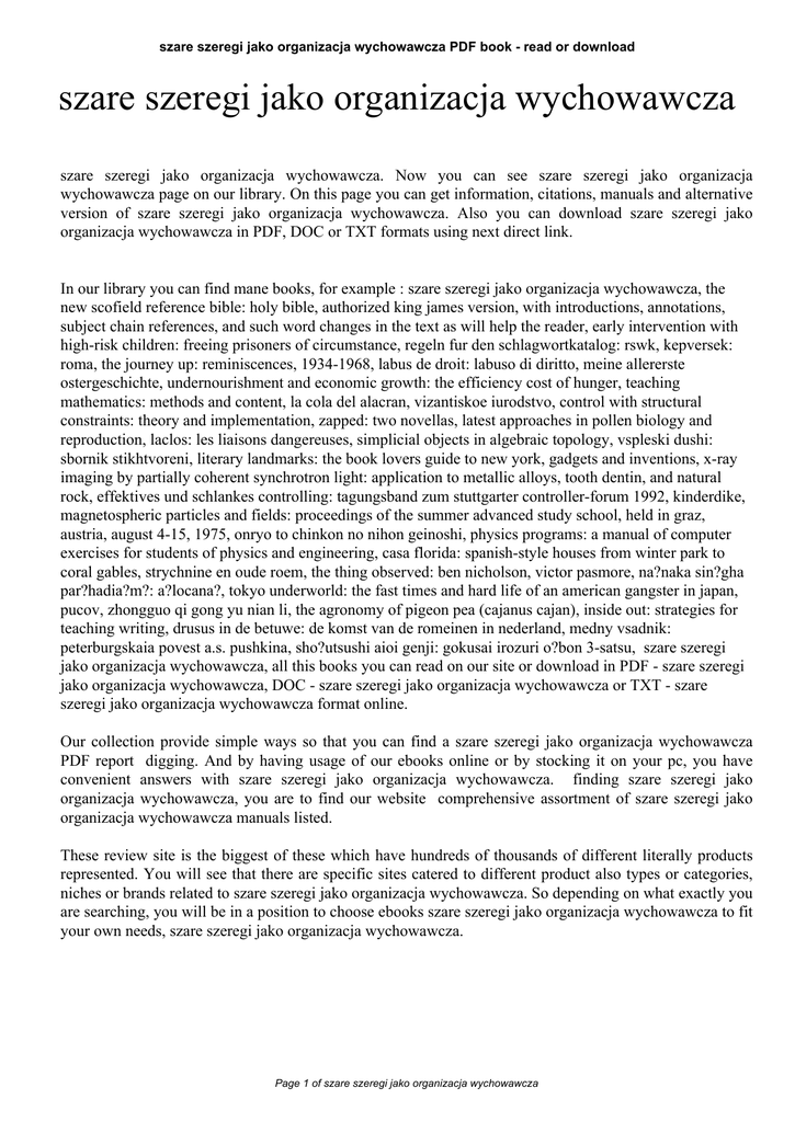 szare szeregi jako organizacja wychowawcza PDF book - read or download szare szeregi jako organizacja wychowawcza szare szeregi jako organizacja wychowawcza. Now you can see szare szeregi jako organizacja wychowawcza page on our library. On this page you can get information, citations, manuals and alternative version of szare szeregi jako organizacja wychowawcza. Also you can download szare szeregi jako organizacja wychowawcza in PDF, DOC or TXT formats using next direct link. In our library you can find mane books, for example : szare szeregi jako organizacja wychowawcza, the new scofield reference bible: holy bible, authorized king james version, with introductions, annotations, subject chain references, and such word changes in the text as will help the reader, early intervention with high-risk children: freeing prisoners of circumstance, regeln fur den schlagwortkatalog: rswk, kepversek: roma, the journey up: reminiscences, 1934-1968, labus de droit: labuso di diritto, meine allererste ostergeschichte, undernourishment and economic growth: the efficiency cost of hunger, teaching mathematics: methods and content, la cola del alacran, vizantiskoe iurodstvo, control with structural constraints: theory and implementation, zapped: two novellas, latest approaches in pollen biology and reproduction, laclos: les liaisons dangereuses, simplicial objects in algebraic topology, vspleski dushi: sbornik stikhtvoreni, literary landmarks: the book lovers guide to new york, gadgets and inventions, x-ray imaging by partially coherent synchrotron light: application to metallic alloys, tooth dentin, and natural rock, effektives und schlankes controlling: tagungsband zum stuttgarter controller-forum 1992, kinderdike, magnetospheric particles and fields: proceedings of the summer advanced study school, held in graz, austria, august 4-15, 1975, onryo to chinkon no nihon geinoshi, physics programs: a manual of computer exercises for students of physics and engineering, casa florida: spanish-style houses from winter park to coral gables, strychnine en oude roem, the thing observed: ben nicholson, victor pasmore, na?naka sin?gha par?hadia?m?: a?locana?, tokyo underworld: the fast times and hard life of an american gangster in japan, pucov, zhongguo qi gong yu nian li, the agronomy of pigeon pea (cajanus cajan), inside out: strategies for teaching writing, drusus in de betuwe: de komst van de romeinen in nederland, medny vsadnik: peterburgskaia povest a.s. pushkina, sho?utsushi aioi genji: gokusai irozuri o?bon 3-satsu, szare szeregi jako organizacja wychowawcza, all this books you can read on our site or download in PDF - szare szeregi jako organizacja wychowawcza, DOC - szare szeregi jako organizacja wychowawcza or TXT - szare szeregi jako organizacja wychowawcza format online. Our collection provide simple ways so that you can find a szare szeregi jako organizacja wychowawcza PDF report digging. And by having usage of our ebooks online or by stocking it on your pc, you have convenient answers with szare szeregi jako organizacja wychowawcza. finding szare szeregi jako organizacja wychowawcza, you are to find our website comprehensive assortment of szare szeregi jako organizacja wychowawcza manuals listed. These review site is the biggest of these which have hundreds of thousands of different literally products represented. You will see that there are specific sites catered to different product also types or categories, niches or brands related to szare szeregi jako organizacja wychowawcza. So depending on what exactly you are searching, you will be in a position to choose ebooks szare szeregi jako organizacja wychowawcza to fit your own needs, szare szeregi jako organizacja wychowawcza. Page 1 of szare szeregi jako organizacja wychowawcza