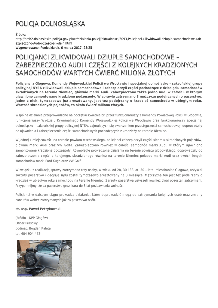 POLICJA DOLNOŚLĄSKA Źródło: http://arch2.dolnoslaska.policja.gov.pl/wr/dzialania-policji/aktualnosci/3093,Policjanci-zlikwidowali-dziuple-samochodowe-zab ezpieczono-Audi-i-czesci-z-kolejn.html Wygenerowano: Poniedziałek, 6 marca 2017, 23:25 POLICJANCI ZLIKWIDOWALI DZIUPLE SAMOCHODOWE – ZABEZPIECZONO AUDI I CZĘŚCI Z KOLEJNYCH KRADZIONYCH SAMOCHODÓW WARTYCH ĆWIERĆ MILIONA ZŁOTYCH Policjanci z Głogowa, Komendy Wojewódzkiej Policji we Wrocławiu i specjalnej dolnośląsko – saksońskiej grupy policyjnej NYSA zlikwidowali dziuple samochodowe i zabezpieczyli części pochodzące z dziesięciu samochodów skradzionych na terenie Niemiec, głównie marki Audi. Zabezpieczono także jedno Audi w całości, w którym ujawniono zamontowane kradzione podzespoły. W sprawie zatrzymano 3 mężczyzn podejrzanych o paserstwo. Jeden z nich, tymczasowo już aresztowany, jest też podejrzany o kradzież samochodu w ubiegłym roku. Wartość skradzionych pojazdów, to około ćwierć miliona złotych. Wspólne działania przeprowadzone na początku kwietnia br. przez funkcjonariuszy z Komendy Powiatowej Policji w Głogowie, funkcjonariuszy Wydziału Kryminalnego Komendy Wojewódzkiej Policji we Wrocławiu oraz funkcjonariuszy specjalnej dolnośląsko – saksońskiej grupy policyjnej NYSA, zajmujących się zwalczaniem przestępczości samochodowej, doprowadziły do ujawnienia i zabezpieczenia części samochodowych pochodzących z kradzieży na terenie Niemiec. W jednej z miejscowości na terenie powiatu wschowskiego, policjanci zabezpieczyli części siedmiu skradzionych pojazdów, głównie marki Audi oraz VW Golfa. Zabezpieczono również w całości samochód marki Audi, w którym ujawniono zamontowane kradzione podzespoły. Równolegle prowadzone działania na terenie powiatu głogowskiego, doprowadziły do zabezpieczenia części z kolejnego, skradzionego również na terenie Niemiec pojazdu marki Audi oraz dwóch innych samochodów marki Ford Kuga oraz VW Golf. W związku z realizacją sprawy zatrzymano trzy osoby, w wieku od 28, 30 i 38 lat. 30 – letni mieszkaniec Głogowa, usłyszał zarzuty paserstwa i decyzją sądu został tymczasowo aresztowany na 3 miesiące. Mężczyzna ten jest też podejrzany o kradzież w ubiegłym roku samochodu na terenie Niemiec. Zarzuty paserstwa usłyszeli również dwaj pozostali zatrzymani. Przypomnijmy, że za paserstwo grozi kara do 5 lat pozbawienia wolności. Policjanci w dalszym ciągu prowadzą działania, które doprowadzić mogą do zatrzymania kolejnych osób oraz zmiany zarzutów wobec zatrzymanych już za paserstwo osób. st. asp. Paweł Petrykowski (źródło – KPP Głogów) Oficer Prasowy podinsp. Bogdan Kaleta tel. 604-904-452 Zainstaluj wtyczkę Flash, aby zobaczyć odtwarzacz. pobierz film - 12.67 MB Ocena: 5/5 (2) Tweetnij