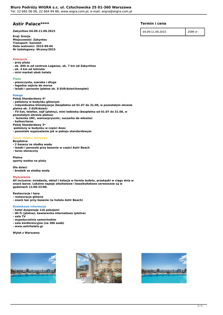Biuro Podróży WIGRA s.c. ul. Człuchowska 25 01-360 Warszawa Tel. 22 665 06 06, 22 664 94 86, www.wigra.com.pl, e-mail: [email protected] Astir Palace**** Zakynthos 04.09-11.09.2015 Termin i cena 04.09-11.09.2015 2599 zł Kraj: Grecja Miejscowość: Zakyntos Transport: Samolot Data ważności: 2015-09-04 Nr katalogowy: Wczasy/2015 Położenie - przy plaży - ok. 800 m od centrum Laganas, ok. 7 km od Zakynthos - ok. 4 km od lotniska - mini market obok hotelu Plaża - piaszczysta, szeroka i długa - łagodne zejście do morza - leżaki i parasole (płatne ok. 8 EUR/dzień/komplet) Pokoje Pokój Standardowy 4* - położony w budynku głównym - indywidualna klimatyzacja (bezpłatna od 01.07 do 31.08, w pozostałym okresie płatna ok. 3 EUR/dzień) - TV-Sat, telefon, sejf (płatny), mini lodówka (bezpłatna od 01.07 do 31.08, w pozostałym okresie płatna) - łazienka (WC, wanna/prysznic, suszarka do włosów) - balkon/taras Pokój Standardowy 3* -położony w budynku w części Anex - pozostałe wyposażenie jak w pokoju standardowym Sport, relaks, rozrywka Bezpłatne - 2 baseny ze słodką wodą - leżaki i parasole przy basenie w części Astir Beach - taras słoneczny Płatne sporty wodne na plaży Dla dzieci - brodzik ze słodką wodą Wyżywienie All inclusive: śniadanie, obiad i kolacja w formie bufetu, przekąski w ciągu dnia w snack barze. Lokalne napoje alkoholowe i bezalkoholowe serwowane są w godzinach 11:00-23:00. Restauracje i bary - restauracja główna - snack bar przy basenie (w hotelu Astir Beach) Dodatkowe informacje - hotel dysponuje 116 pokojami - Wi Fi (płatne), kawiarenka internetowa (płatna) - sala TV - wypożyczalnia samochodów - sala konferencyjna (na 300 osób) - www.astirhotels.gr Wylot z Warszawy 1/1 Powered by TCPDF (www.tcpdf.org)
