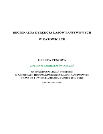 Załącznik nr 7 do Zarządzenia nr … Dyrektora RDLP w Katowicach z dn. ….02.2016 r. REGIONALNA DYREKCJA LASÓW PAŃSTWOWYCH W KATOWICACH OFERTA CENOWA Z PEŁNYM ZAKRESEM ŚWIADCZEŃ NA SPRZEDAŻ POLOWAŃ I TROFEÓW W OŚRODKACH HODOWLI ZWIERZYNY LASÓW PAŃSTWOWYCH WAŻNA OD 1 KWIETNIA 2016 DO 31 MARCA 2017 ROKU /CENY BRUTTO W PLN/ SPIS TREŚCI I. ŚWIADCZENIA POBYTOWE STR. 2 II. USŁUGI TURYSTYCZNE – ORGANIZACJA POLOWAŃ STR. 2 III. ZWIERZYNA – TROFEA STR. 4 IV. OPUSTY I RABATY STR. 10 V. ŚWIADCZENIA DODATKOWE STR. 10 VI. UWAGI STR. 10 1 I. ŚWIADCZENIA POBYTOWE 1. Pobyt myśliwego lub osoby towarzyszącej /PKWiU 55/ VAT 8% Cenę ustala zarządca OHZ LP. II. USŁUGI TURYSTYCZNE – ORGANIZACJA POLOWAŃ 1. Ceny za organizację polowania /PKWiU 01.70.10.0/ VAT 23%: 1.1 Organizacja polowania indywidualnego Opłata obejmuje: - dwa wyjścia w teren trwające do 4 godzin każde; - zapewnienie 1 podprowadzającego dla każdego myśliwego; - transport tuszy pozyskanej zwierzyny; - koszty opracowania dokumentacji. Cena wynosi od każdego myśliwego dziennie: na ptactwo, drapieżniki, dzikie króliki i piżmaki - 44,00 na pozostałą zwierzynę - 150,00 1.2 Organizacja polowania zbiorowego Opłata obejmuje: - przygotowania łowiska; - niezbędną liczbę naganiaczy oraz psów; - transport podczas polowania na terenie zarządzanym przez Nadleśnictwo organizujące polowanie; - posiłek w lesie; - pokot zwierzyny po polowaniu; - koszty opracowania dokumentacji. Cena wynosi od każdego myśliwego dziennie: 1.2.1 polowanie na zwierzynę grubą dla grup do 14 myśliwych - 600,00 dla grup od 15 myśliwych - 480,00 1.2.2 polowanie na zwierzynę drobną (bażanty, dzikie kaczki, zające, inne) - 33,00 1.2.3 polowanie zbiorowe dla myśliwych krajowych w OHZ LP może odbywać się wyłącznie za zgodą Dyrektora RDLP. 2 2. Kwoty doliczane do organizacji polowania /PKWiU 01.70.10.0/ VAT 23%: 2.1 Za postrzelenie jelenia szlachetnego: jeleń byk jeleń łania, jeleń cielę - 423,00 130,00 - 450,00 130,00 - 423,00 130,00 - 212,00 90,00 - 90,00 2.2 Za postrzelenie jelenia sika: Jeleń sika byk jeleń sika łania lub cielę 2.3 Za postrzelenie daniela: daniel byk daniel łania lub cielę 2.4 Za postrzelenie sarny: sarna rogacz sarna koza lub koźlę 2.5 Za postrzelenie dzika: dzik (odyniec, warchlak, przelatek, wycinek, locha) 3. Sprzedaż pakietowa i ryczałtowa polowań Za zgodą Dyrektora RDLP - warunki uzgadniane będą indywidualnie i potwierdzone umową pomiędzy zarządcą OHZ LP a nabywcą polowania. 3 II. ZWIERZYNA – TROFEA 1 1. JELEŃ 1.1 Cena za pozyskane trofeum /PKWiU 10.11.60.0/ VAT 23%: 1.1.1 JELEŃ BYK Okres polowań na jelenia szlachetnego - od 21 sierpnia 2016 r. do końca lutego 2017 r. Trofeum - wieniec i grandle Cena za trofeum wg wagi wieńca wraz z czaszką, kością nosową i potyliczną oraz górną szczęką: do 2,00 kg (w tym szpicak) od 2,01 kg do 2,49 kg od 2,50 kg do 2,99 kg od 3,00 kg do 3,49 kg od 3,50 kg do 3,99 kg od 4,00 kg do 4,49 kg od 4,50 kg do 4,99 kg od 5,00 kg do 5,99 kg od 6,00 kg do 6,99 kg od 7,00 kg do 7,99 kg od 8,00 kg - 291,00 436,00 690,00 1 065,00 1 558,00 1 788,00 2 042,00 2 176,00 2 876,00 4 326,00 5 826,00 + 7,00 za każdy 0,01 kg powyżej 5 kg + 14,50 za każdy 0,01 kg powyżej 6 kg + 15,00 za każdy 0,01 kg powyżej 7 kg + 16,50 za każdy 0,01 kg powyżej 8 kg Kwota za trofeum zostanie powiększona o 50% w przypadku dokonania na polowaniu zbiorowym odstrzału nagannego jelenia byka (2 punkty czerwone wg kryteriów oceny prawidłowości odstrzału PZŁ). 1.1.2 JELEŃ ŁANIA Okres polowań - od 1 października 2016 r. do 15 stycznia 2017 r. Cena za trofeum - grandle, rapcie 31,00 1.1.3 JELEŃ CIELĘ Okres polowań – od 1 października 2016 r. do końca lutego 2017 r. Cena za trofeum - grandle, rapcie 31,00 1 Cena za trofeum zawiera koszty przygotowania trofeum do preparowania, koszty preparacji i przechowania oraz koszty wydania certyfikatu o miejscu pozyskania trofeum, jego wadze i wstępnej wycenie według formuły CIC. Certyfikat wydawany jest obligatoryjnie dla trofeów, które w trakcie wyceny wstępnej zakwalifikowane zostały jako trofea medalowe. W przypadku trofeów nie spełniających tych kryteriów, certyfikat może być wydany na prośbę myśliwego. 4 2. JELEŃ SIKA 2.1 Cena za pozyskane trofeum /PKWiU 10.11.60.0/ VAT 23%: 2.1.1 JELEŃ SIKA BYK Okres polowań - od 1 października 2016 r. do 15 stycznia 2017 r. Trofeum - poroże Cena za trofeum wg wagi wieńca wraz z czaszką, kością nosową i potyliczną oraz górną szczęką: do 1,49 kg (w tym szpicak) od 1,50 kg do 2,49 kg - od 2,50 kg - do 2,99 kg od 3,00 kg 465,00 816,00 + 4,00 za każde 0,01 kg powyżej 1,50 kg 1 216,00 + 6,50 za każde 0,01 kg powyżej 2,50 kg 1 541,00 + 8,00 za każde 0,01 kg powyżej 3,00 kg - 2.1.2 JELEŃ SIKA ŁANIA lub CIELĘ Okres polowań - od 1 października 2016 r. do 15 stycznia 2017 r. Cena za trofeum - grandle, rapcie 46,00 5 3. DANIEL 3.1 Cena za pozyskane trofeum /PKWiU 10.11.60.0/ VAT 23%: 3.1.1 DANIEL BYK Okres polowań - od 1 października 2016 r. do 31 stycznia 2017 r. Trofeum - poroże Cena za trofeum wg wagi łopat wraz z czaszką, kością nosową i potyliczną oraz górną szczęką: do 1,49 kg (w tym szpicak) od 1,50 kg do 2,49 kg - od 2,50 kg - do 2,99 kg od 3,00 kg 415,00 738,00 + 3,00 za każde 0,01 kg powyżej 1,50 kg 1 038,00 + 5,50 za każde 0,01 kg powyżej 2,50 kg 1 313,00 + 7,00 za każde 0,01 kg powyżej 3,00 kg - 3.1.2 DANIEL ŁANIA lub CIELĘ Okres polowań - od 1 października 2016 r. do 15 stycznia 2017 r. Cena za trofeum - grandle, rapcie: - 41,00 6 4. SARNA 4.1 Cena za pozyskane trofeum /PKWiU 10.11.60.0/ VAT 23%: 4.1.1 SARNA ROGACZ Okres polowań - od 11 maja 2016 r. do 30 września 2016 r. Trofeum - parostki Cena za trofeum wg wagi parostków wraz z czaszką, kością nosową i potyliczną oraz górną szczęką - po odjęciu 90 g do 149 g (w tym szpicak i guzikarz) 146,00 od 150 g do 199 g 219,00 od 200 g do 299 g